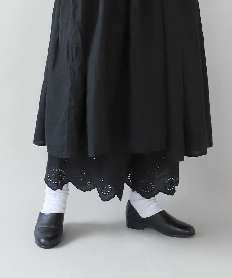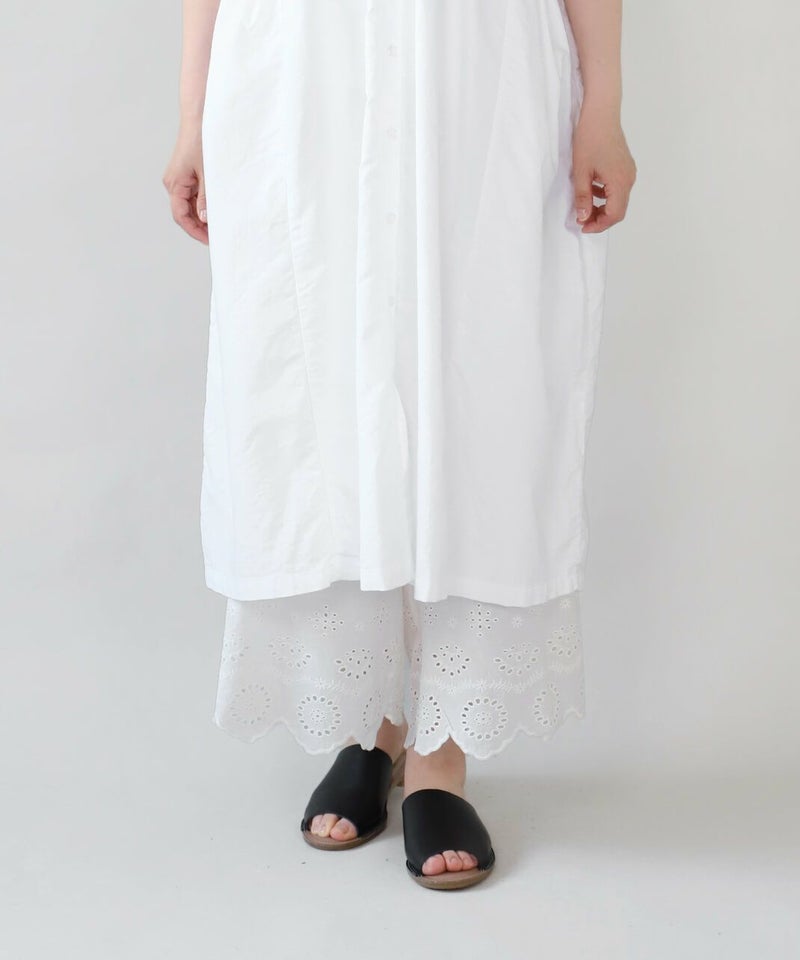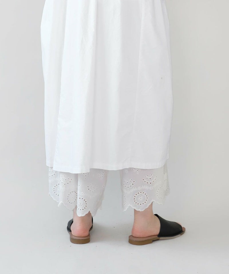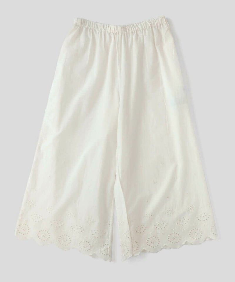 薄手のコットン生地を使用したペチパンツです。 全体的にゆったりとしたサイズ感で、解放感のある履き心地。スカートやワンピースを履く際、生地が足にまとわりつくのを軽減します。また、インナーの透け防止にも効果的。裾にはスカラップ刺繍が施されており、可愛らしいデザインです。