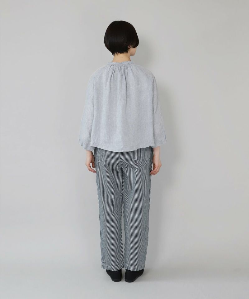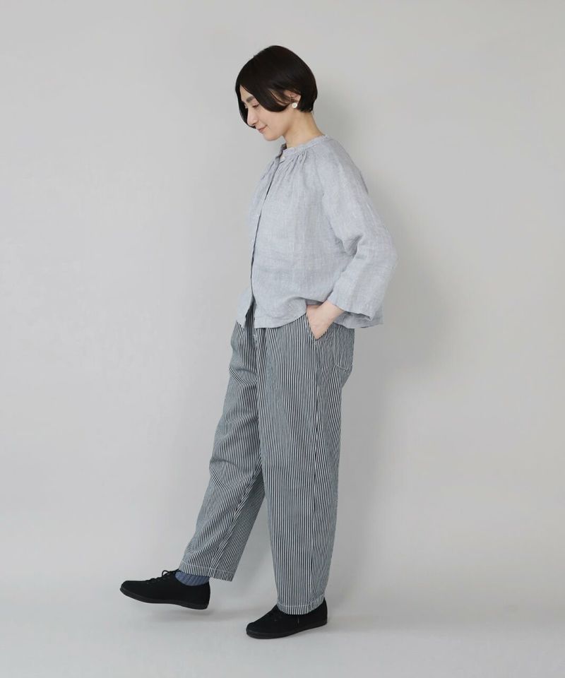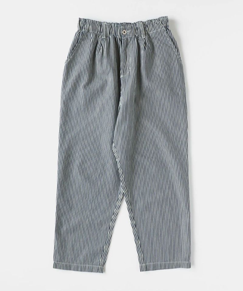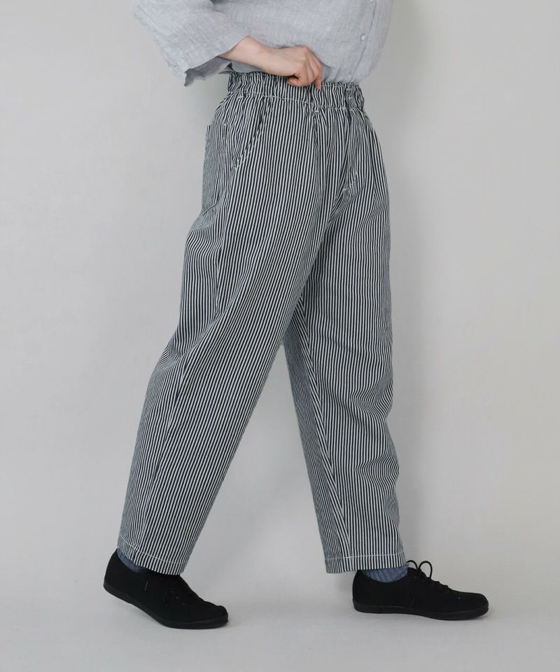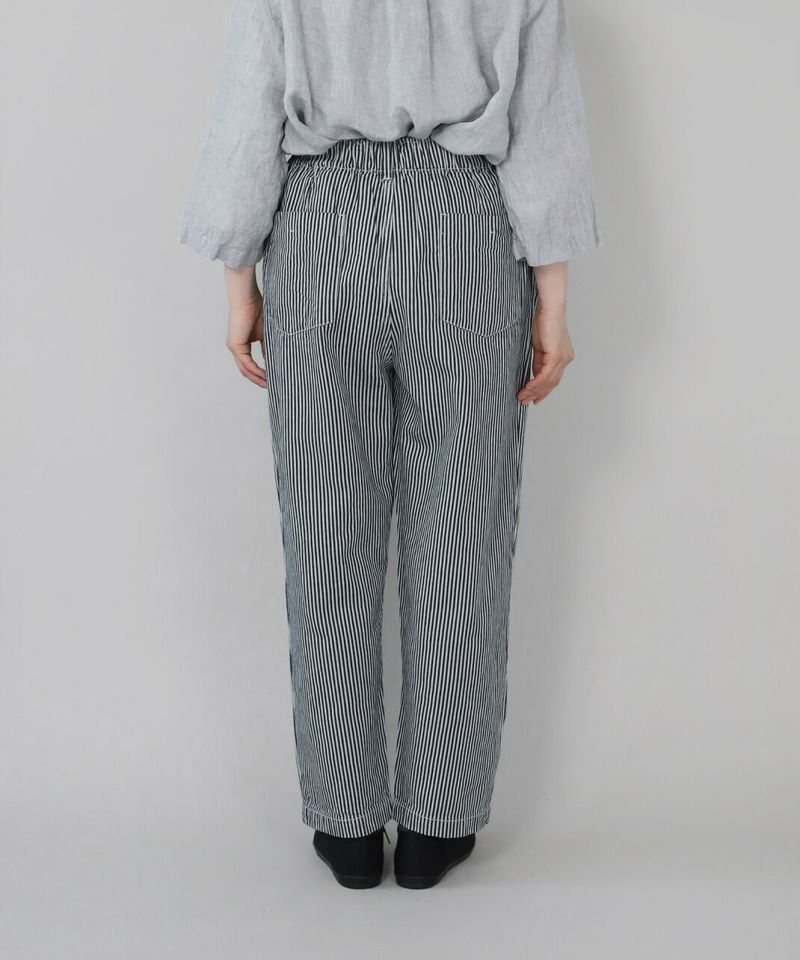 7ozリネン混スラブデニムのテーパードパンツです。 定番のインディゴと春に人気のヒッコリーストライプの2色展開。 ウエストは前開きでしっかりとした見た目ながら、ゴム仕様でもありリラックスした着心地。ベルトループもついているためサイズ調整も可能。リネンミックスはカジュアルさとほのかなナチュラルな雰囲気も演出してくれます。 コーディネートに取り入れやすく、重宝する1着です。