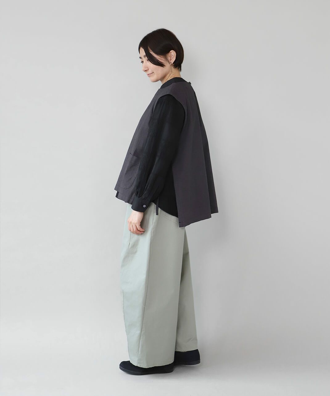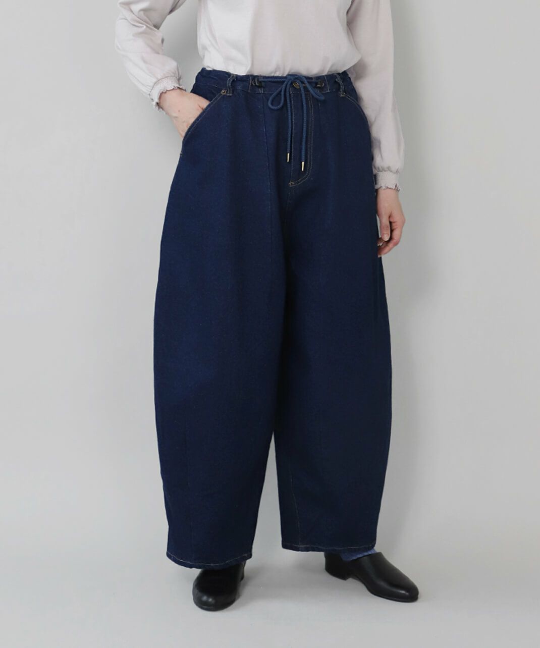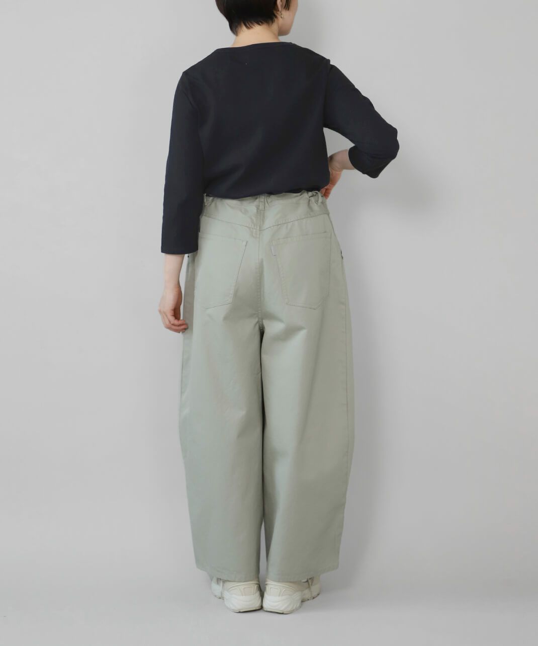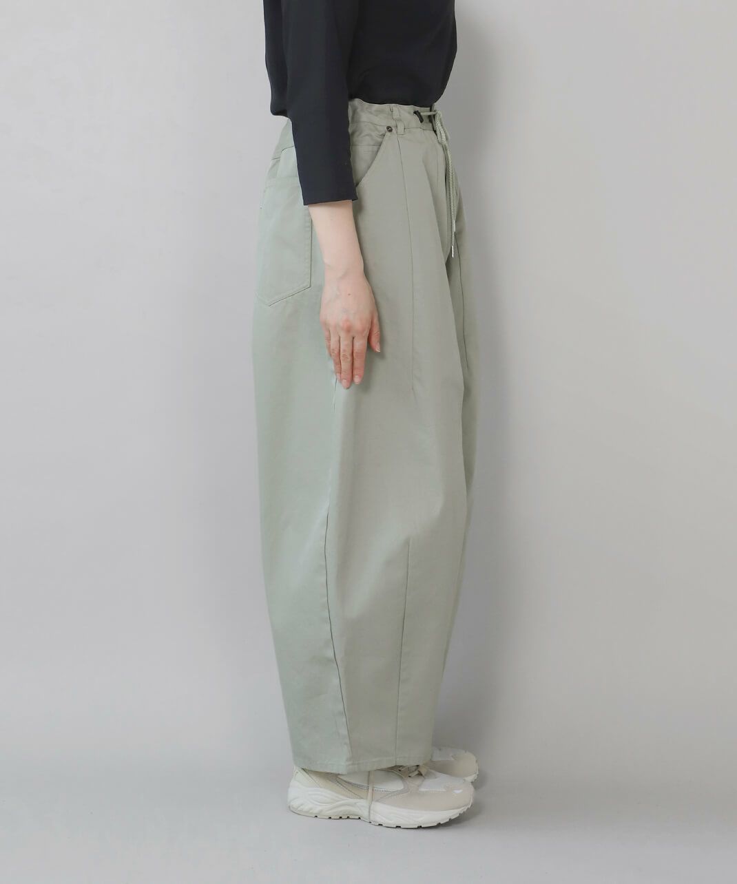 立体的なバルーンシルエットがきれいなタックパンツです。 ウエストのドロストコードでフィット感を調整することができ、スタイリッシュなデザインに。シルエットをキープするやや厚みが感じられるしっかりとした丈夫な素材を使用し、裾のダーツが身体のラインを拾いにくいバルーンシルエットのデザインになっています。デイリー使いに重宝する1着です。