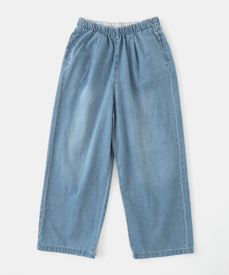 7.8オンスの甘織りソフトデニムを使用したワイドテーパードパンツです。 甘織りにすることで通常のデニムよりも柔らかくしなやかな生地に仕上げ、快適な着心地にこだわった1着です。ウエストは柔らかめのゴム仕様で内紐付き。1本タックが入ったワイドテーパードシルエットは、身体のラインを拾いにくくトレンド感のあるスタイルに。程よい色落ち加工がラフでカジュアルな印象を演出してくれます。