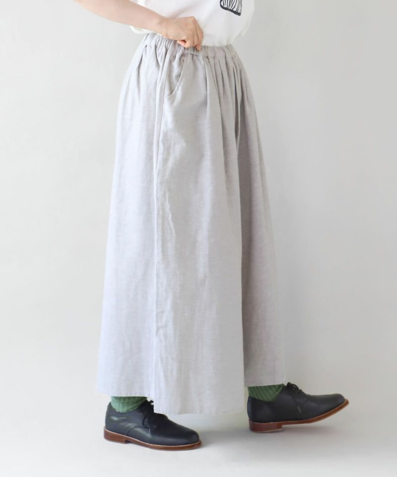 程よい厚みのコットンリネンを使用したタックワイドパンツです。 ふんわり広がるシルエットで肌に張り付きにくく、さらりとした履き心地。前後にタックを施し、ボリュームがあるのにヒップ周りをすっきりと見せてくれます。ウエストはぐるりとゴム仕様で内紐付きのためサイズ調整が可能です。 カットソーやTシャツ、ブラウスなどどんなアイテムとも相性が良い1着です。 グレーのみ、ひざ丈の裏地付きです。