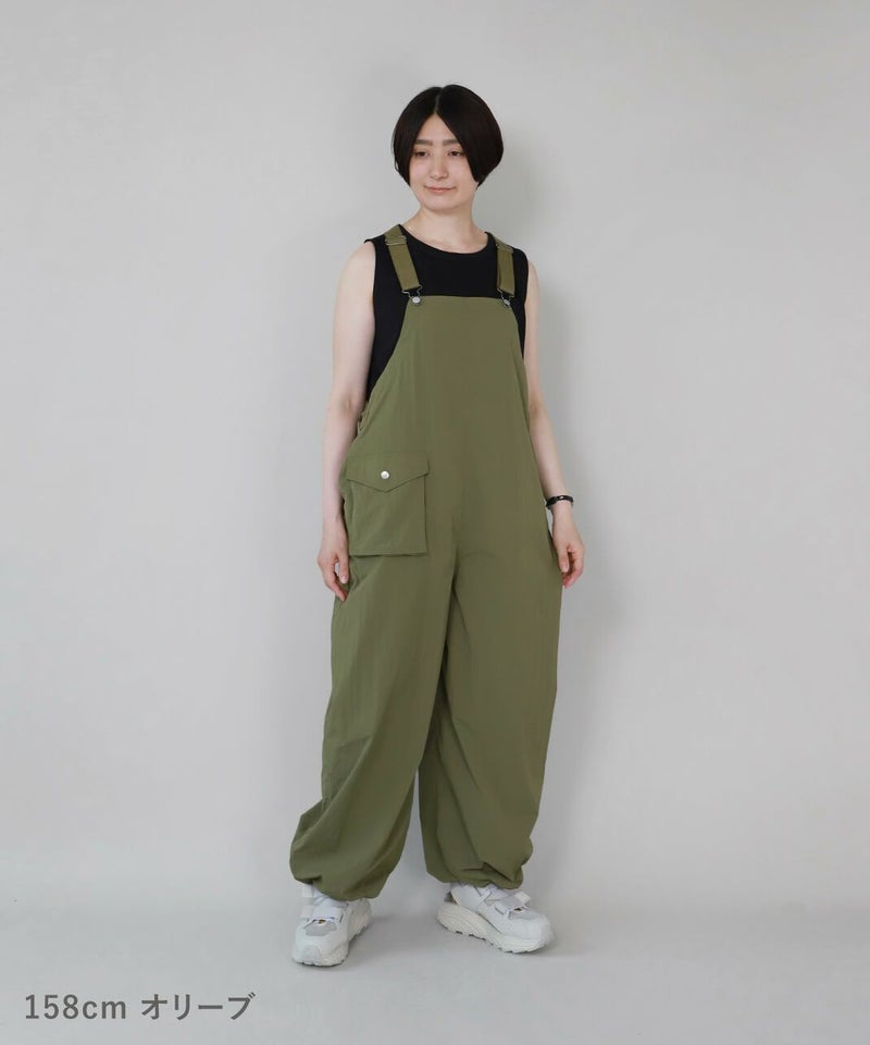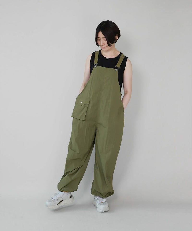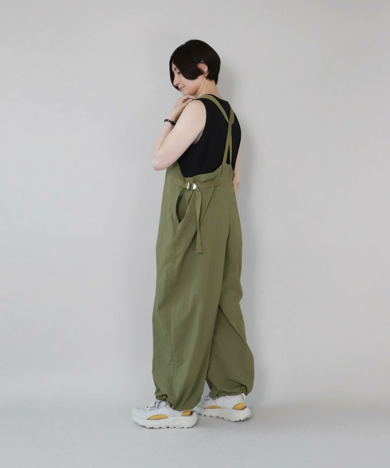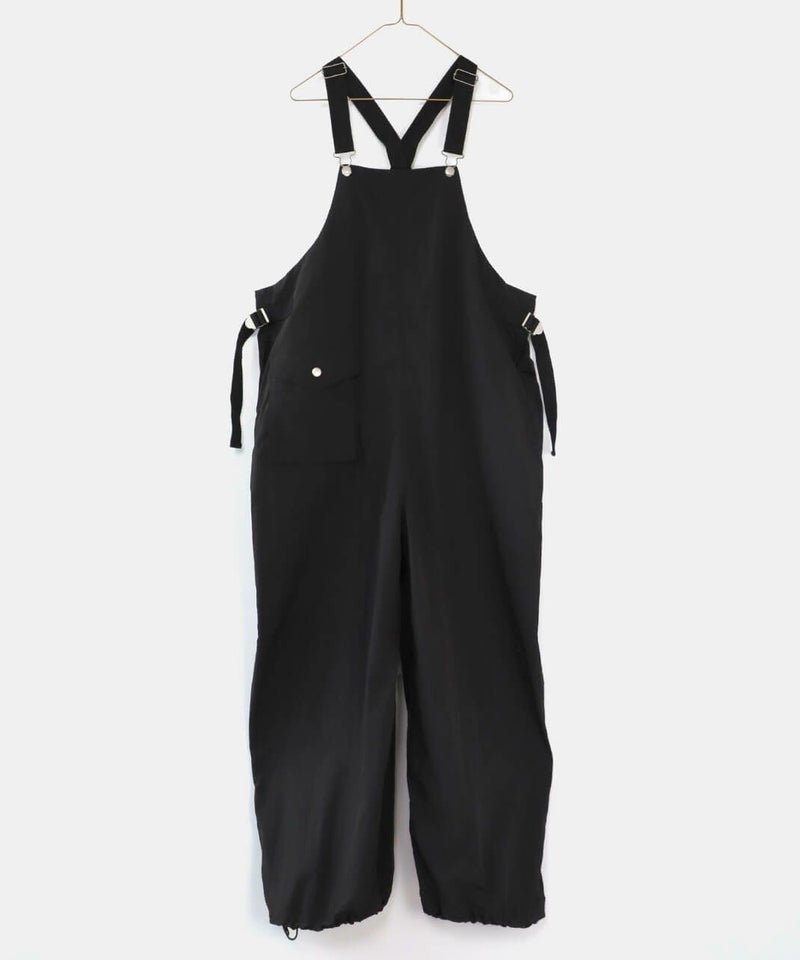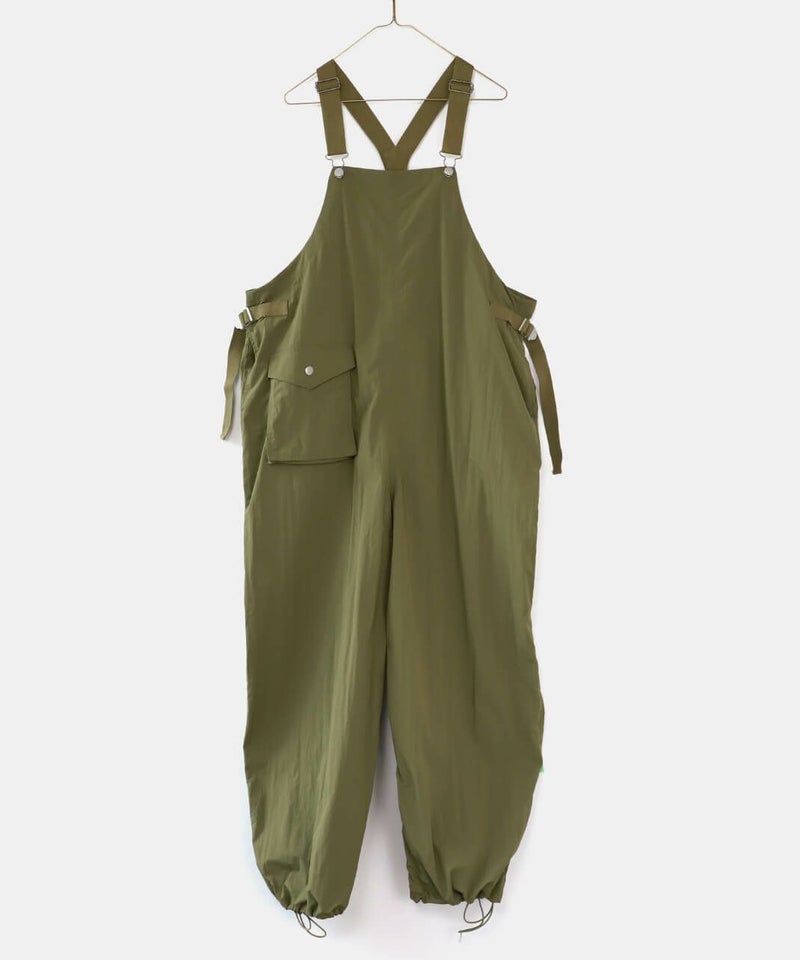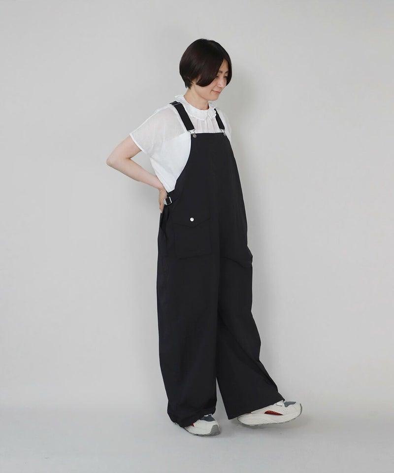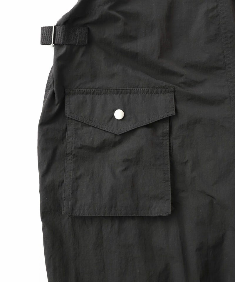 薄くて軽いナイロン素材に撥水加工を施したワイドサロペットです。 ベーシックな前立てに肩紐を同色の綾テープで切替え、シンプルな中にもミリタリーテイストを持たせています。フロントにひとつ大きな立体ポケットのデザインとワイドシルエットがカジュアルな印象の1着です。ウエストの綾テープとアジャスターでサイズ調整はもちろん、シルエットの変化が可能です。シンプルなインナーを合わせるだけでスタイリングが決まります。