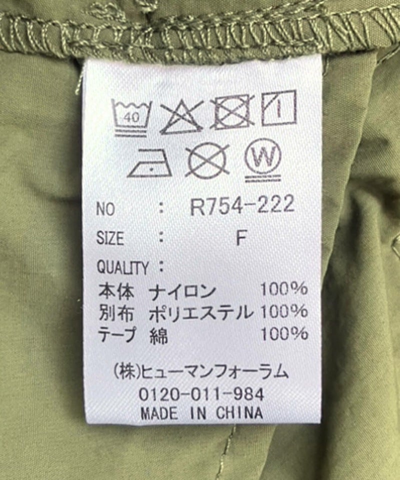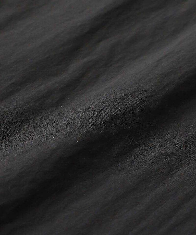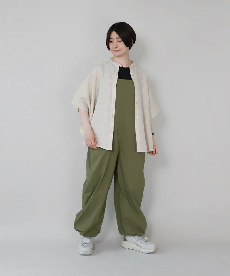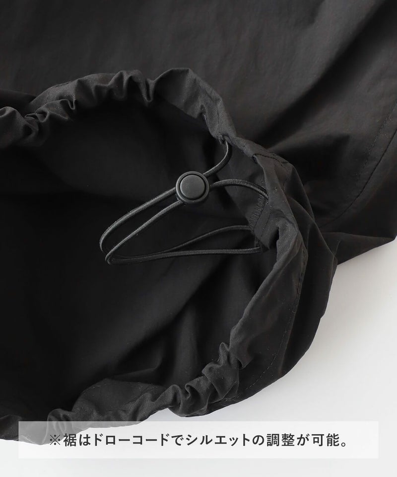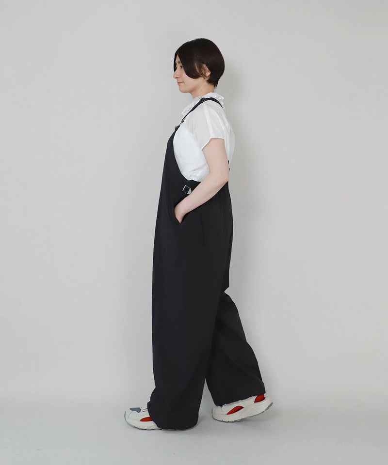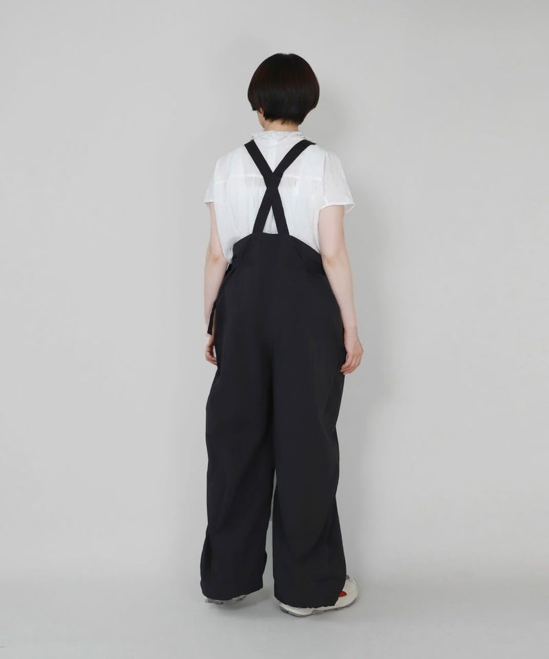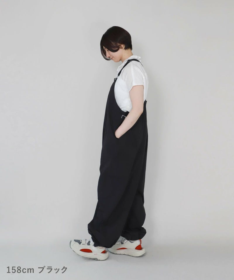 薄くて軽いナイロン素材に撥水加工を施したワイドサロペットです。 ベーシックな前立てに肩紐を同色の綾テープで切替え、シンプルな中にもミリタリーテイストを持たせています。フロントにひとつ大きな立体ポケットのデザインとワイドシルエットがカジュアルな印象の1着です。ウエストの綾テープとアジャスターでサイズ調整はもちろん、シルエットの変化が可能です。シンプルなインナーを合わせるだけでスタイリングが決まります。