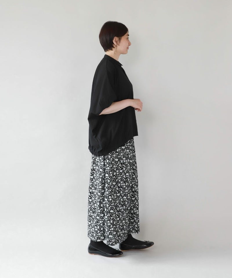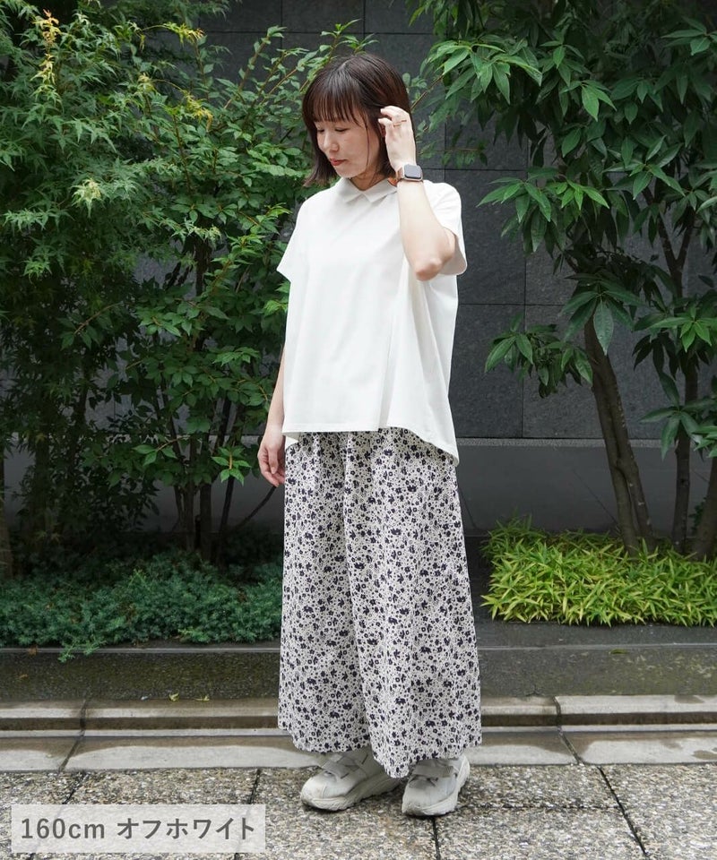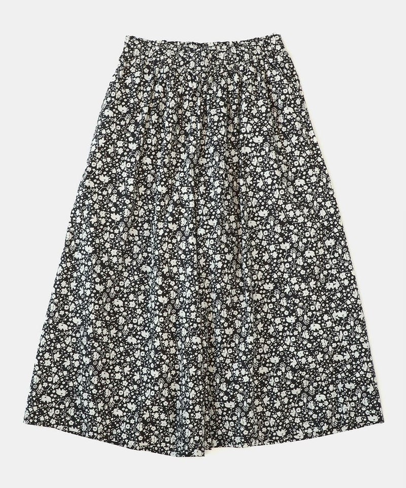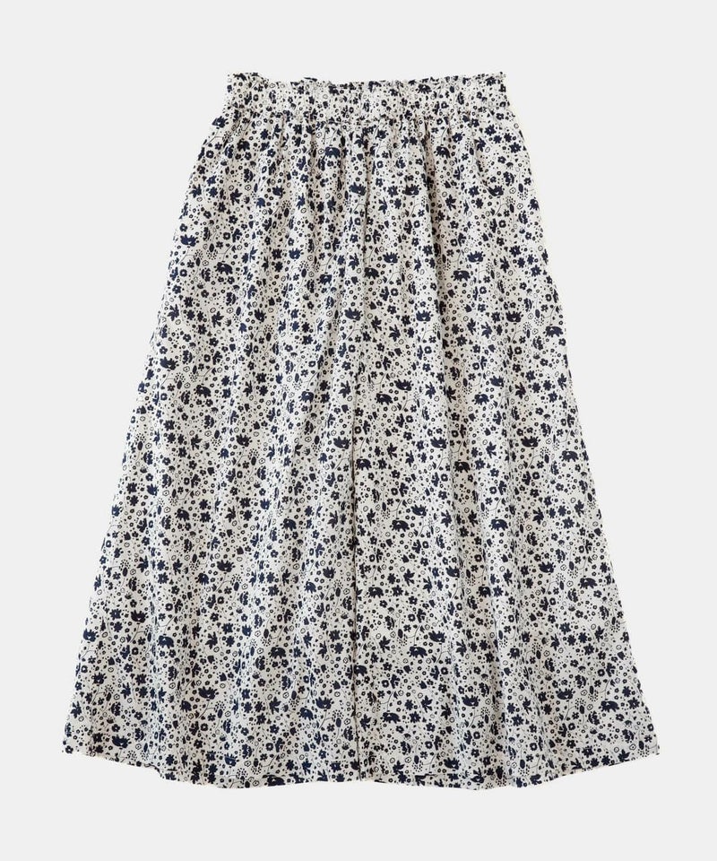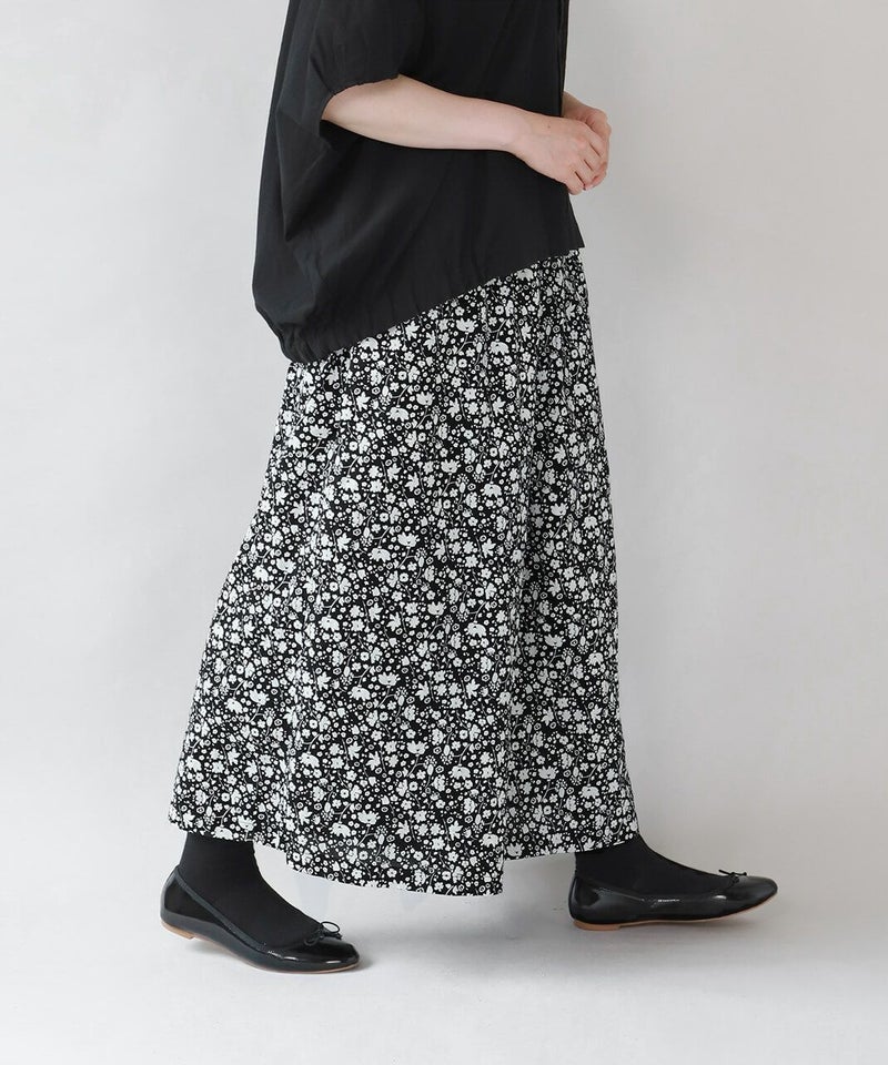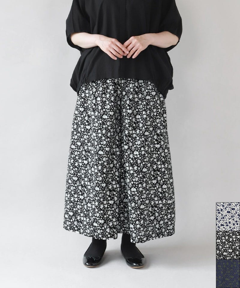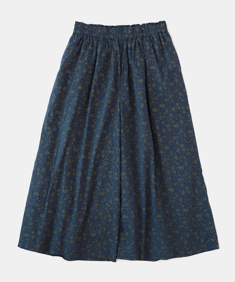 肌触りの良いコットン素材の花柄フレアパンツです。 タック入りのワイドシルエットでリラックスした着心地。スカートのようなボリューム感で、裏地付きなので透ける心配はありません。ウエストはゴムと内紐付きでジャストサイズに調整可能です。落ち着いた小花柄がコーディネートのアクセントになります。