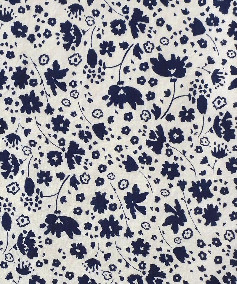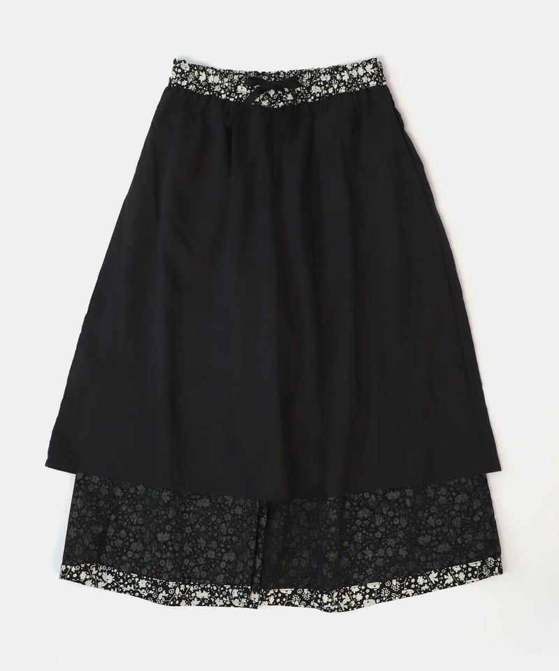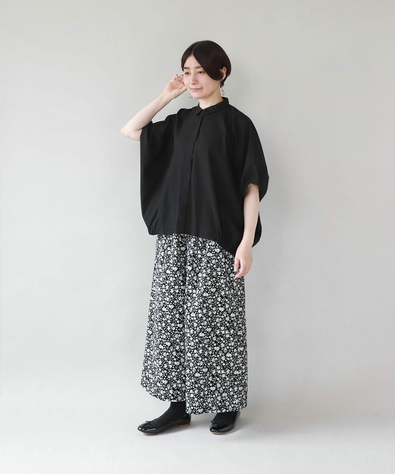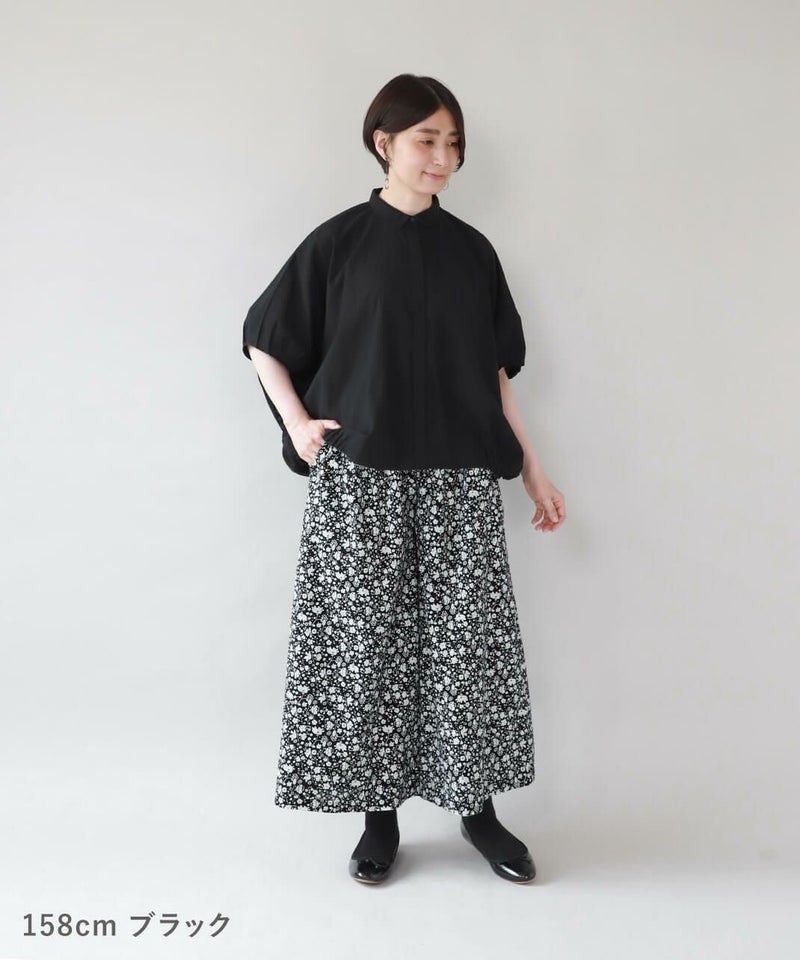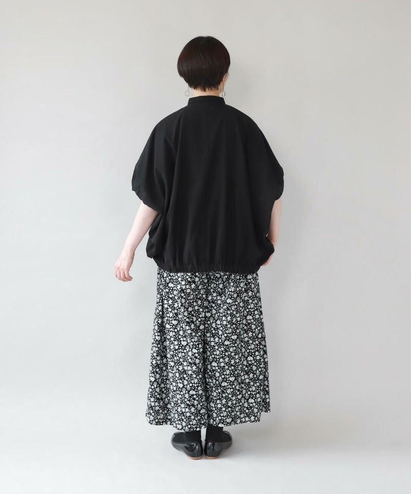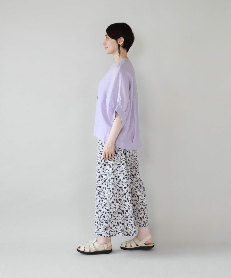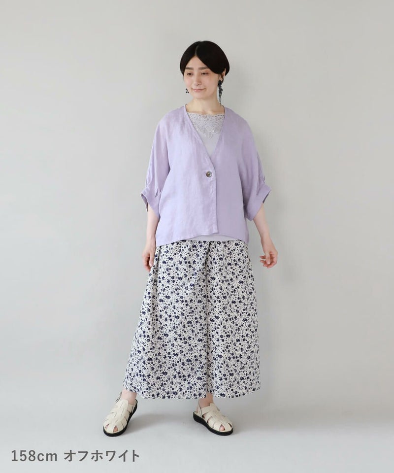 肌触りの良いコットン素材の花柄フレアパンツです。 タック入りのワイドシルエットでリラックスした着心地。スカートのようなボリューム感で、裏地付きなので透ける心配はありません。ウエストはゴムと内紐付きでジャストサイズに調整可能です。落ち着いた小花柄がコーディネートのアクセントになります。