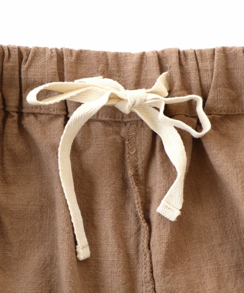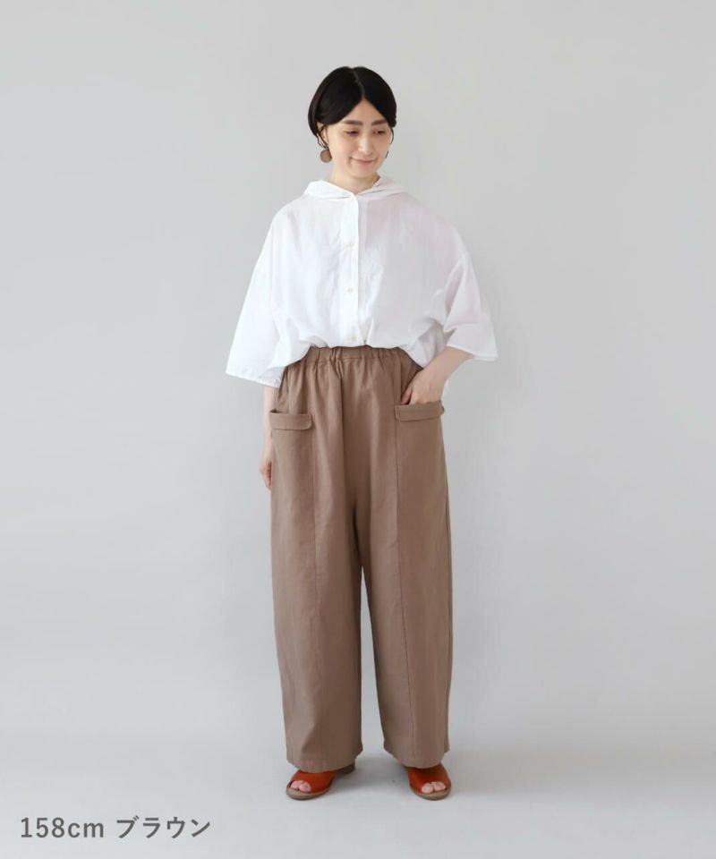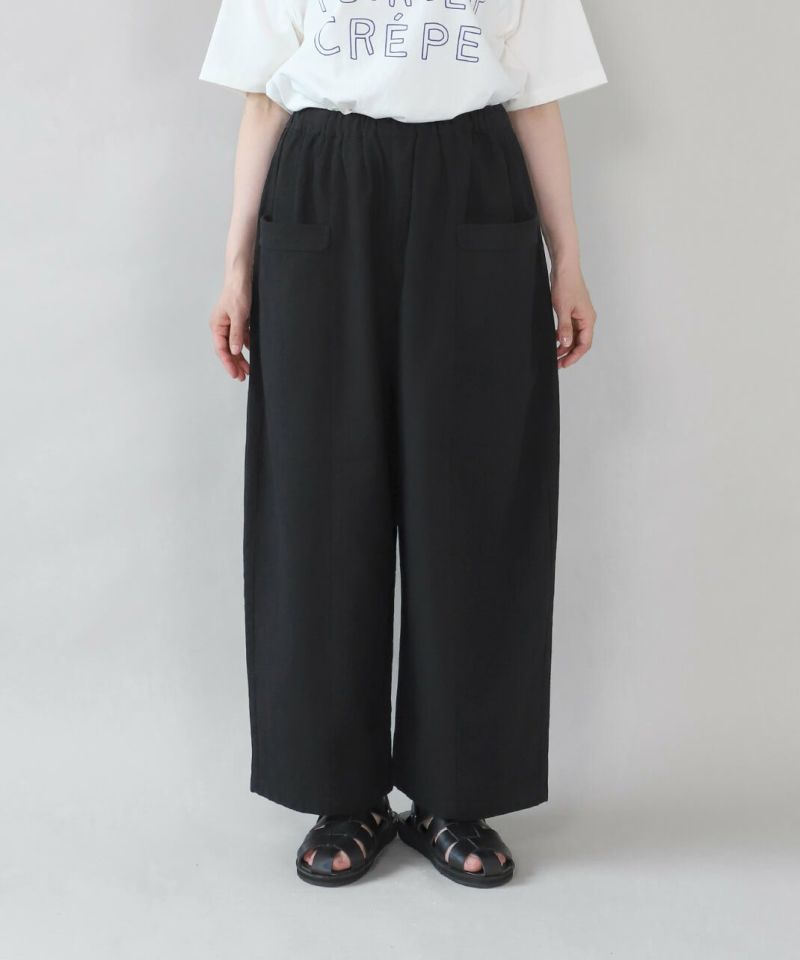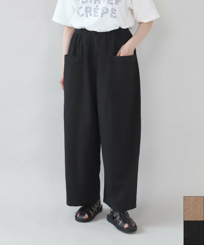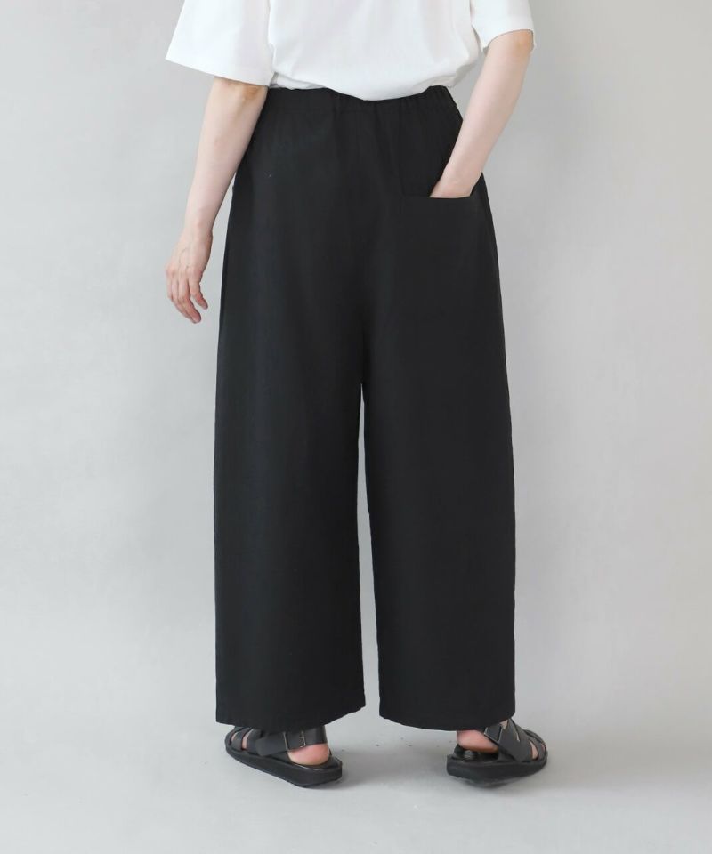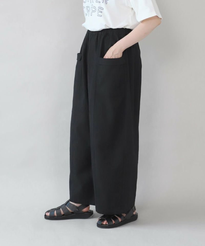 吸湿・吸水性に優れた柔らかな風合いのコットンリネンを使用したパンツです。 ゆるっとしたセミワイドなシルエットでリラックスした着心地。フロントのフラップつきのポケットがコーディネートのアクセントになります。ウエストはゴムと内紐付きのため、サイズ調整が可能です。ほどよい厚みの生地を使用しているため、オールシーズン着用できます。