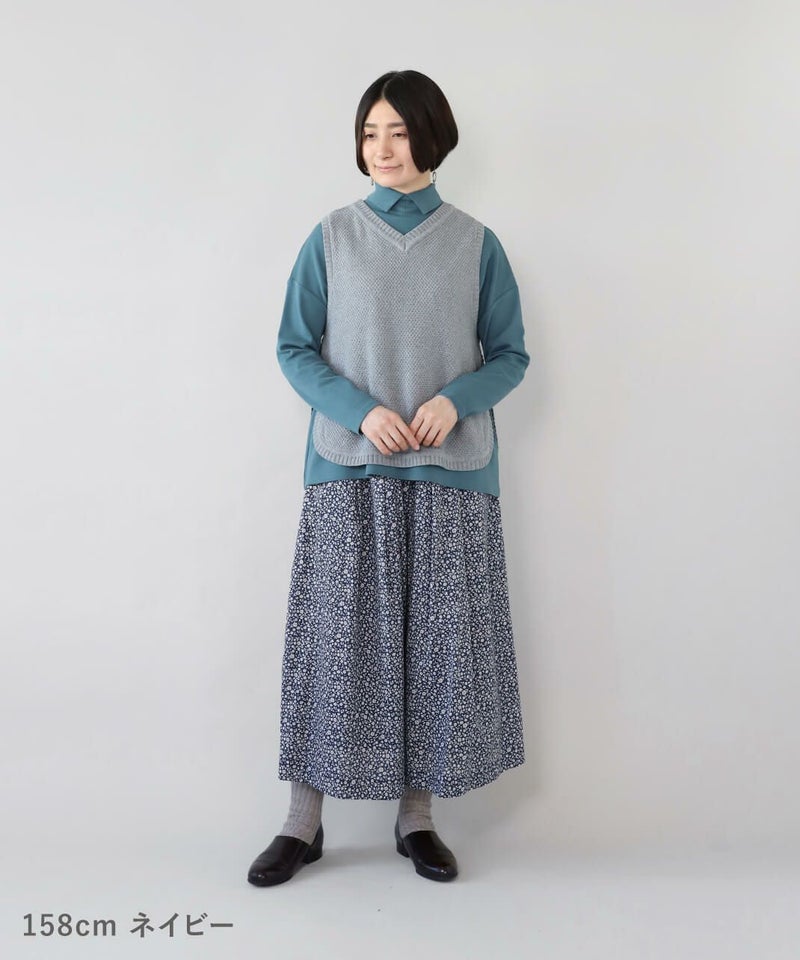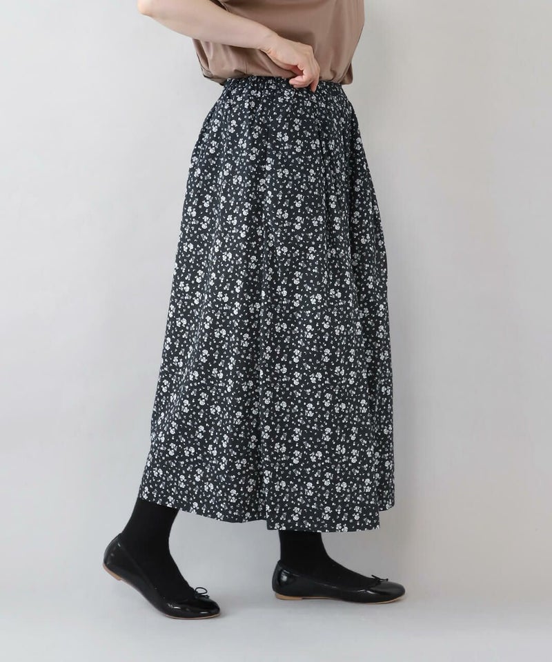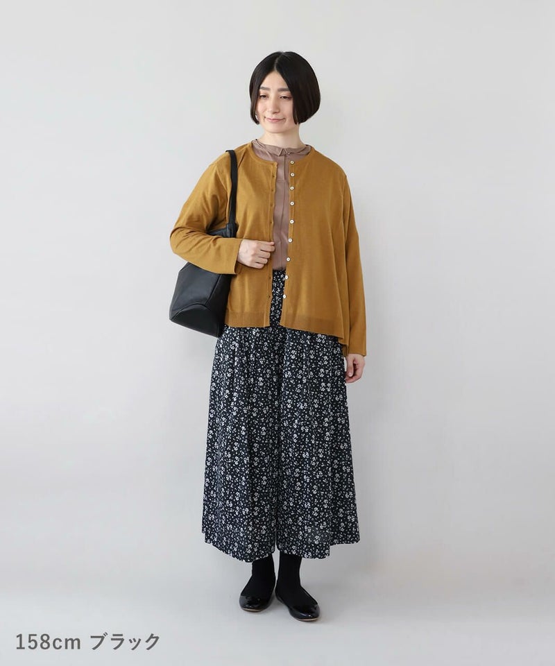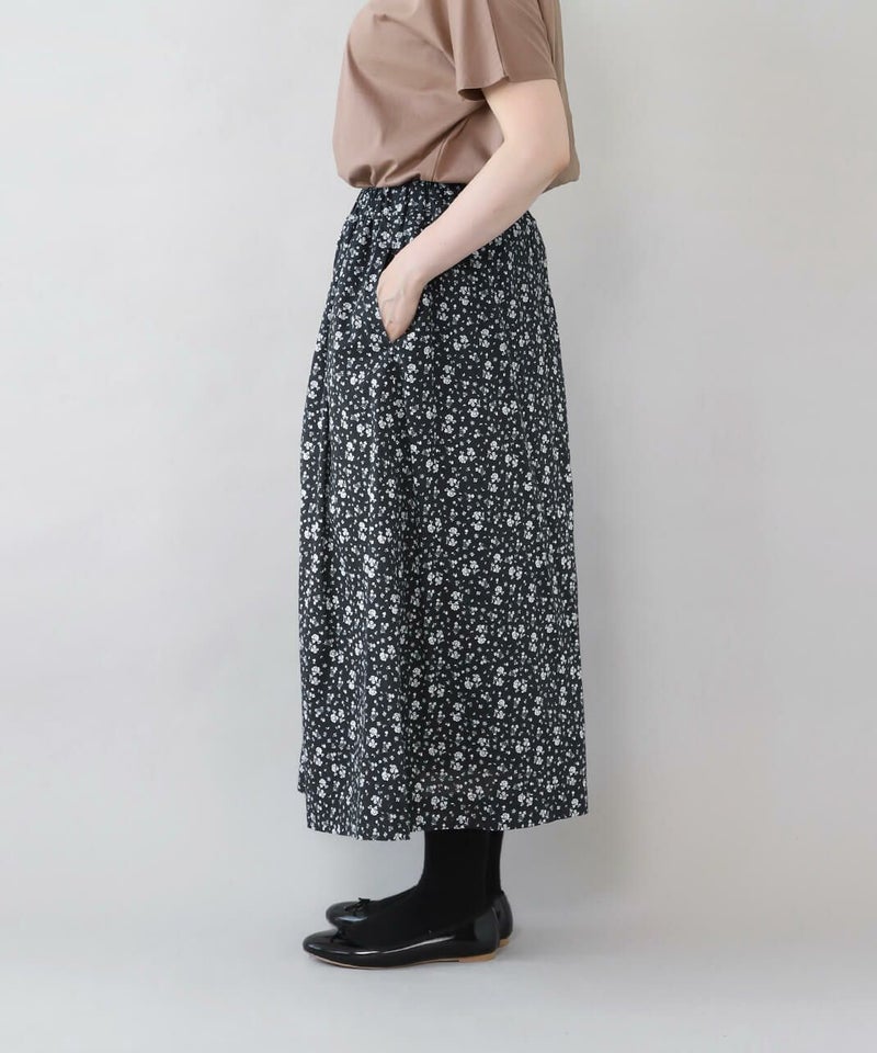 たっぷりとギャザーが施され、Aラインのスカートのように見えるシルエットがポイントです。HEAVENLYオリジナルの小さな総花柄プリントが大人らしい、しなやかな印象を演出してくれます。ウエストはゴムと紐仕様でリラックスした着心地。裏地もついて安心です。
