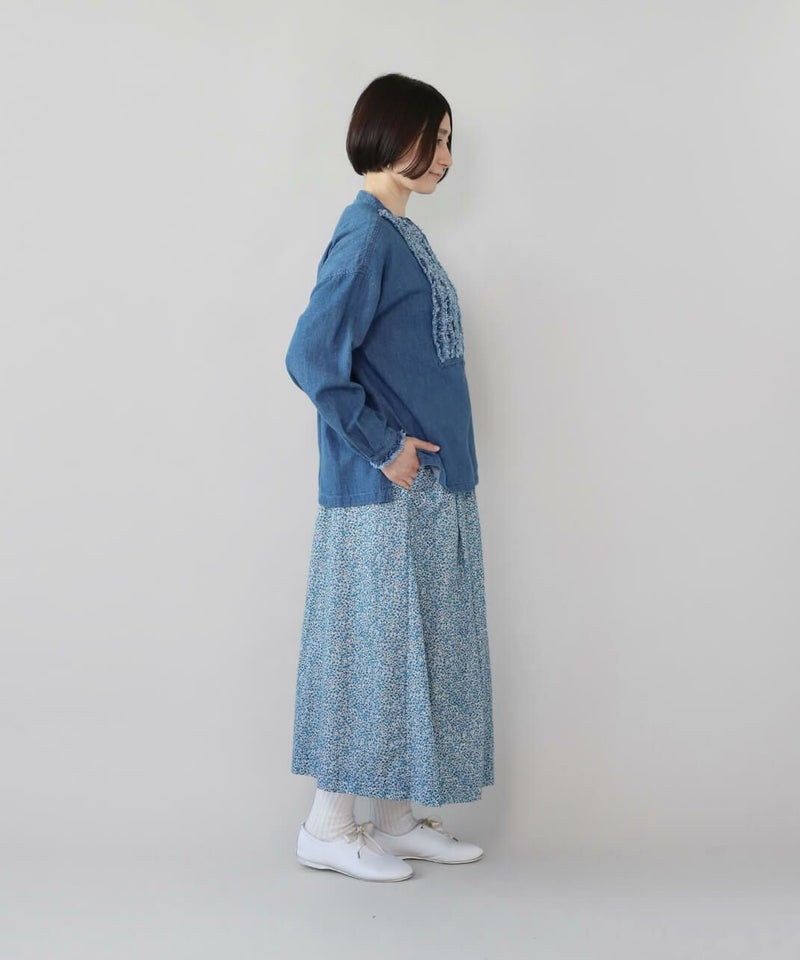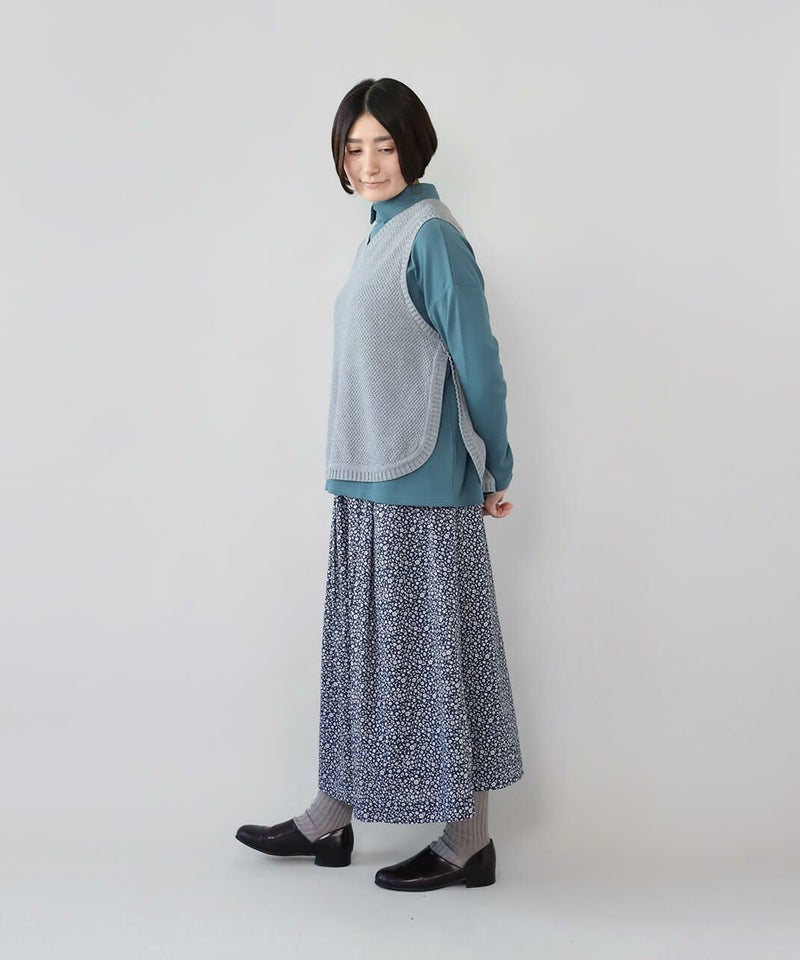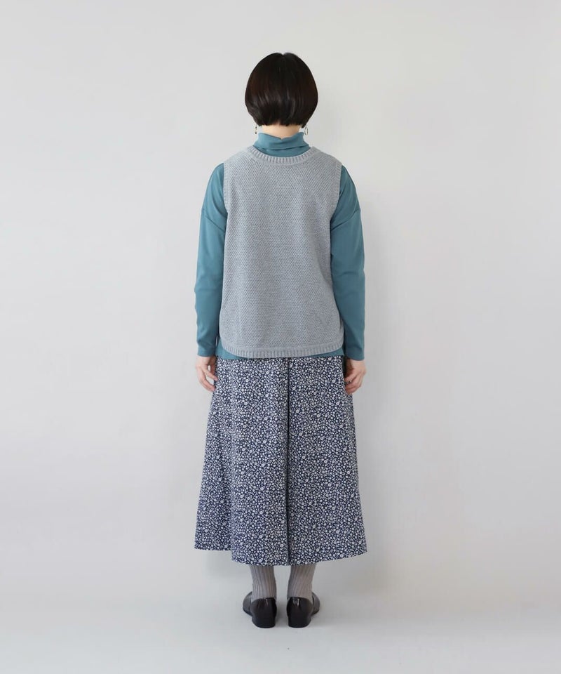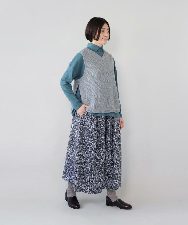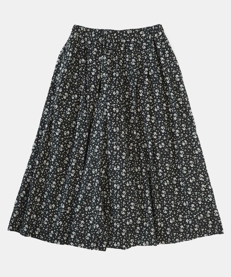 たっぷりとギャザーが施され、Aラインのスカートのように見えるシルエットがポイントです。HEAVENLYオリジナルの小さな総花柄プリントが大人らしい、しなやかな印象を演出してくれます。ウエストはゴムと紐仕様でリラックスした着心地。裏地もついて安心です。