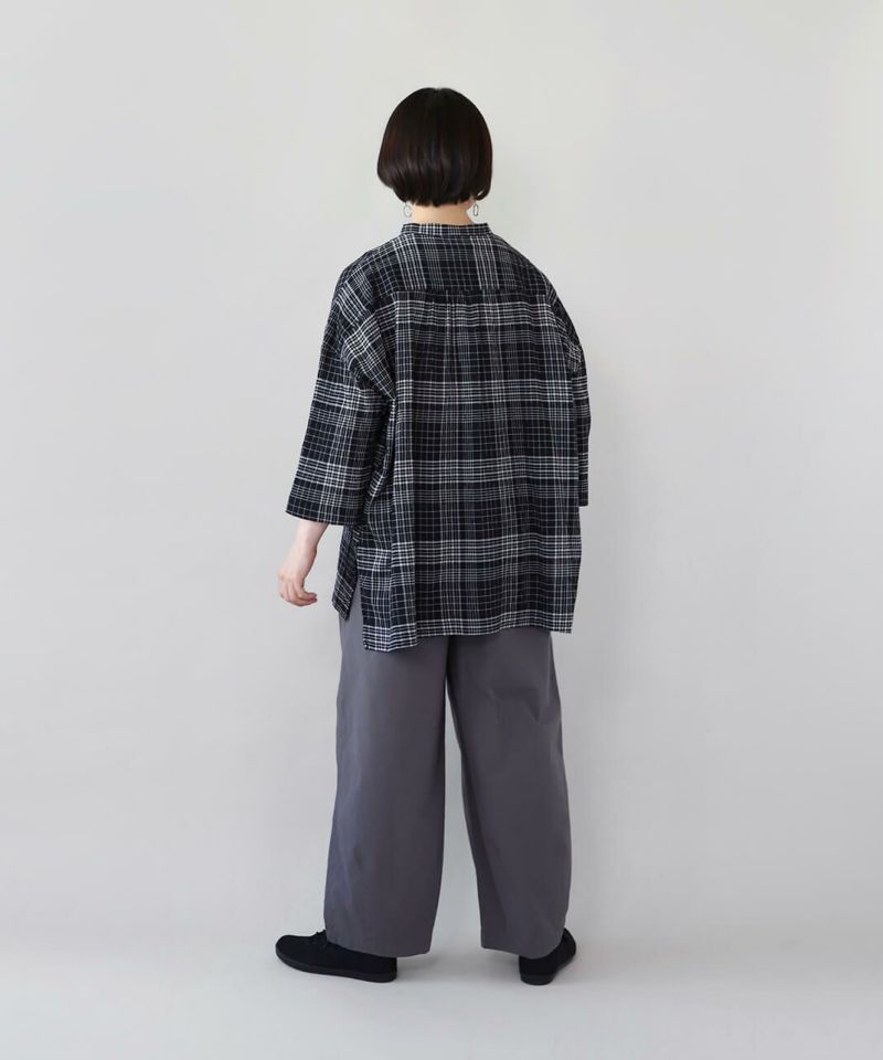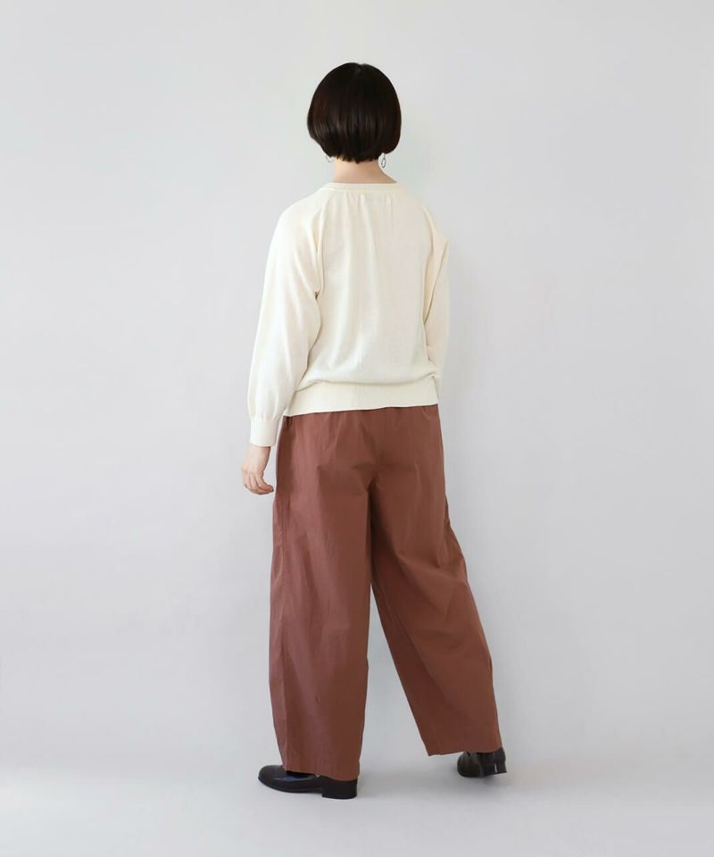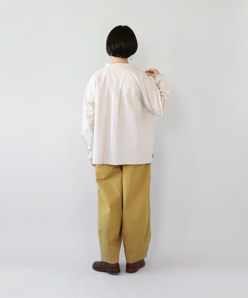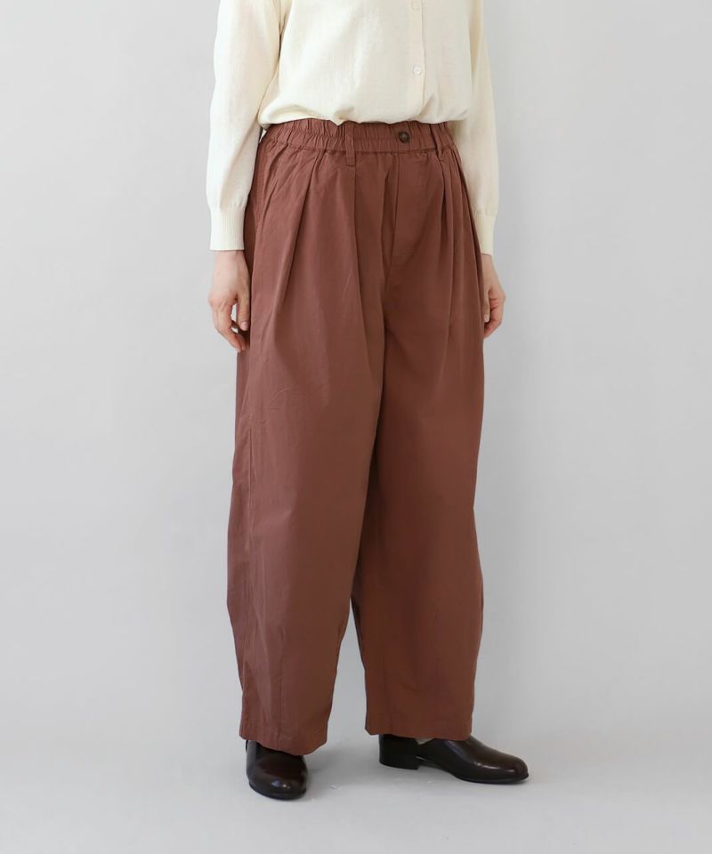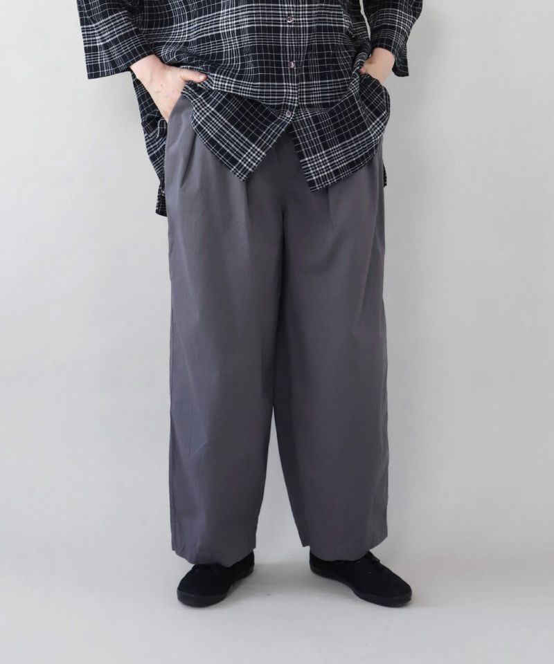 タック入りで腰周りはゆったり、裾のダーツですっきりと収まりのあるシルエットに。