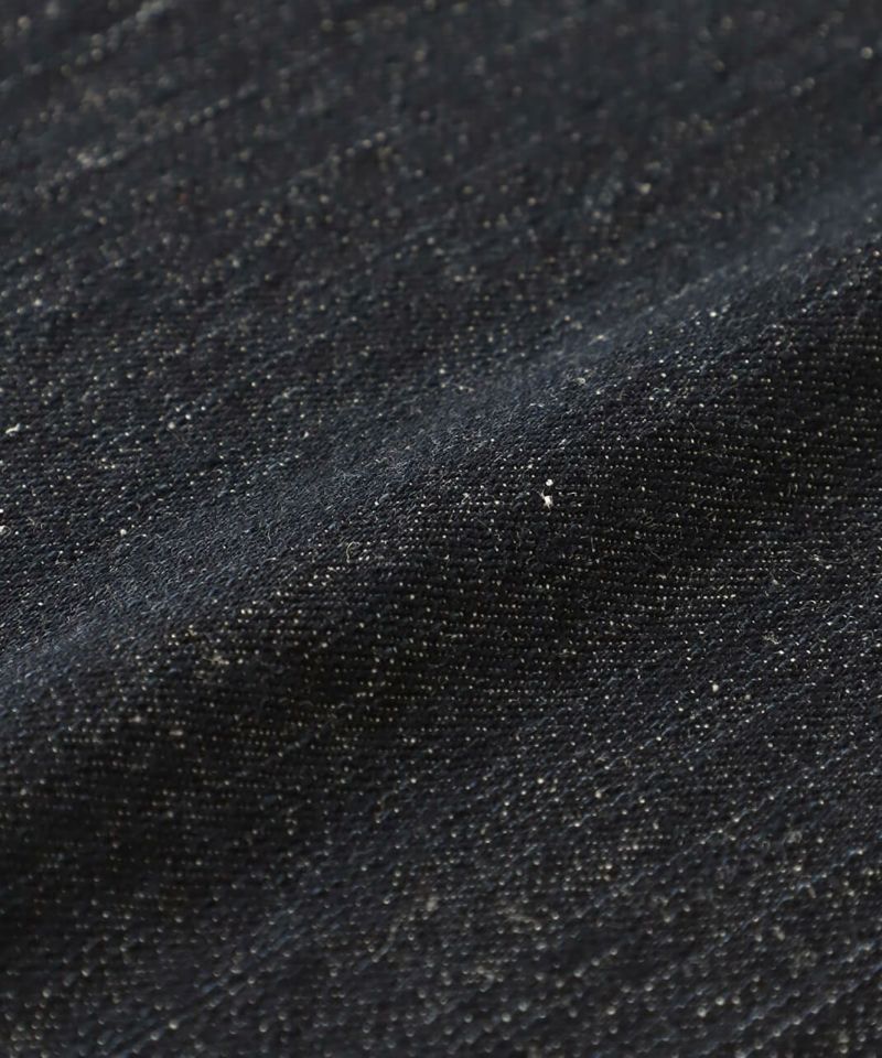 タテ糸に色糸、ヨコ糸に白糸を使い、平織りにすることで白糸が表面にも交互に出てきて霜のように見える、霜降り調のデニム生地を使用しています。