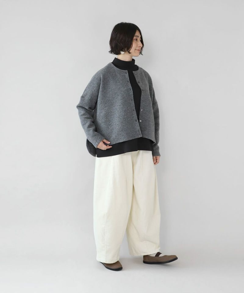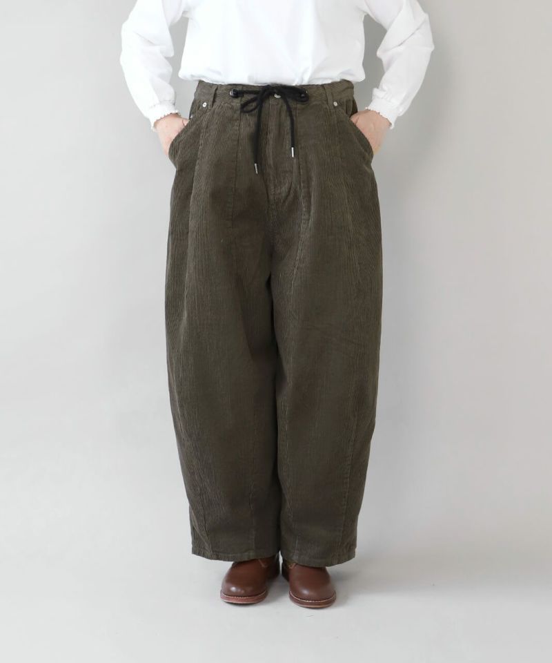 上質なコットンコーデュロイ生地を使用したタックバルーンパンツです。 ウエストと裾のダーツがボールの様な立体的なシルエットの1着。ゆったりとしたウエストはドローコードタイプの紐でジャストサイズに調整可能です。リラックスしたサイズ感は足のラインを拾わず、トップスとのバランスも取ってくれます。
