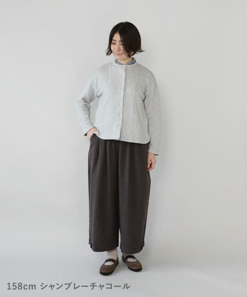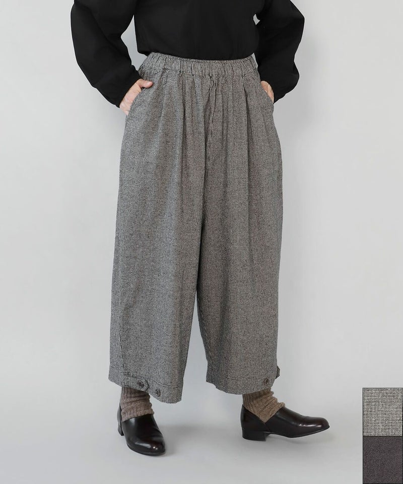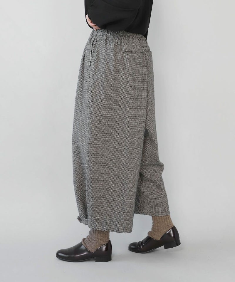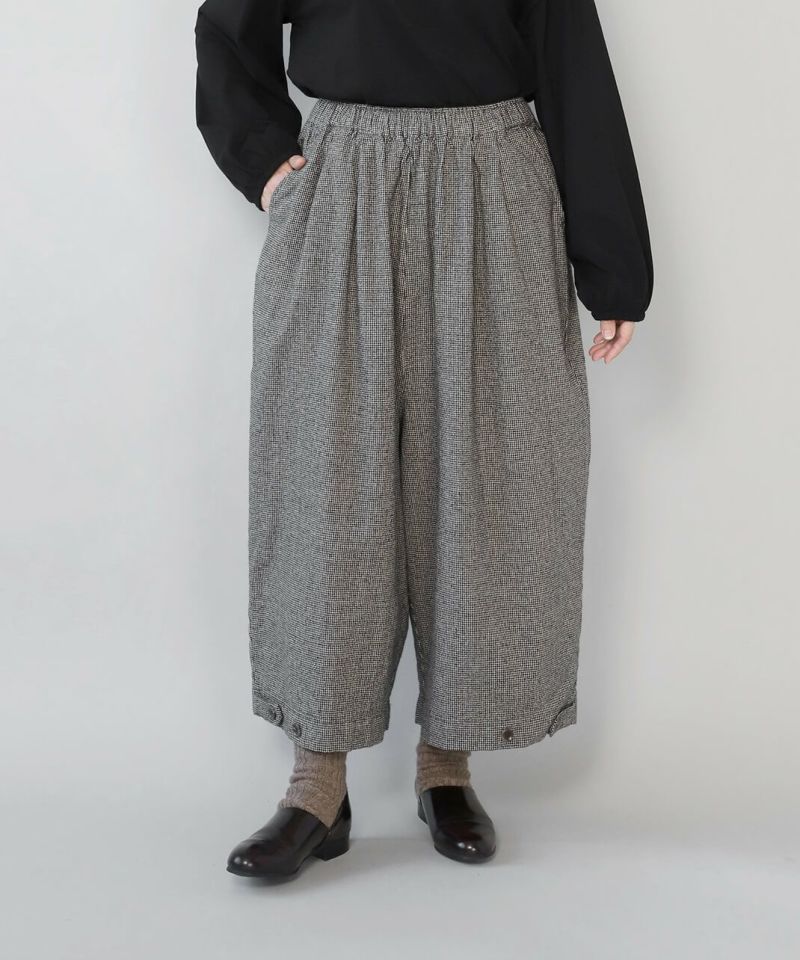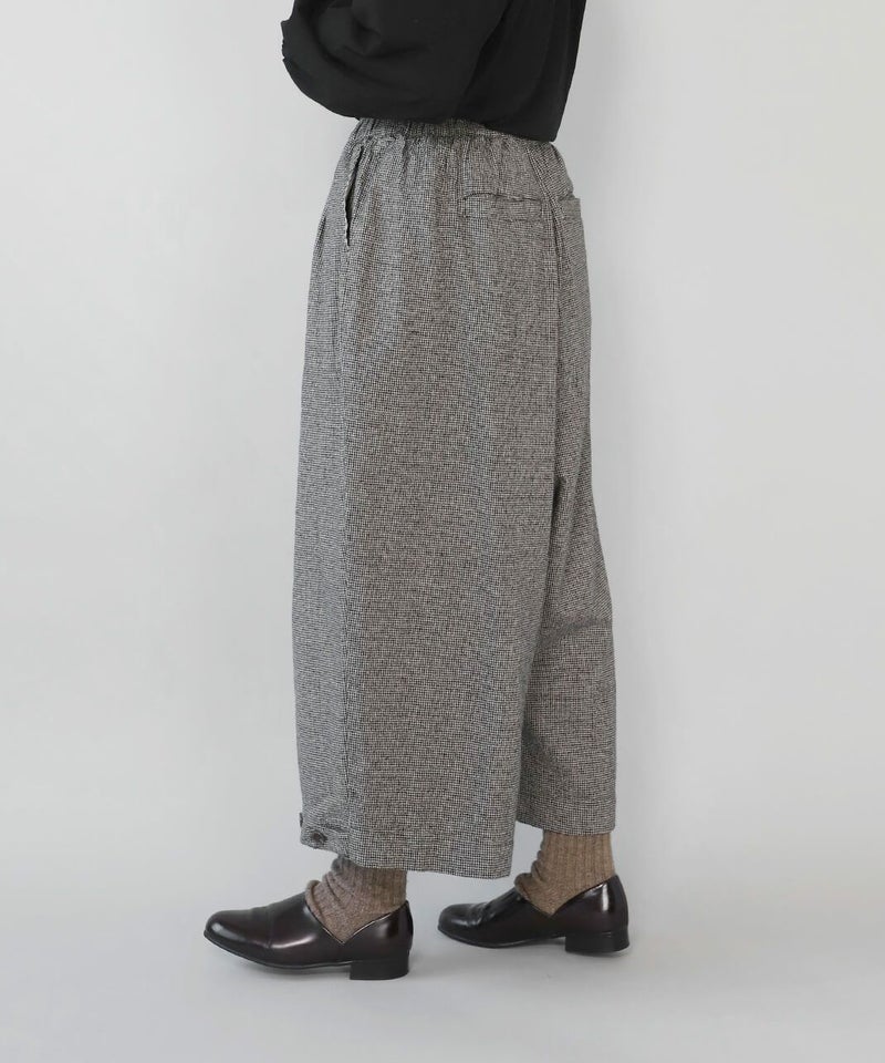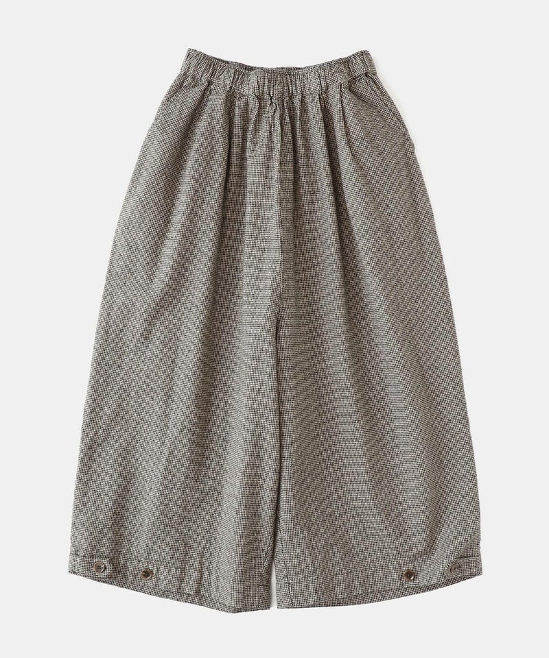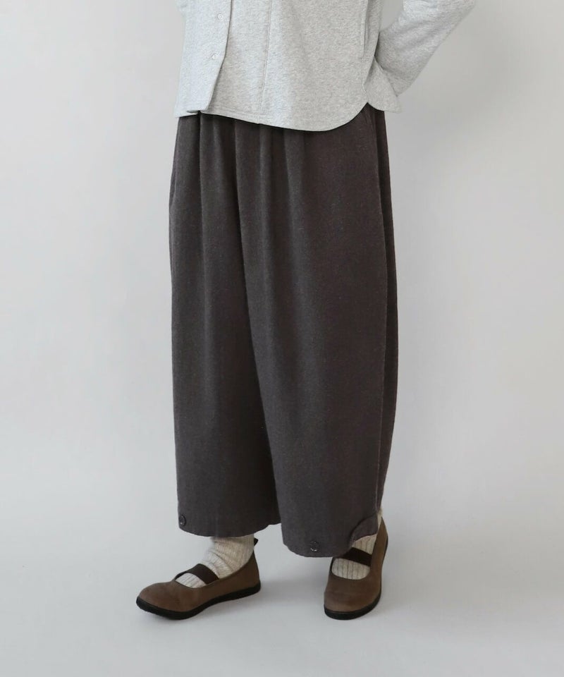 コットンリネンのほどよく厚みのある平織起毛素材を使用したサルエルパンツです。 裾に向かって広がったゆったりなワイドシルエットで、深めの股上がきれいなラインをつくっています。起毛感があたたかみのある風合いをプラス。 ウエストはゴム仕様と内紐付きでサイズ調整が可能です。裾のタブボタンは留める位置でシルエットの変化も。 少し短めの丈はブーツや靴下とのコーディネートを楽しめます。