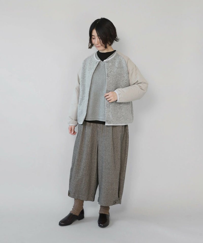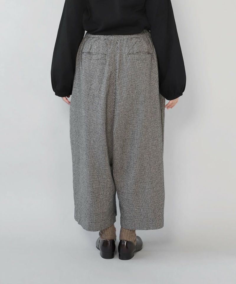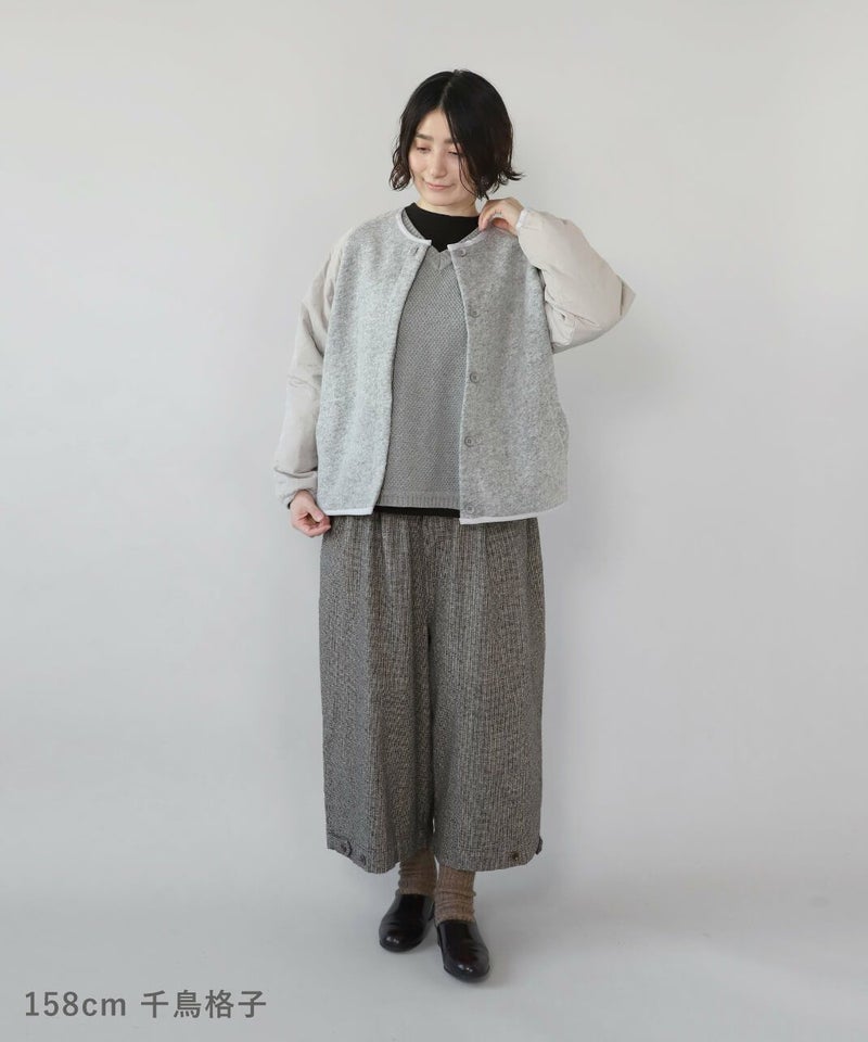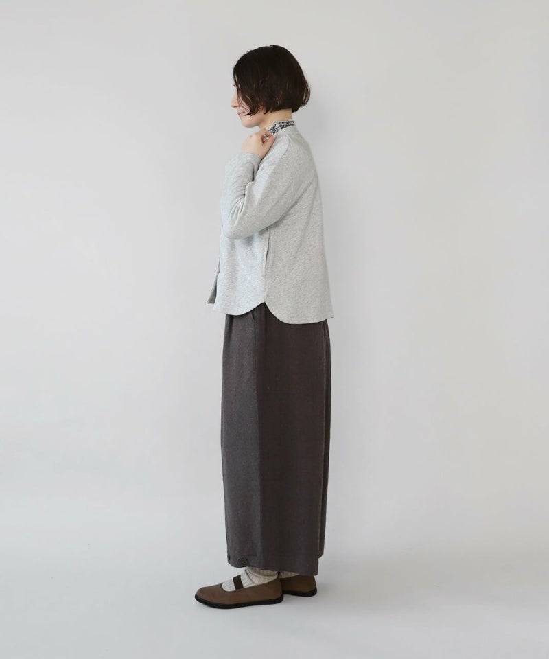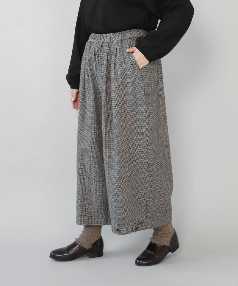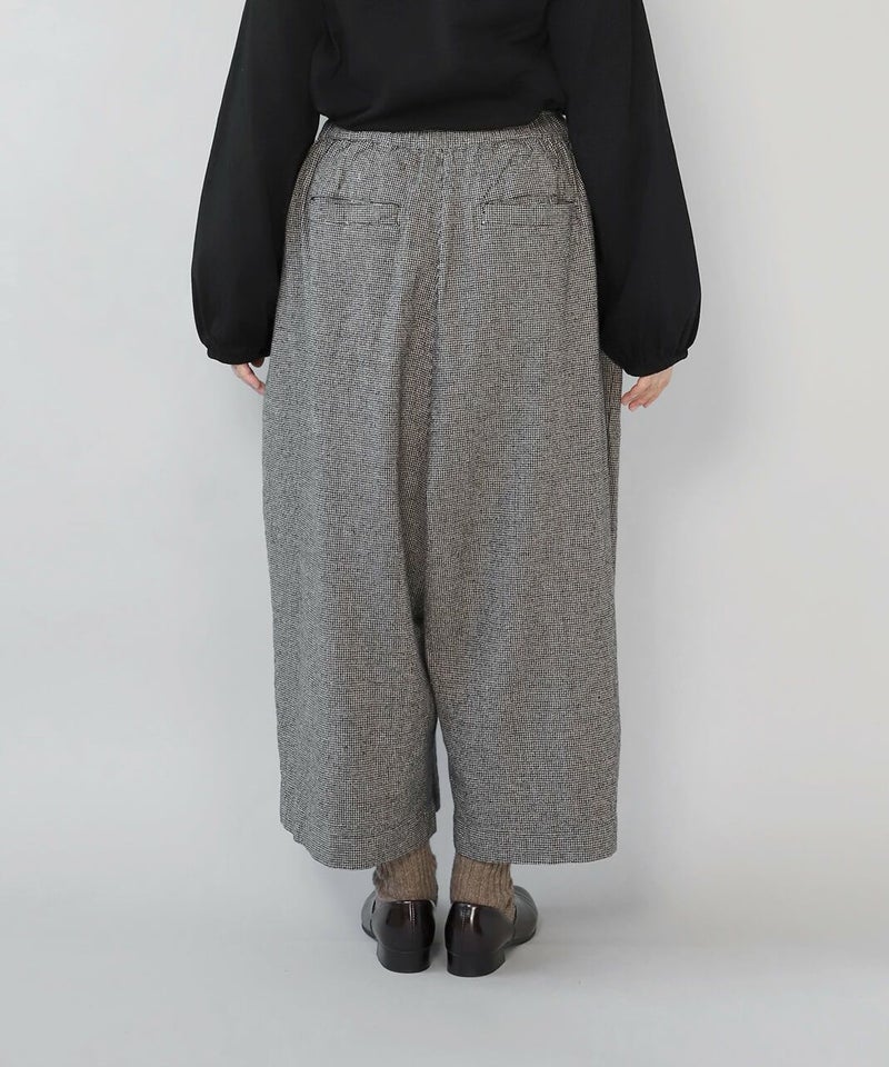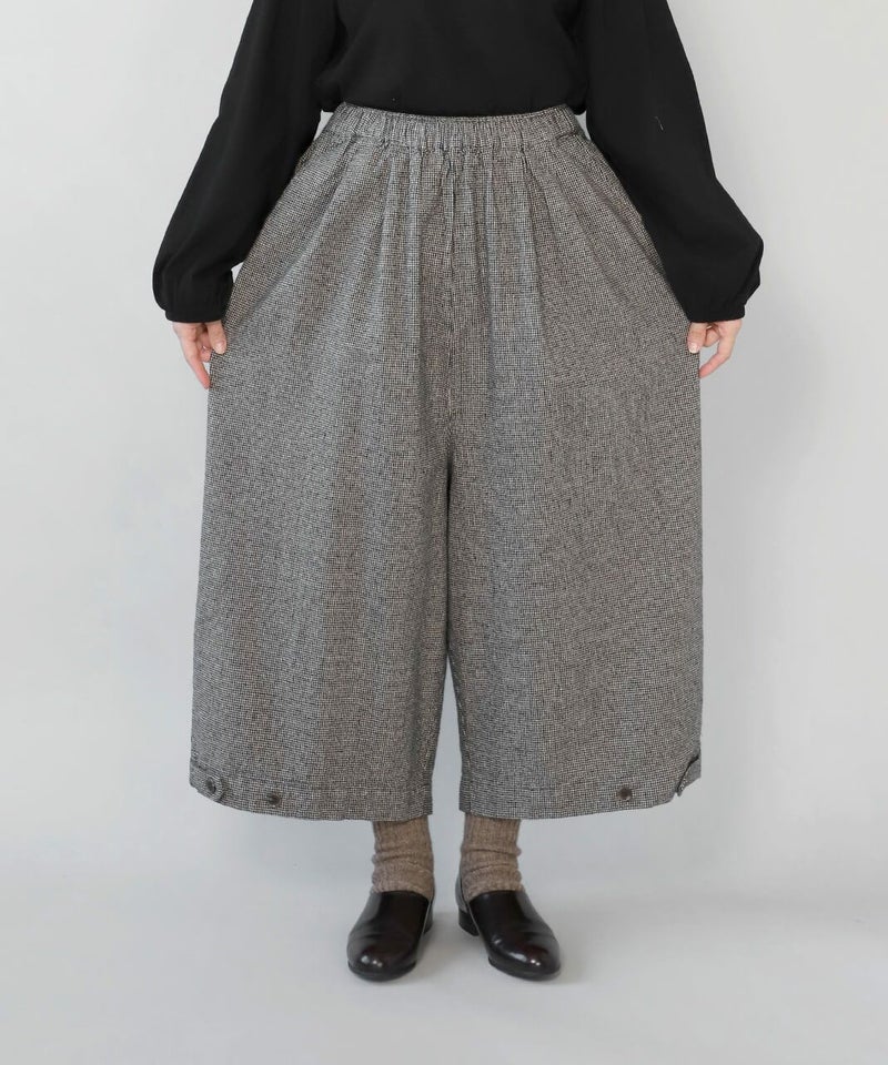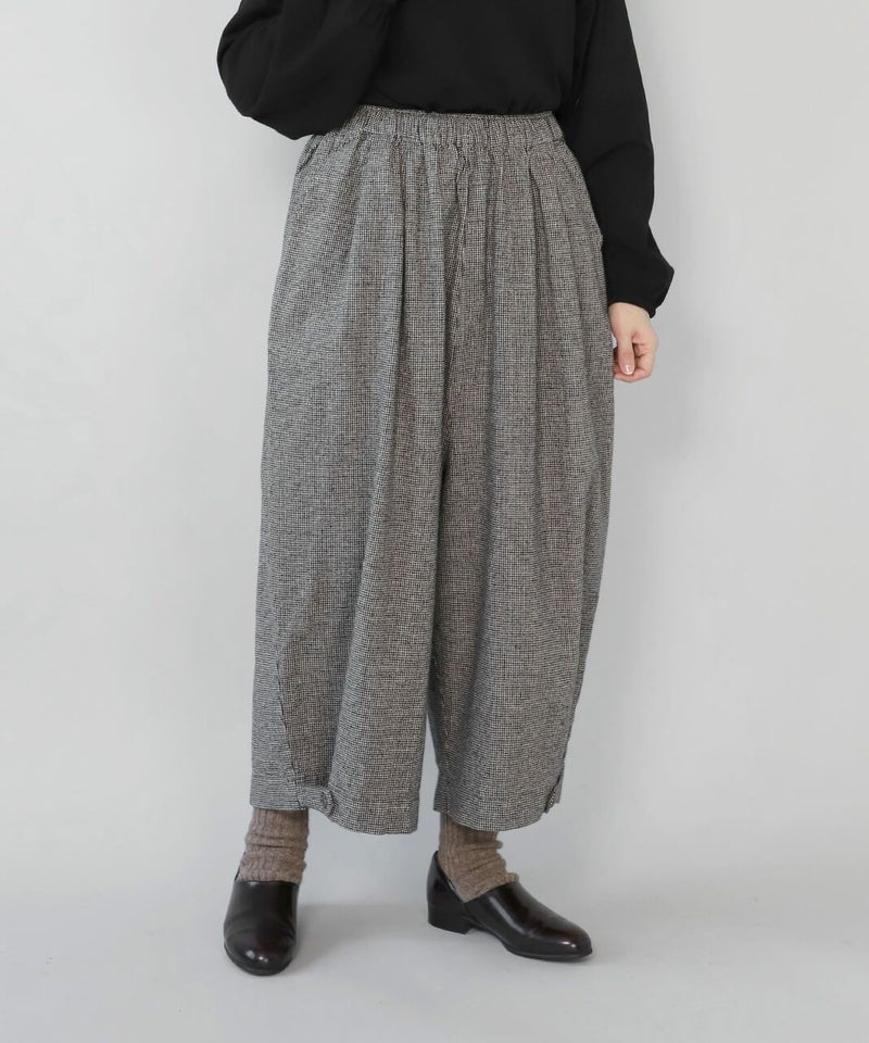 コットンリネンのほどよく厚みのある平織起毛素材を使用したサルエルパンツです。 裾に向かって広がったゆったりなワイドシルエットで、深めの股上がきれいなラインをつくっています。起毛感があたたかみのある風合いをプラス。 ウエストはゴム仕様と内紐付きでサイズ調整が可能です。裾のタブボタンは留める位置でシルエットの変化も。 少し短めの丈はブーツや靴下とのコーディネートを楽しめます。