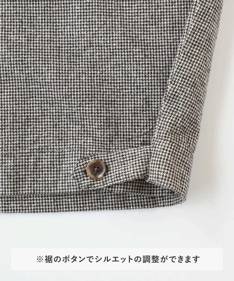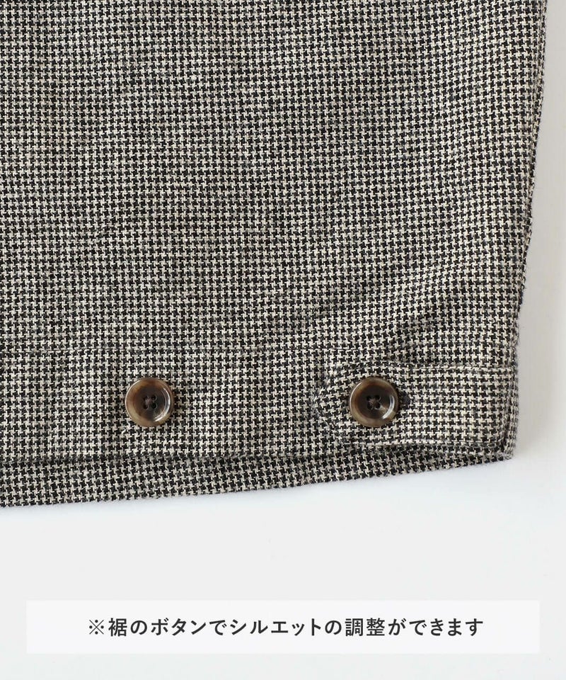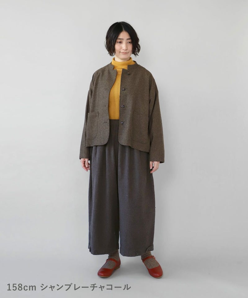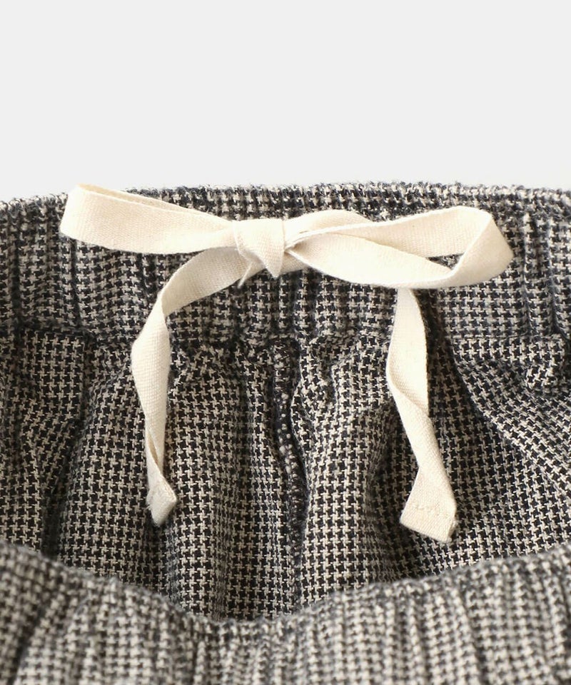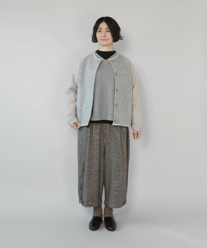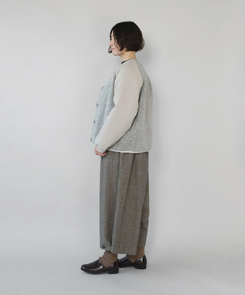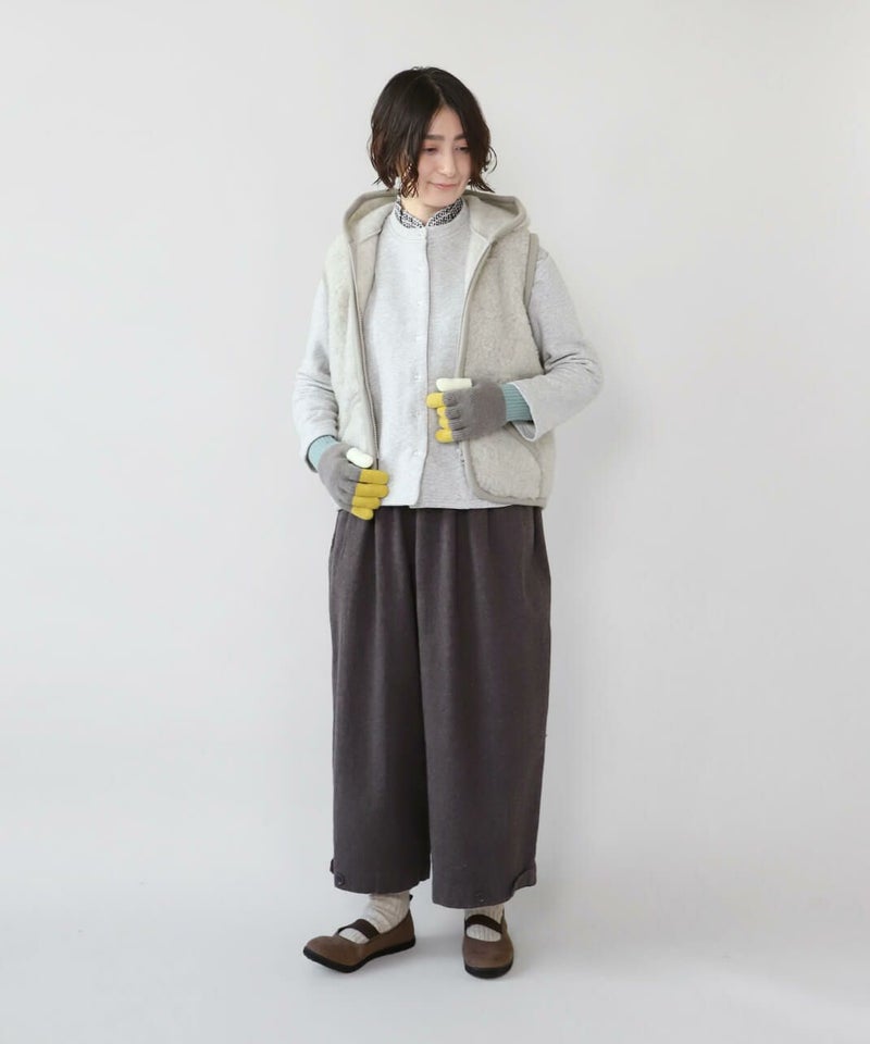 コットンリネンのほどよく厚みのある平織起毛素材を使用したサルエルパンツです。 裾に向かって広がったゆったりなワイドシルエットで、深めの股上がきれいなラインをつくっています。起毛感があたたかみのある風合いをプラス。 ウエストはゴム仕様と内紐付きでサイズ調整が可能です。裾のタブボタンは留める位置でシルエットの変化も。 少し短めの丈はブーツや靴下とのコーディネートを楽しめます。