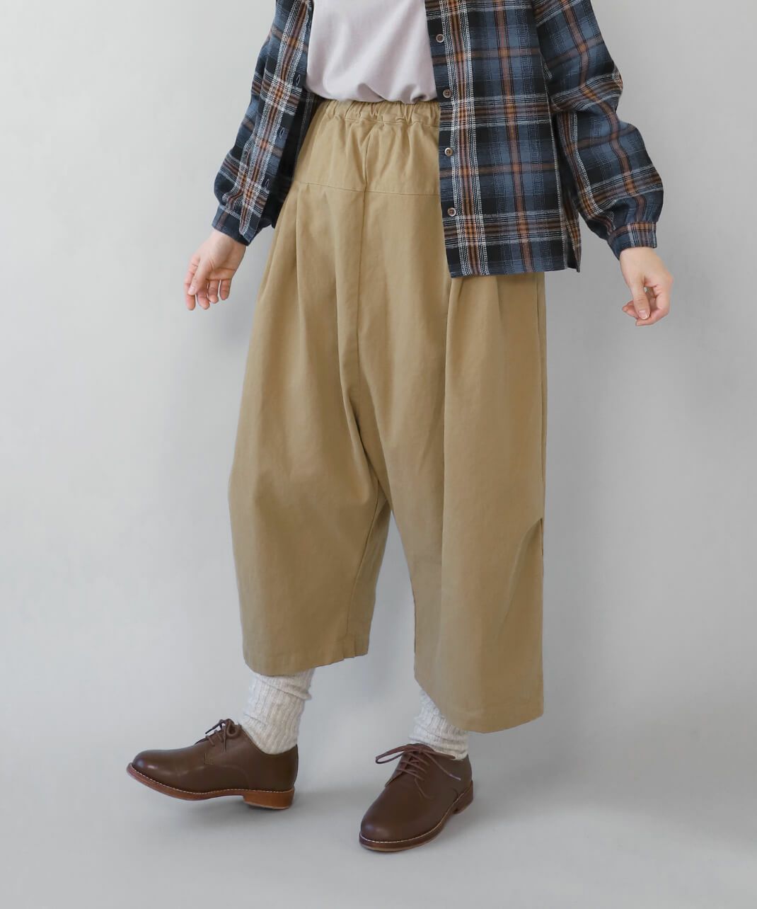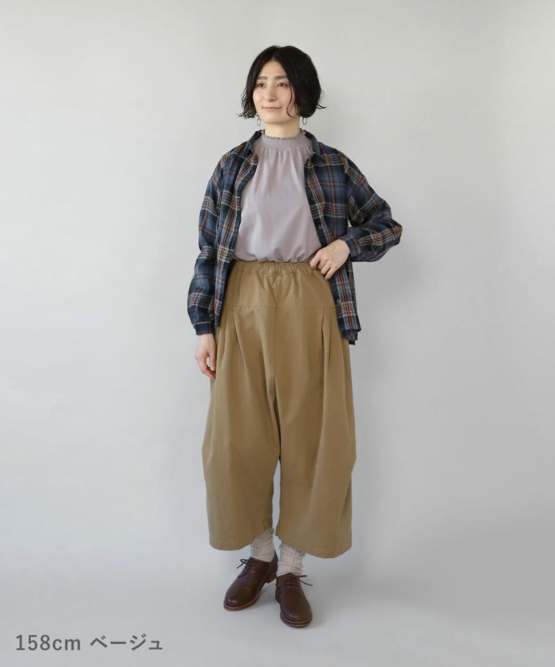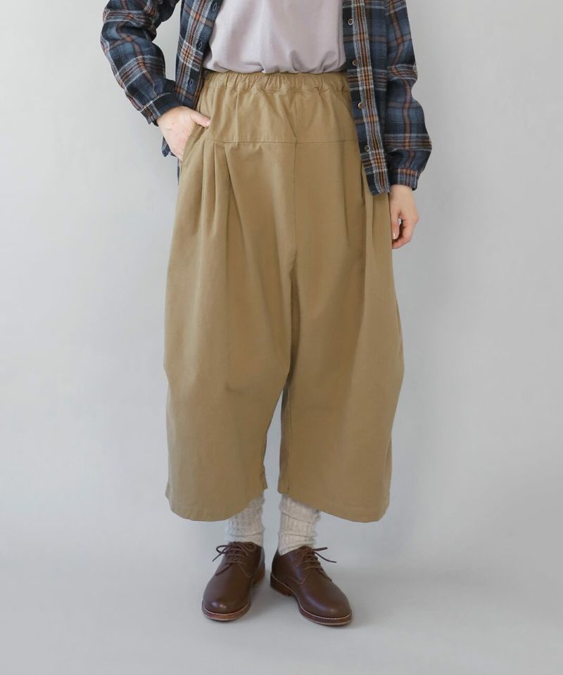 柔らかで密度のあるソフトコットン素材を使用したサルエルパンツです。生地表面にピーチ起毛を施したなめらかな肌触り。腰とすねにタック切替が、裾に向かってふんわりとしたコクーンシルエットに。サルエルの深めの股が上ゆったりとした履き心地です。ウエストはぐるりとゴム仕様で内紐付きのためサイズ調整可能です。サイドとバックにポケット付き。足首が見える丈感は靴下選びも楽しめます。