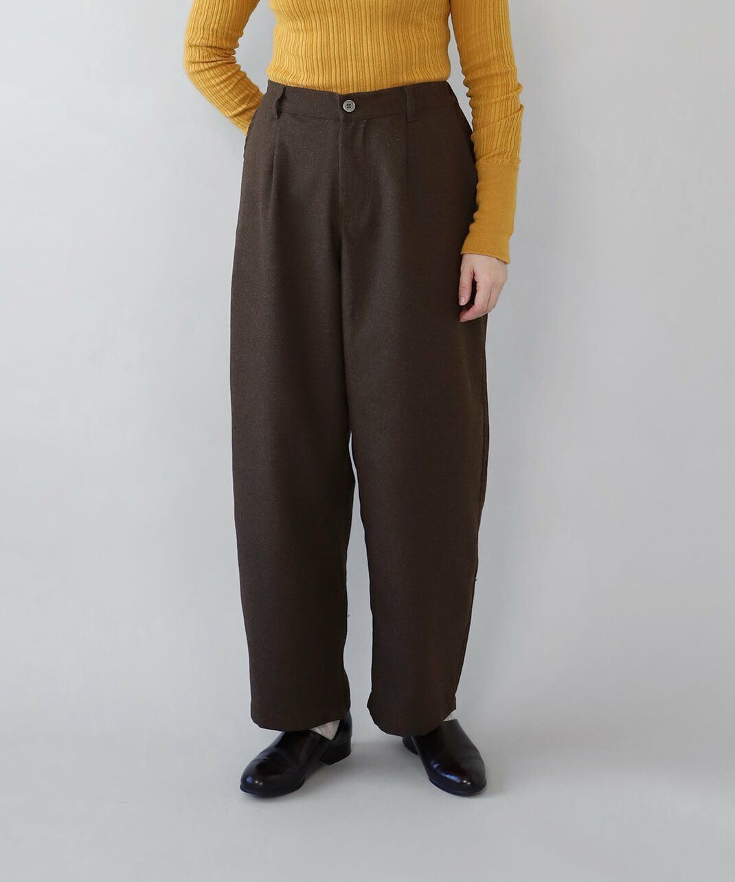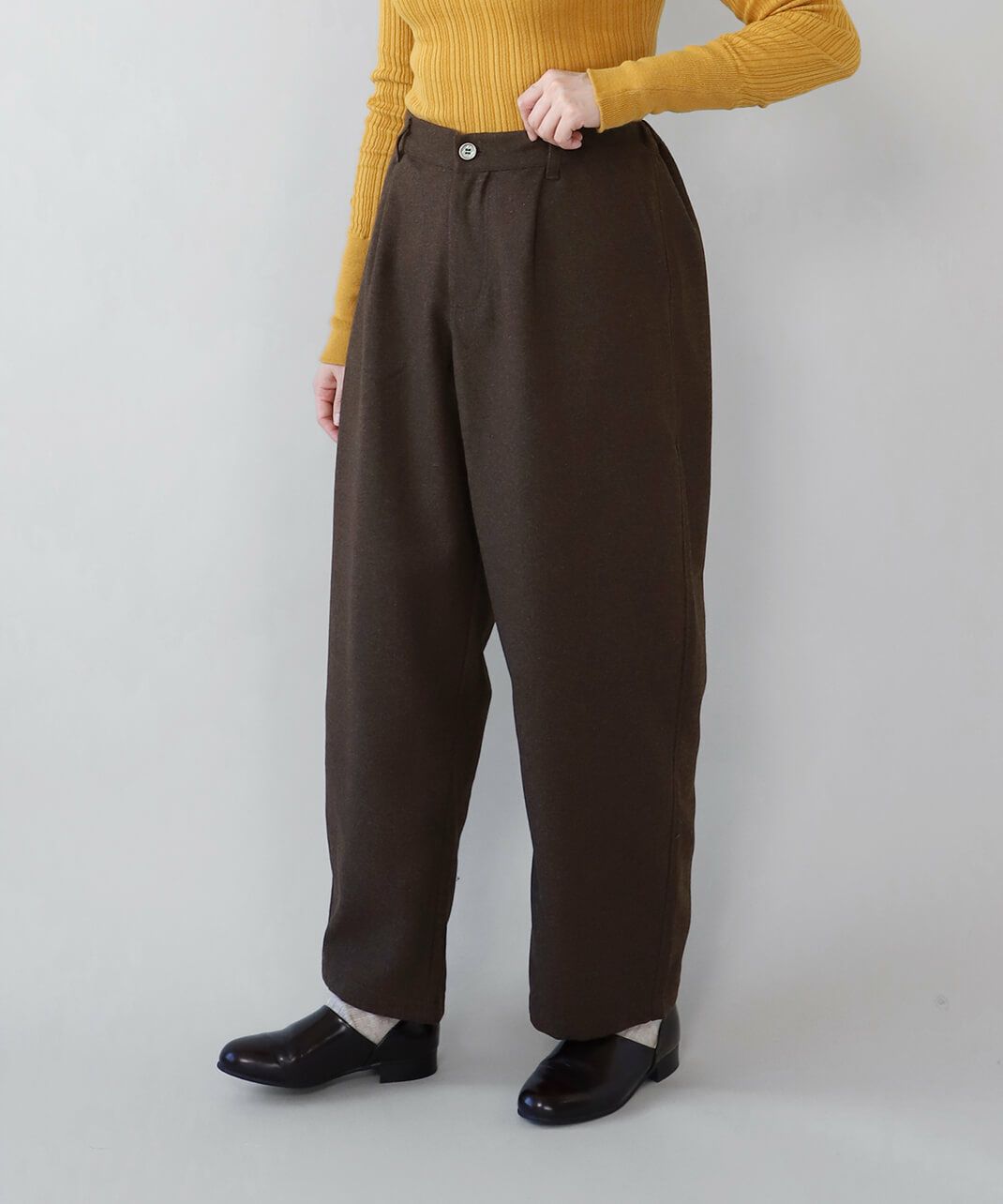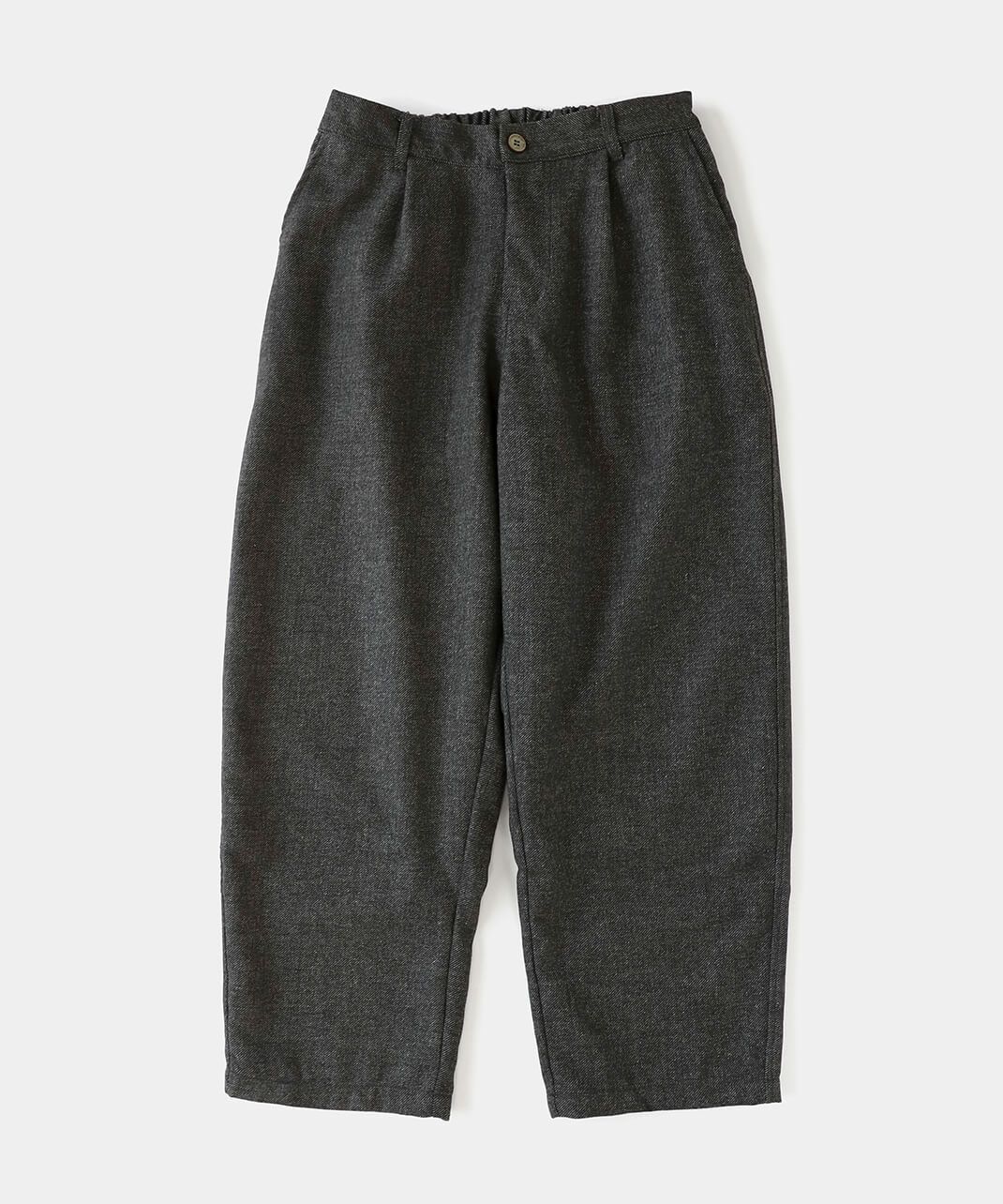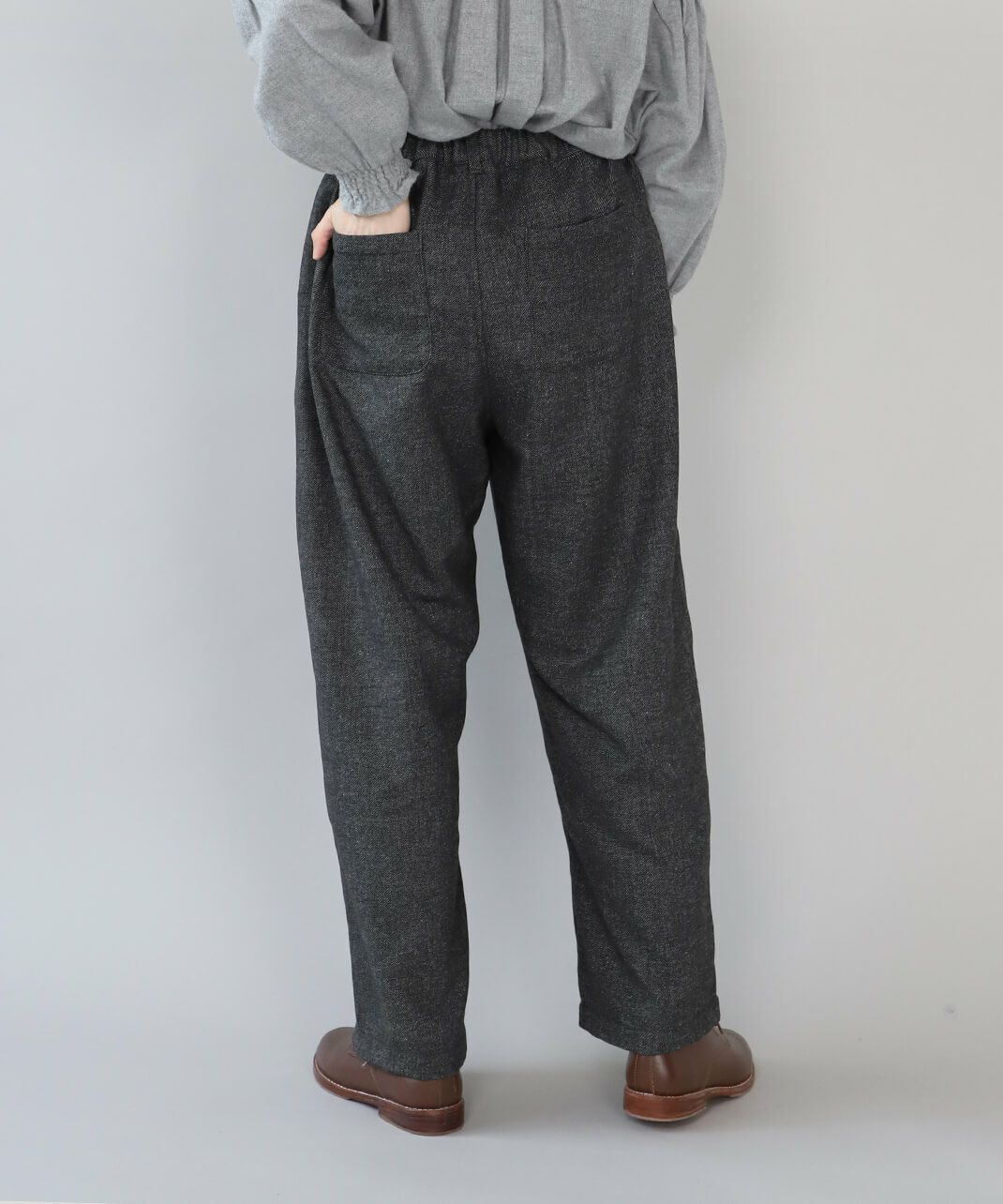 あたかみのあるツイードの風合いのウールミックス素材を使用したパンツです。裾に向けたテーパードシルエットですっきり見せてくれます。型崩れしにくくシワも寄りにくい素材で、裏地には高密度でハリがあるためちくちくしません。ウエストは後ろのみゴム仕様、ベルトループ付きのためジャストサイズで着用可能です。同素材のジャケットとのセットアップもおすすめです。