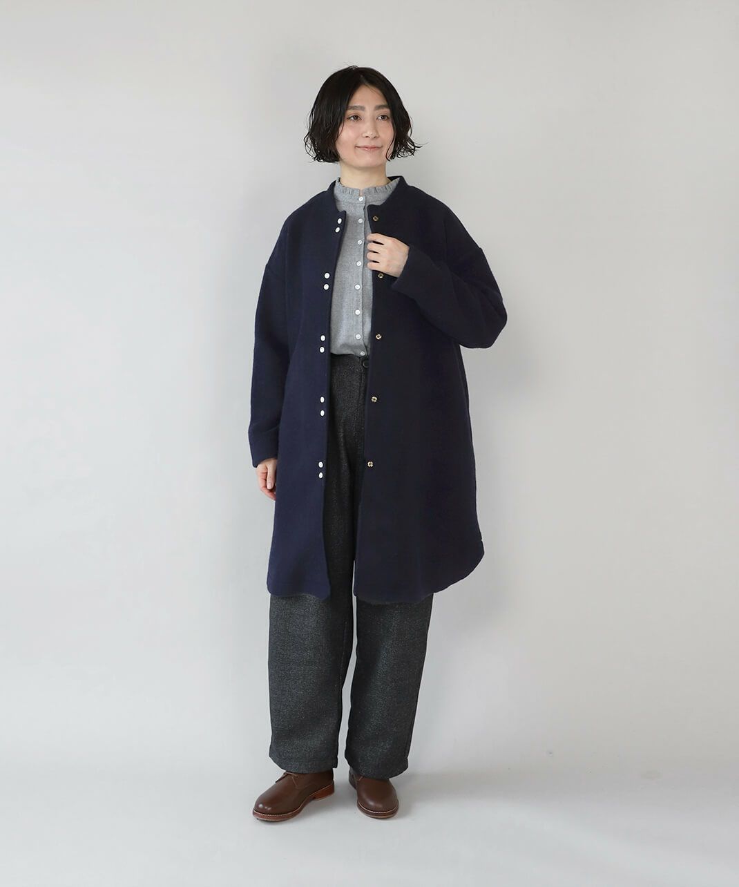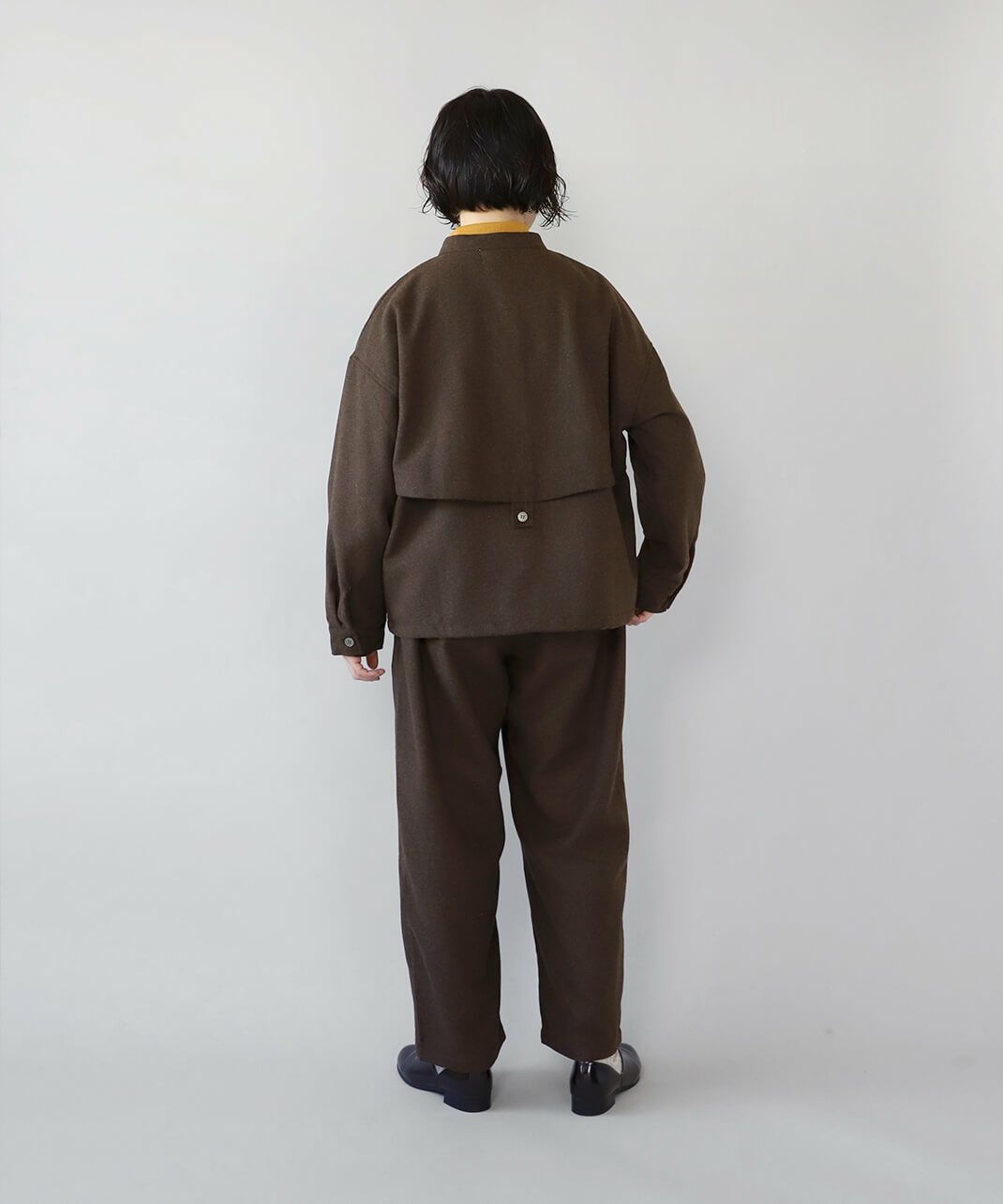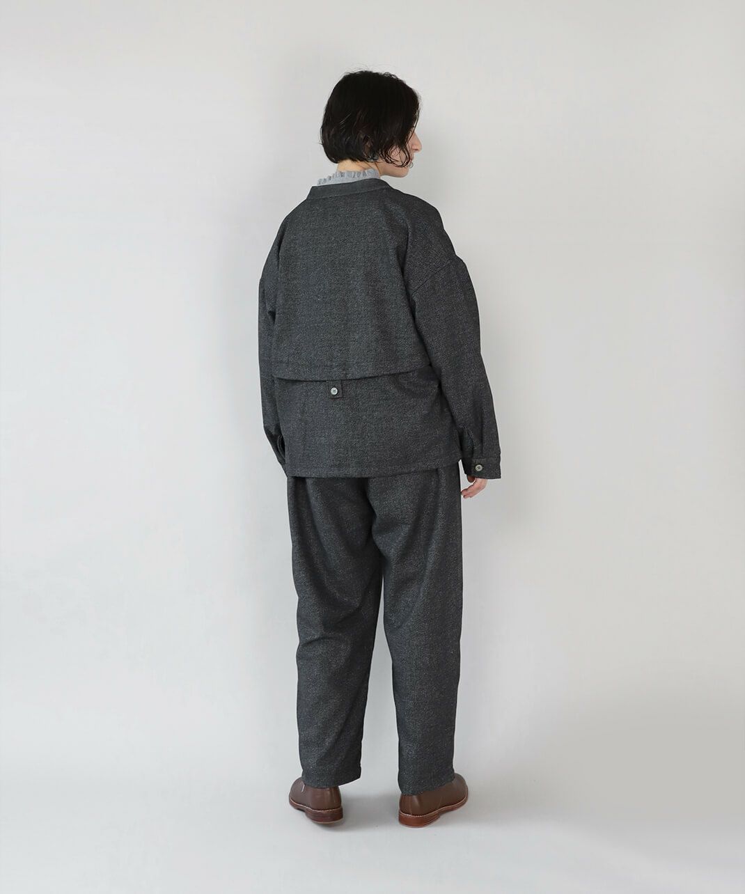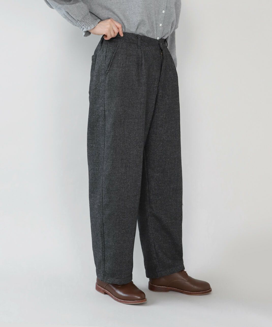あたかみのあるツイードの風合いのウールミックス素材を使用したパンツです。裾に向けたテーパードシルエットですっきり見せてくれます。型崩れしにくくシワも寄りにくい素材で、裏地には高密度でハリがあるためちくちくしません。ウエストは後ろのみゴム仕様、ベルトループ付きのためジャストサイズで着用可能です。同素材のジャケットとのセットアップもおすすめです。