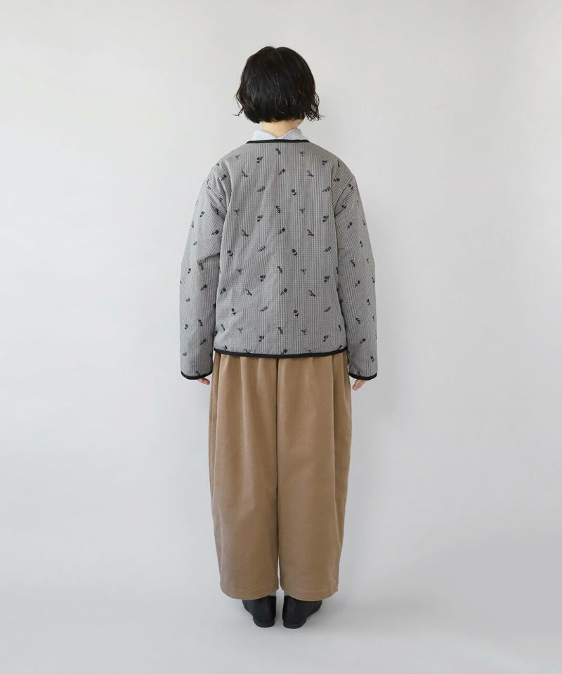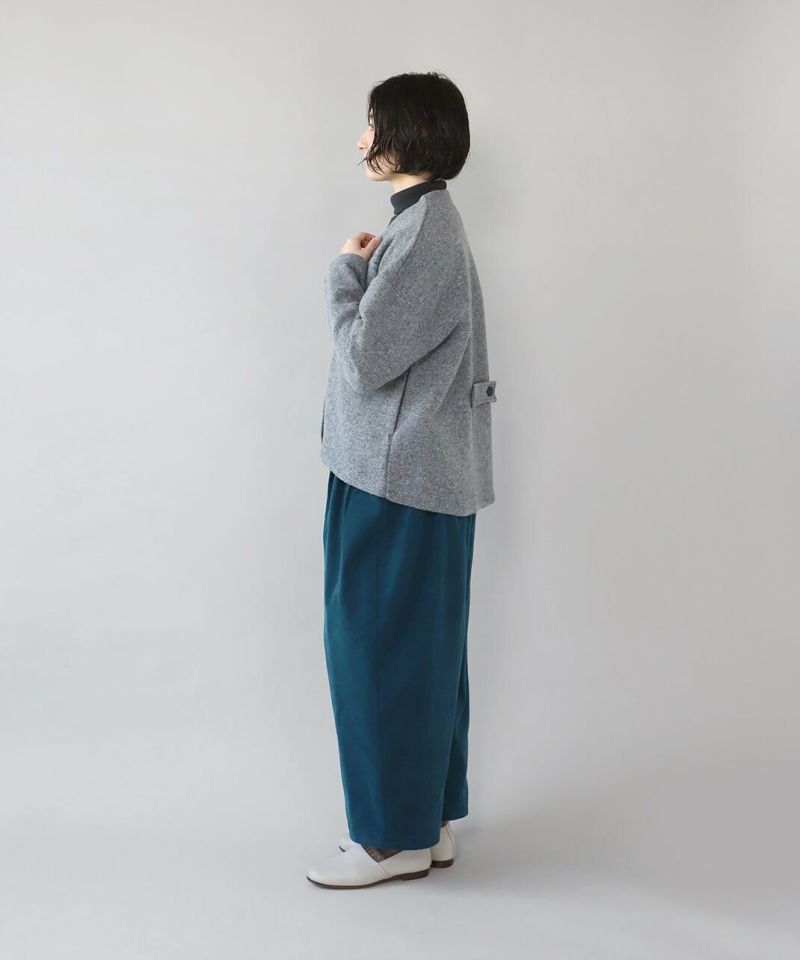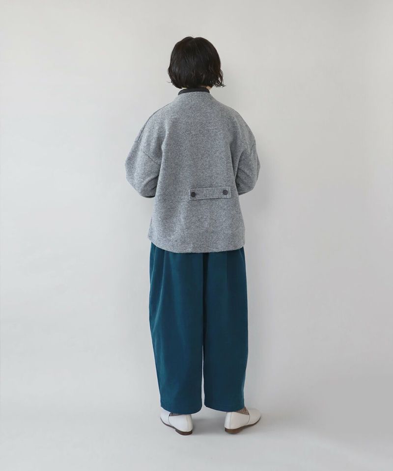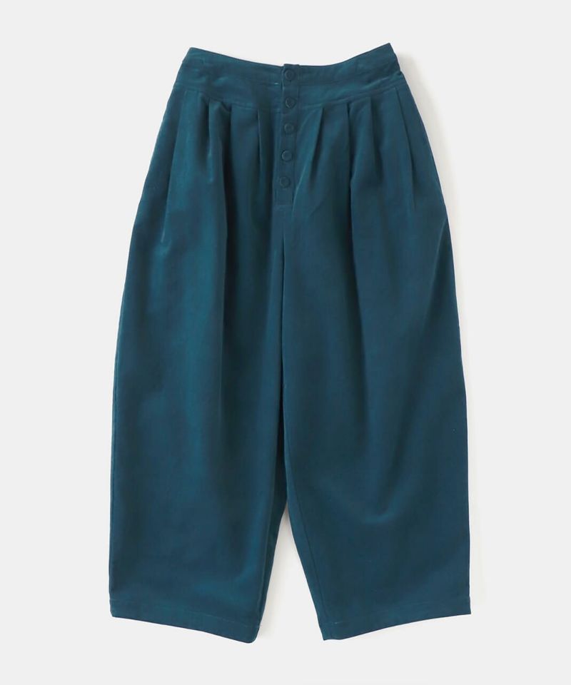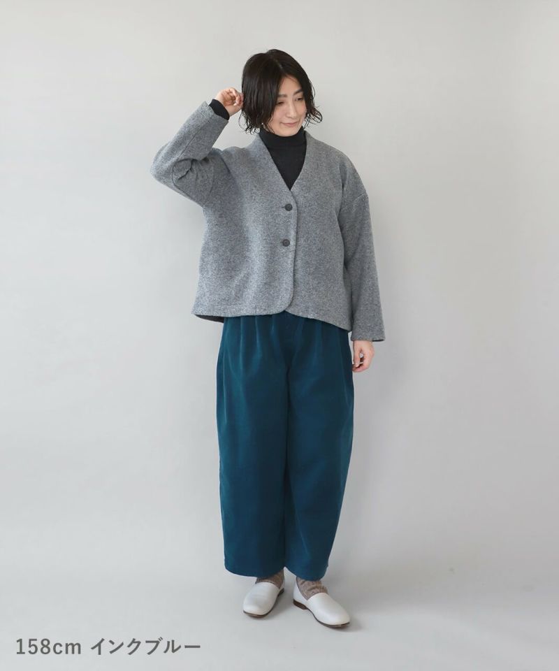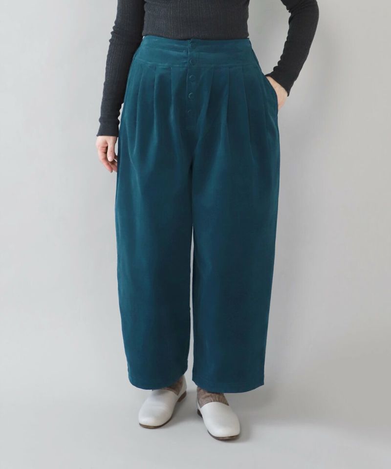 柔らかな風合いの細畝のコーデュロイ素材を使用したタックワイドパンツです。腰周りのタック切替えで、ゆるくテーパードかかったゆったりシルエットに。くるみボタンの前開きデザインで、トップスをインしたときもバランスよく決まります。細いコーデュロイと綺麗な色味が上品なスタイルを完成させてくれます。