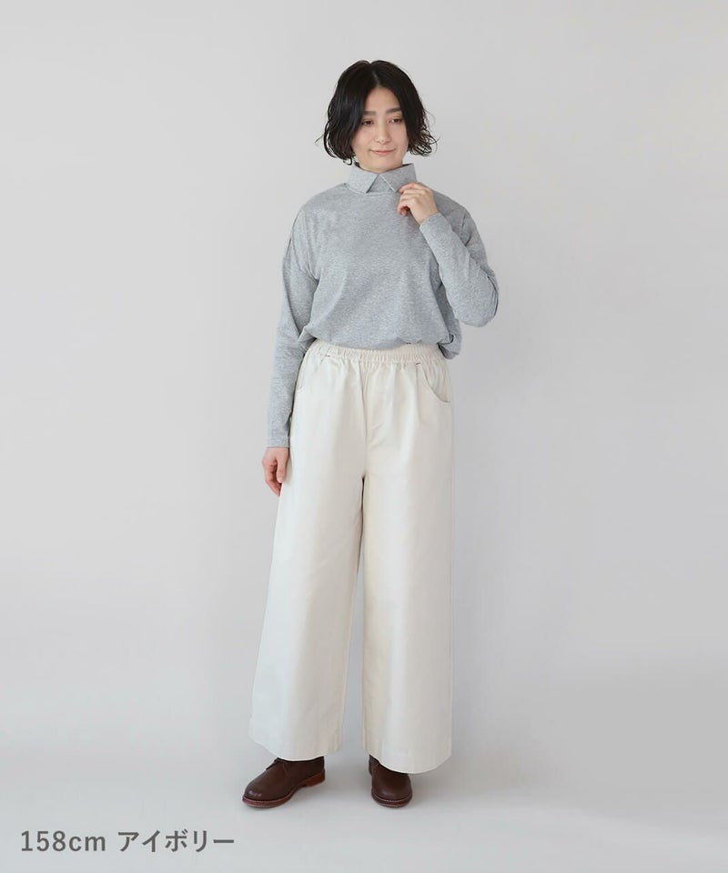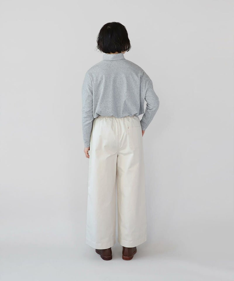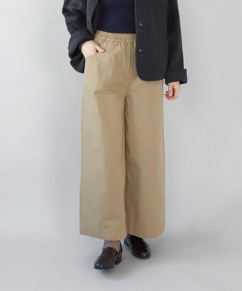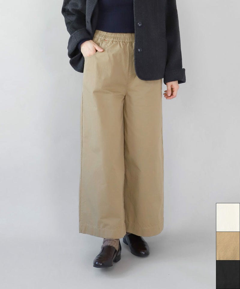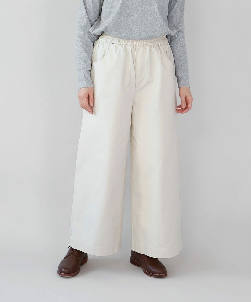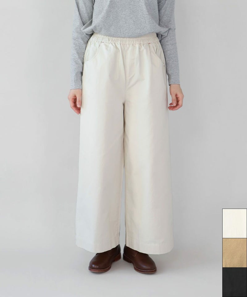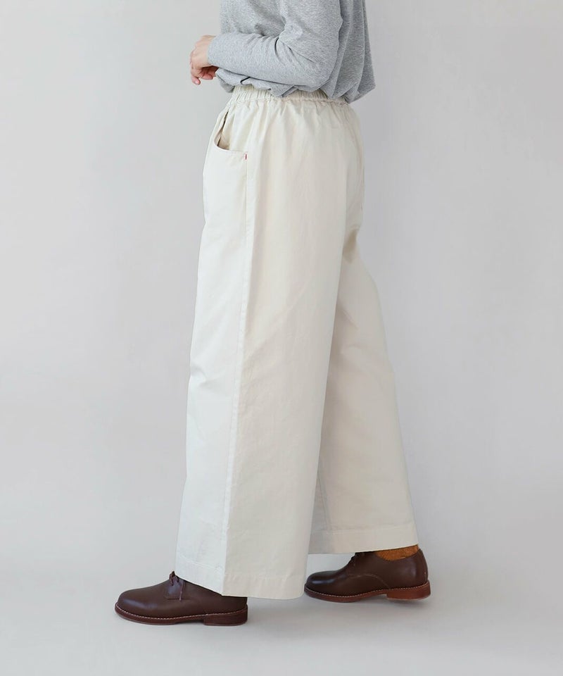 ほどよい厚みとハリのあるコットンのストレートギャザーパンツです。スタンダードなデザインは流行りに左右されにくく、どんなスタイルにも馴染みます。ウエストはゴム仕様でリラックスして過ごせます。チュニックやワンピースのインナーパンツとしてもおすすめ。ポケットの赤いステッチがポイントです。