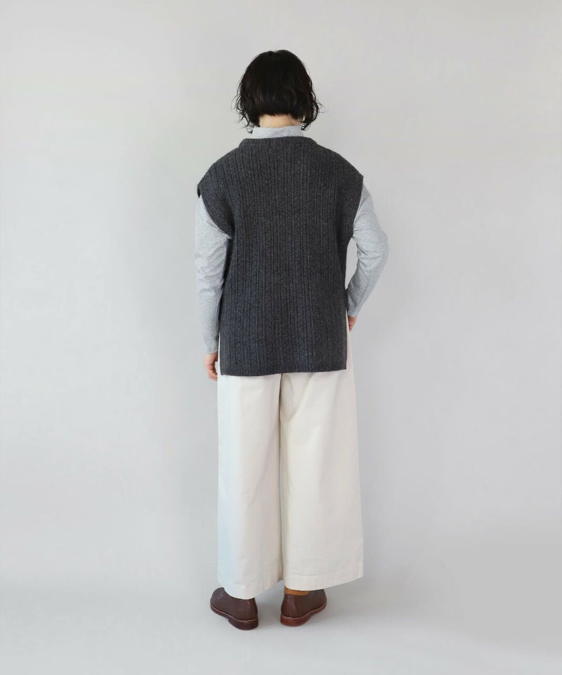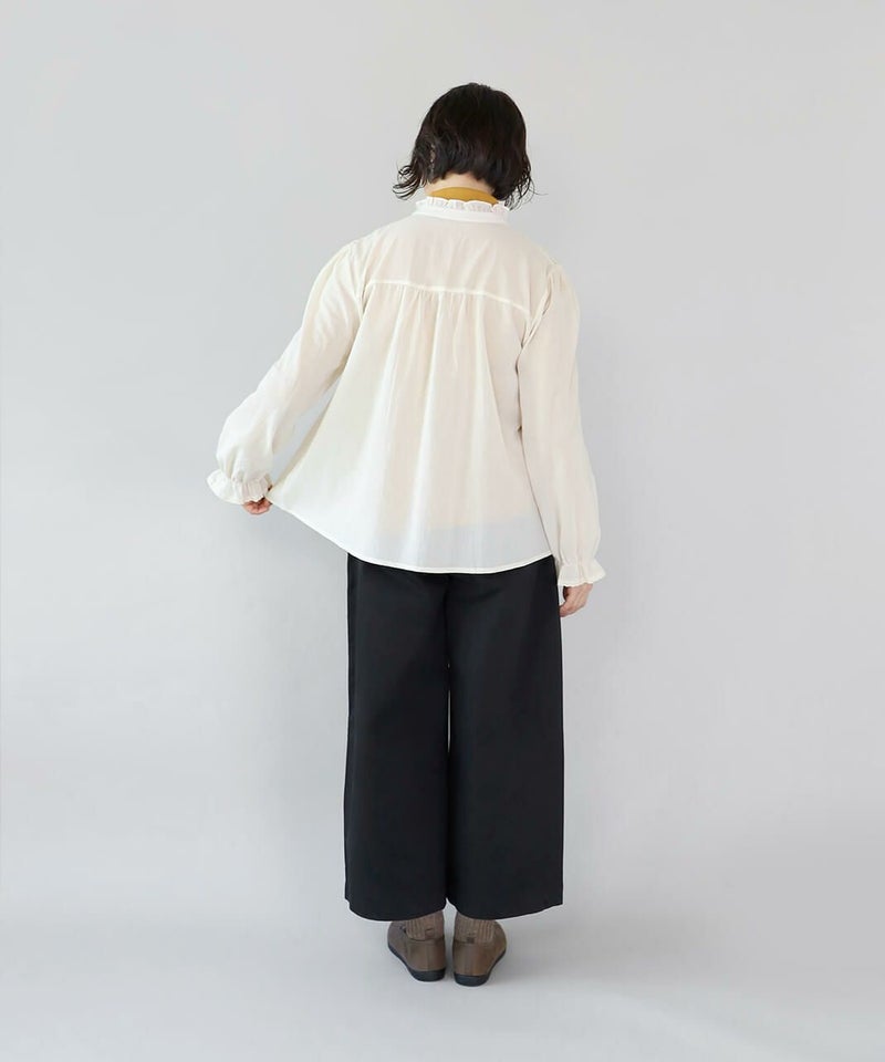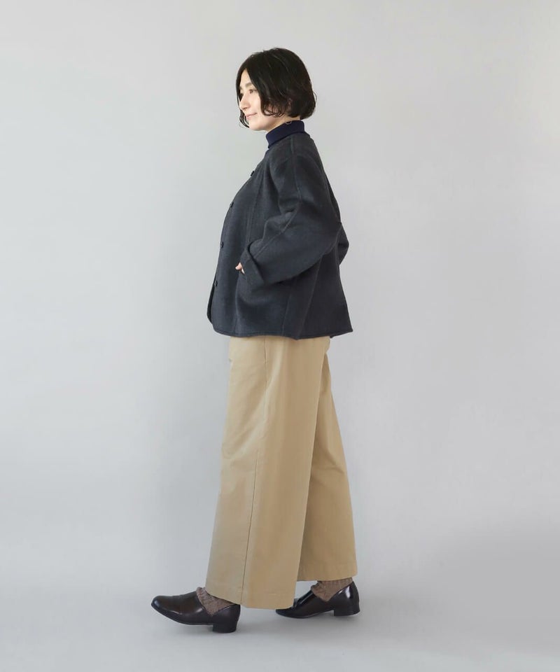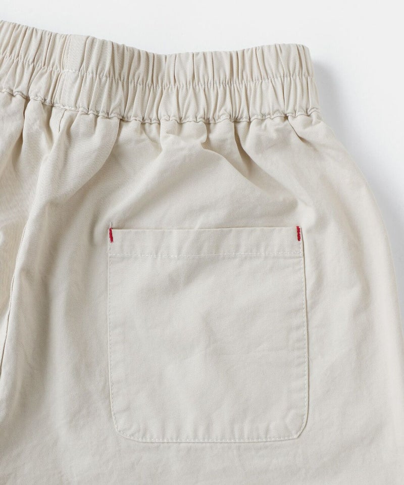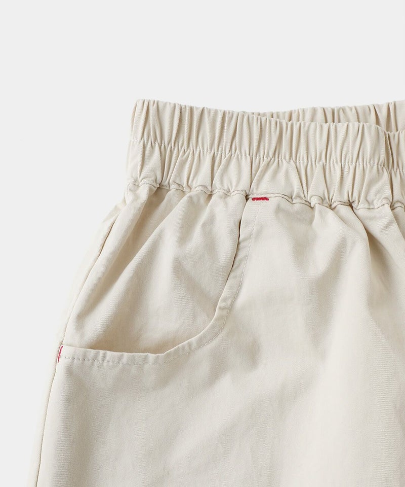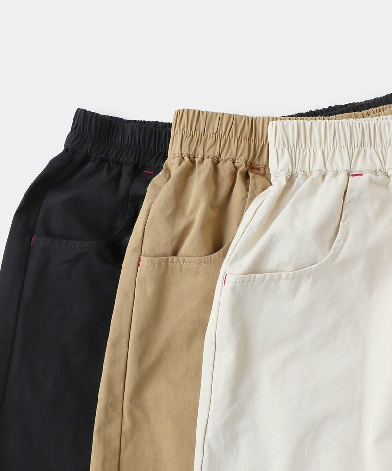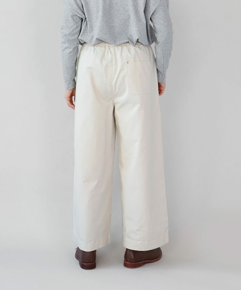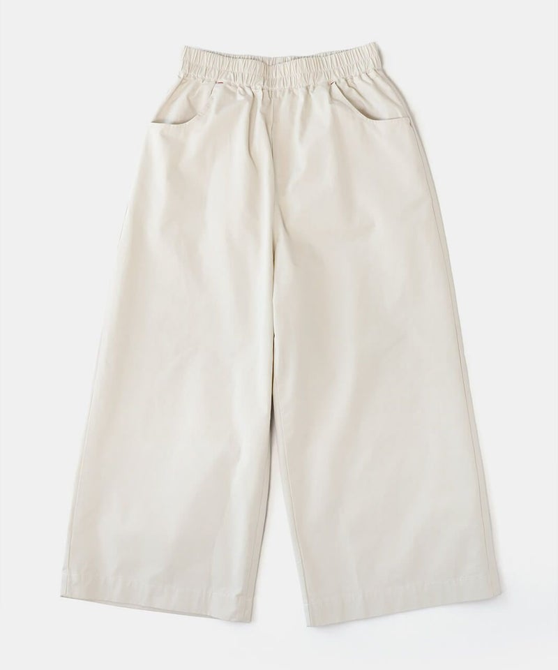 ほどよい厚みとハリのあるコットンのストレートギャザーパンツです。スタンダードなデザインは流行りに左右されにくく、どんなスタイルにも馴染みます。ウエストはゴム仕様でリラックスして過ごせます。チュニックやワンピースのインナーパンツとしてもおすすめ。ポケットの赤いステッチがポイントです。