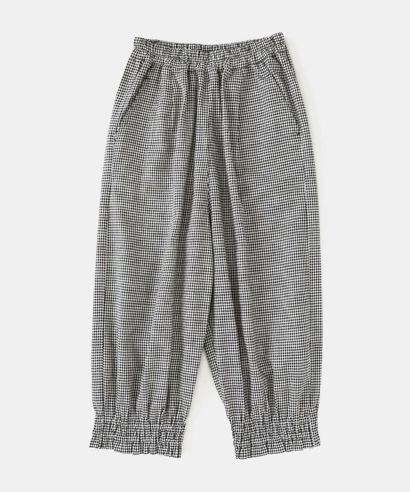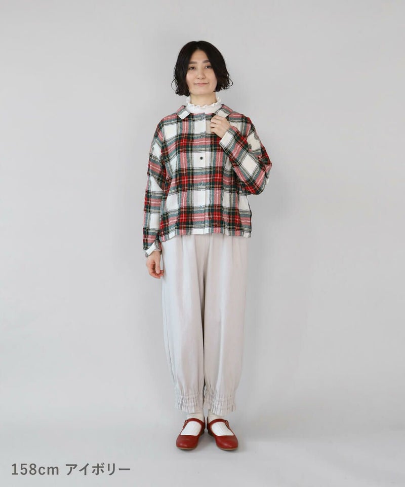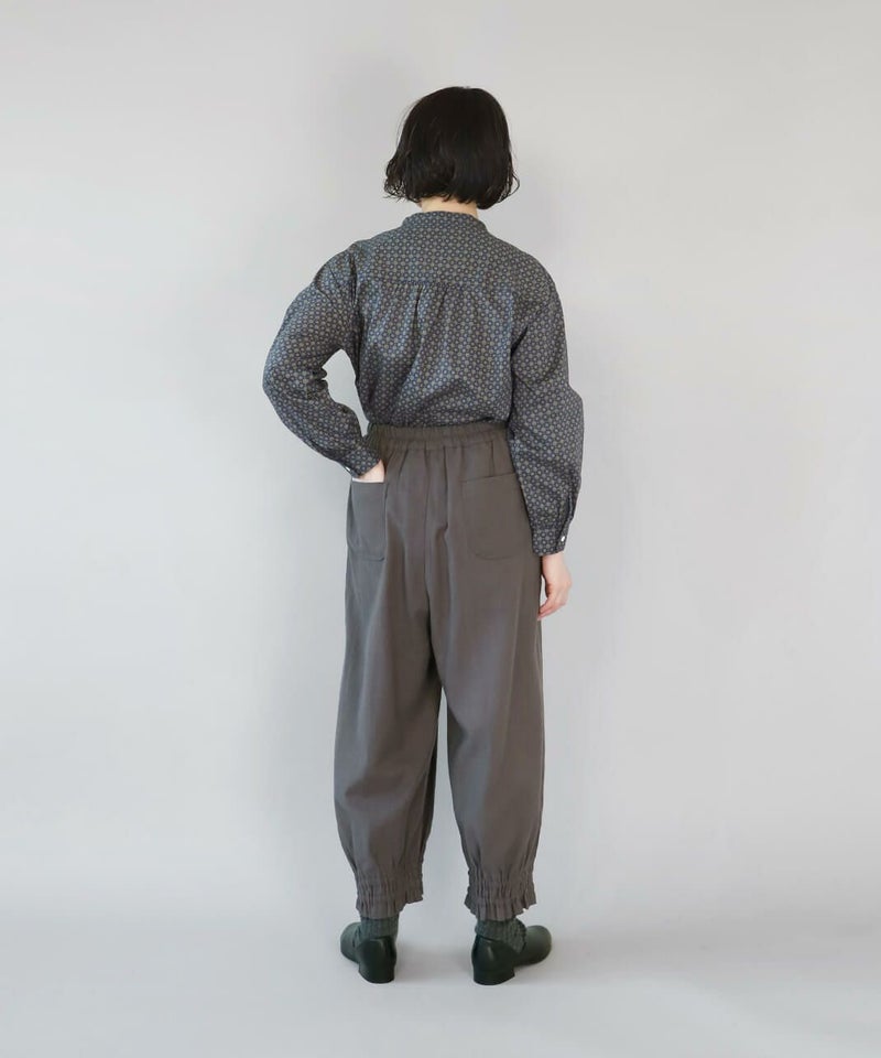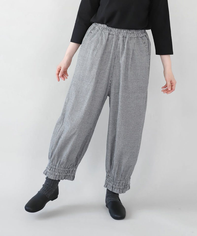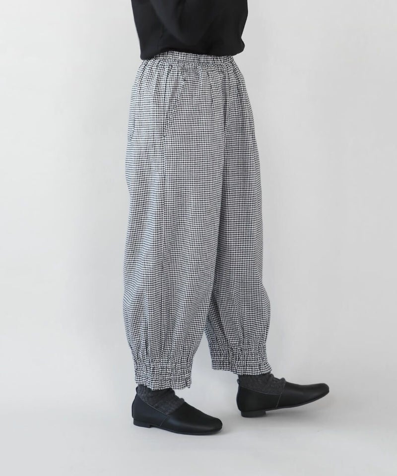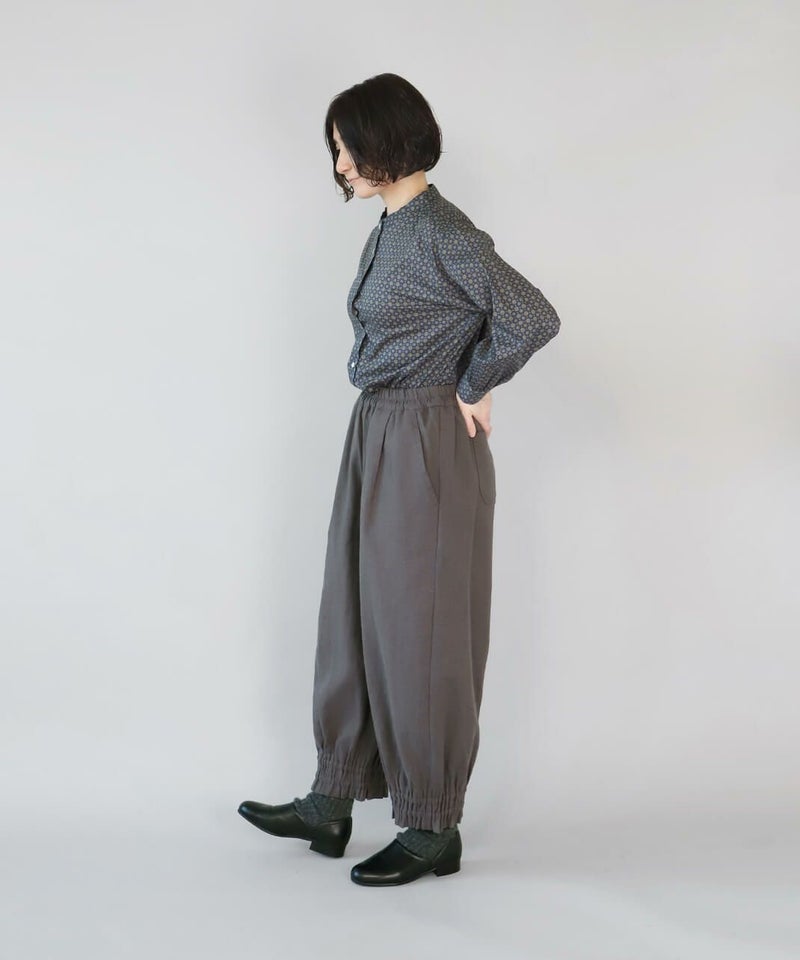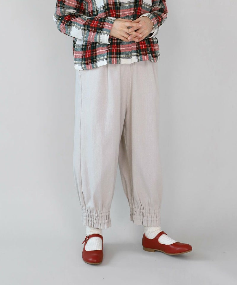 リネンと、落ち感のあるポリエステルとレーヨンをミックスした適度な厚みのツイル生地を使用したパンツです。裾にゴムシャーリングを施し、ふんわり丸みのあるサルエルシルエットの仕上がりです。ウエストはタック入りでゴム仕様のため、ゆったりリラックスした着心地。少し短めなので、もたつかず動きやすいのもポイントです。パンツとしてはもちろん、ワンピースやチュニックのぺチパンツとしてもおすすめです。丈夫でシワになりにくく日常使いに活躍します。