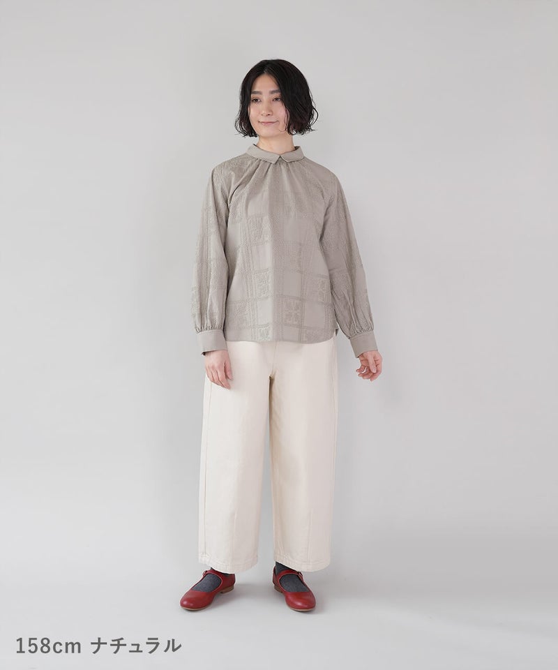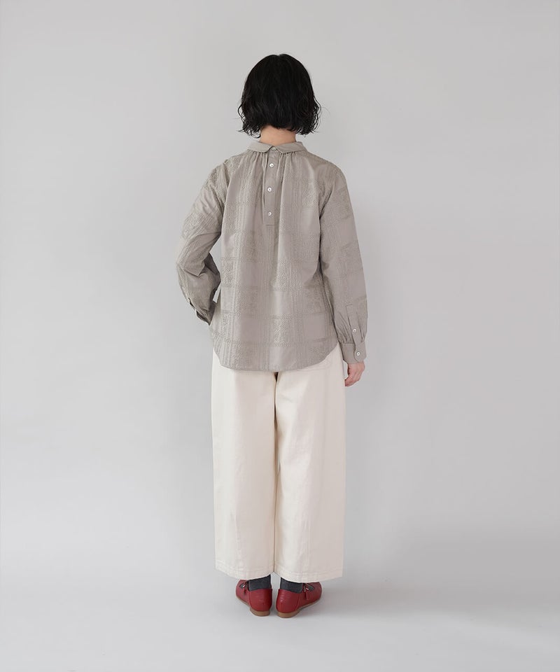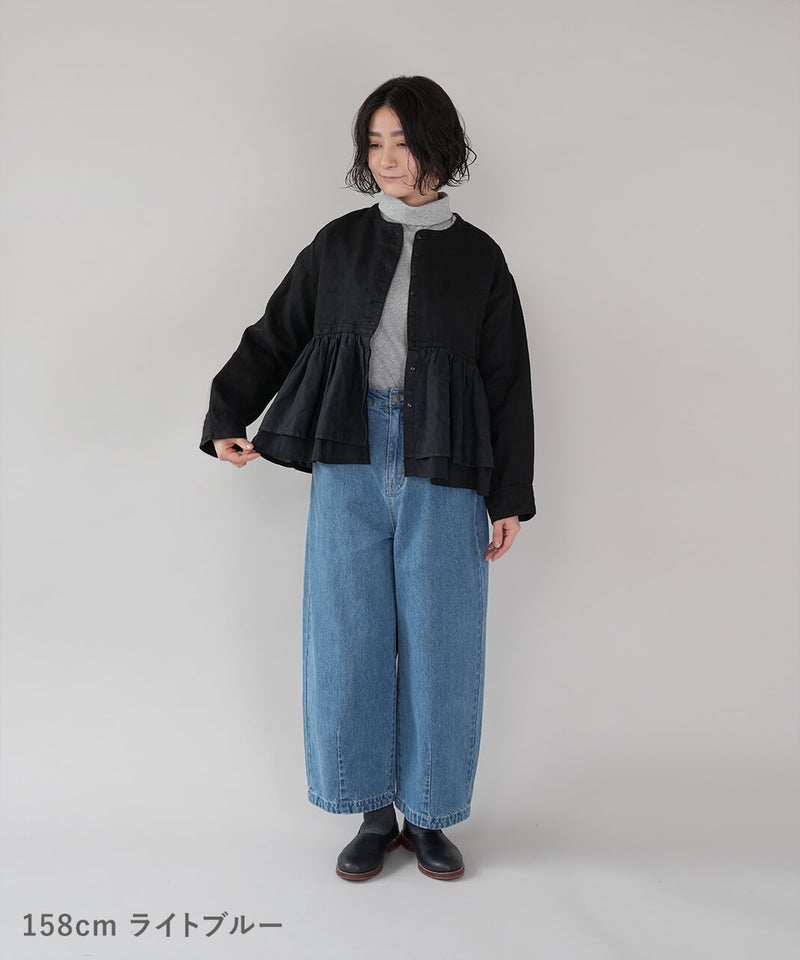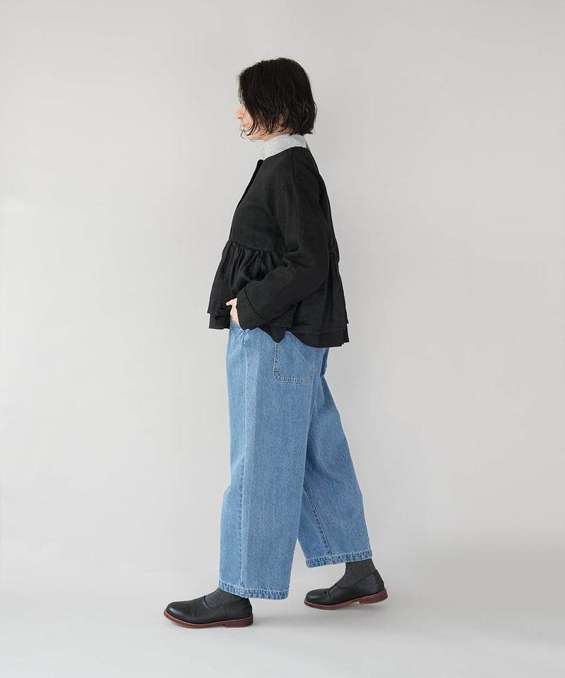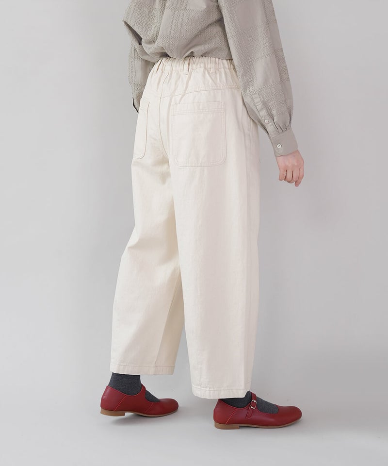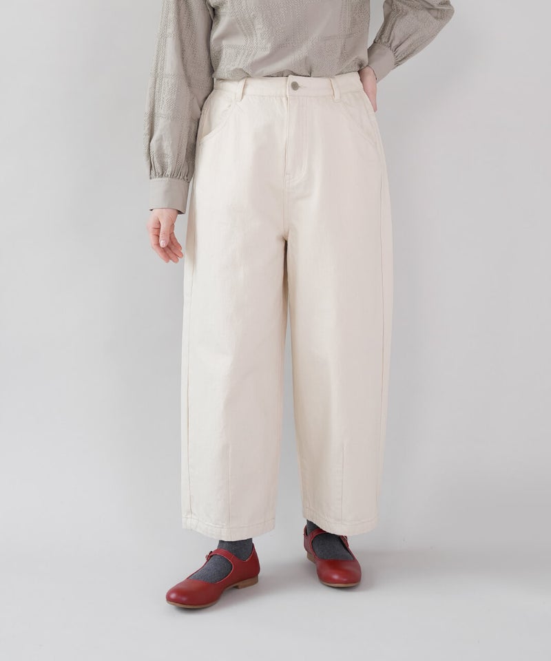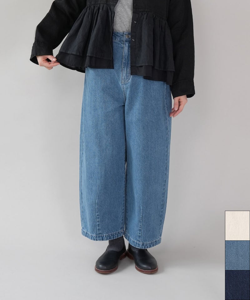 ほどよい厚みの10オンスデニムを使用したカーブパンツです 。裾にダーツが入ることで、立体的で丸みのあるワイドシルエットに仕上がっています。ウエストの後ろはゴム仕様でリラックスした着心地。ハイウエストデザインなので、シャツやインナーをインするスタイルもおすすめです。日常使いがしやすく、季節も問わず楽しめる1着です。