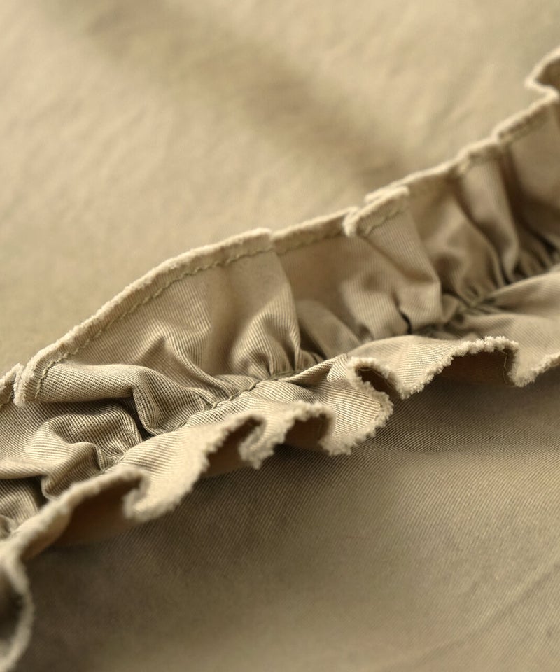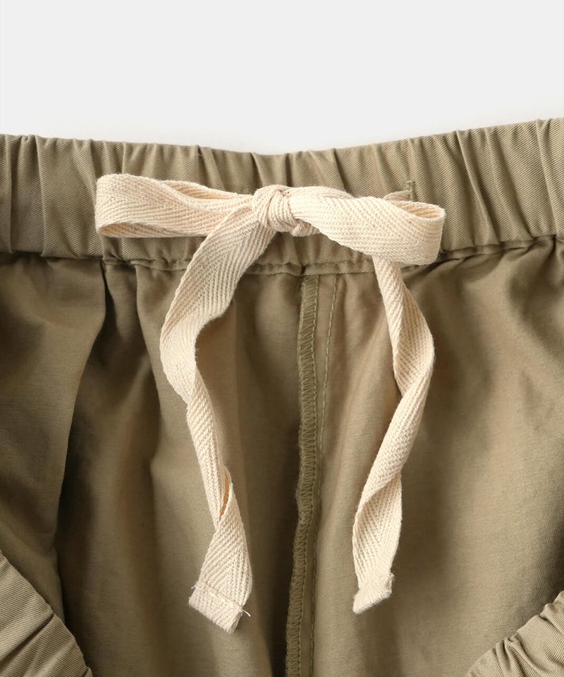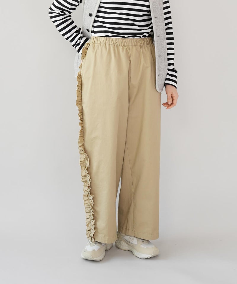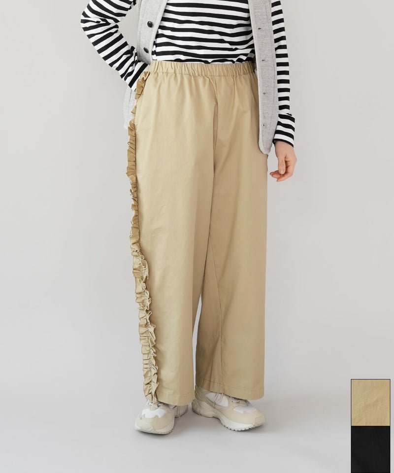 軽くてほどよいハリのあるコットンツイル生地を使用したワイドパンツです。サイドラインに立体感のある同色のフリルが施され、さりげない華やかさがある1着です。季節を問わず、デイリーに着まわせる丈夫な生地感が嬉しいポイント。ウエストは総ゴム仕様で内紐付きのためジャストサイズで着用可能です。甘すぎないので、コーディネートに取り入れやすデザインです。