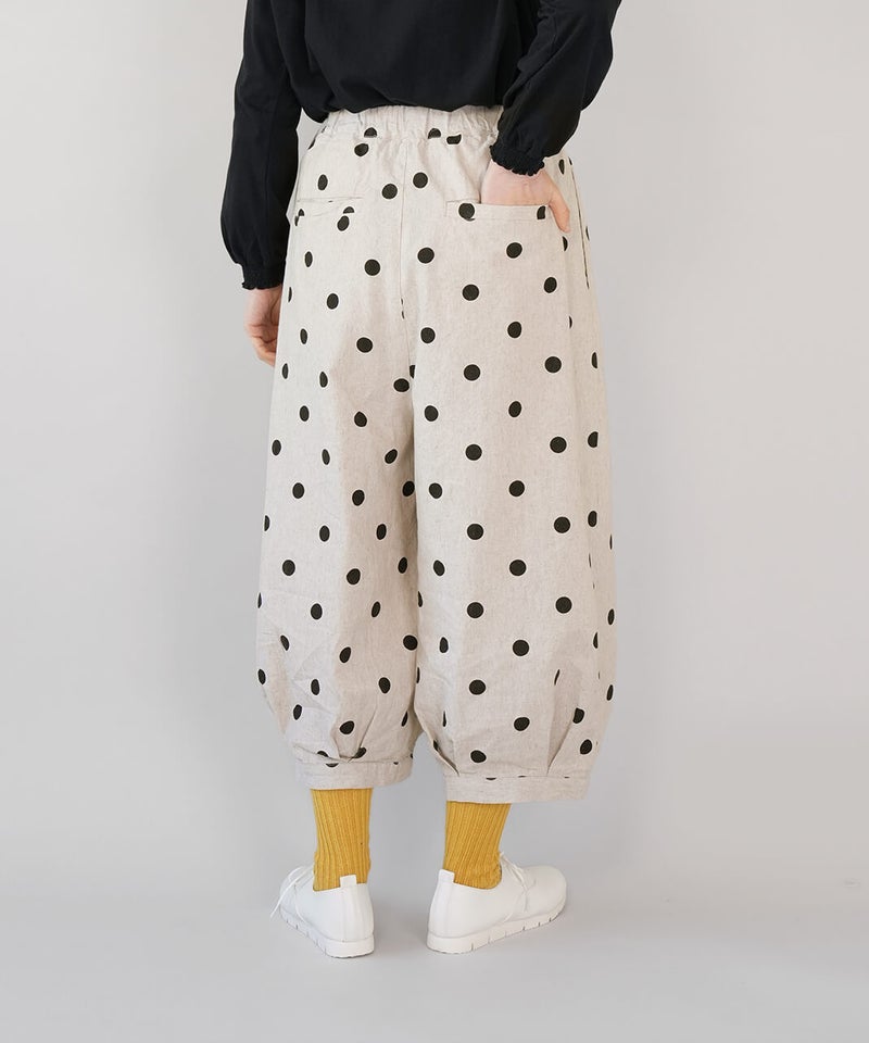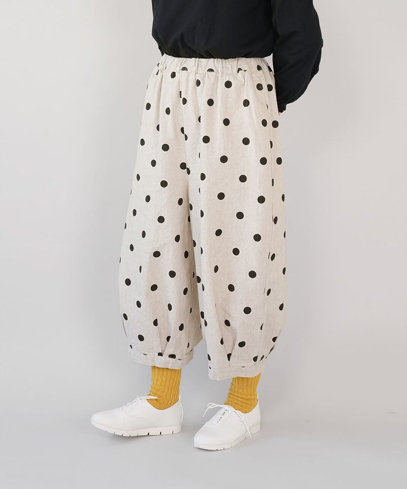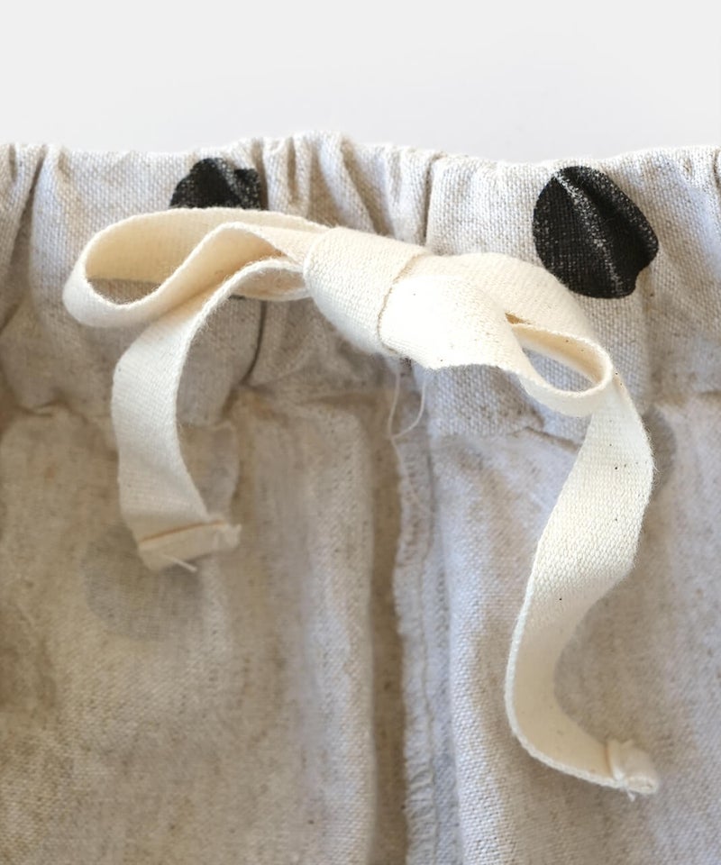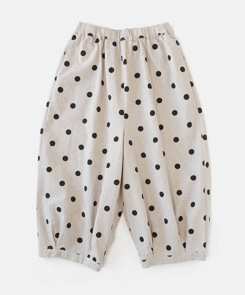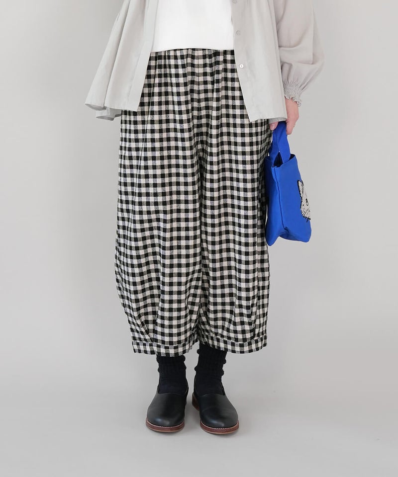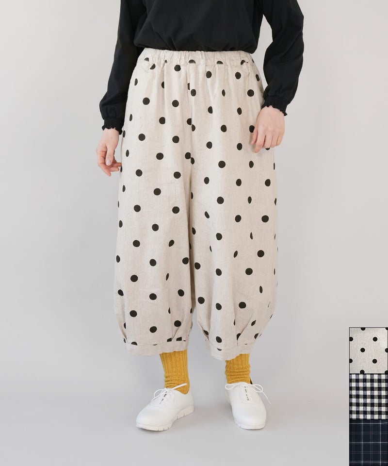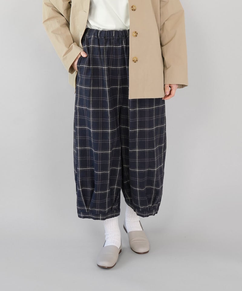 通気性のよいコットンリネンを使用したパンツです。裾のタックが自然な丸みを作るコクーンシルエット。足のラインを拾わず、ゆったりとした着心地です。ウエストはゴム仕様で内紐つきのためジャストサイズで着用可能です。柄もそれぞれ使いやすく、色違いで揃えるのもおすすめです。