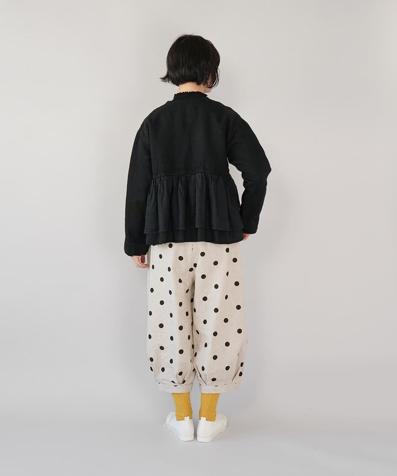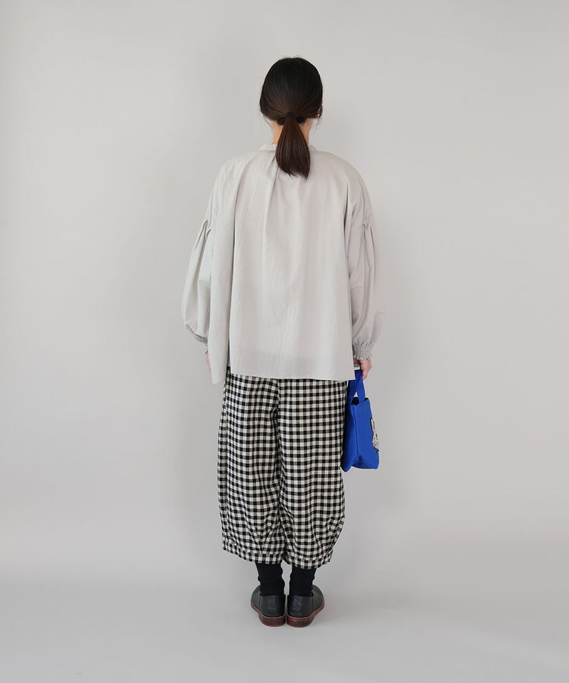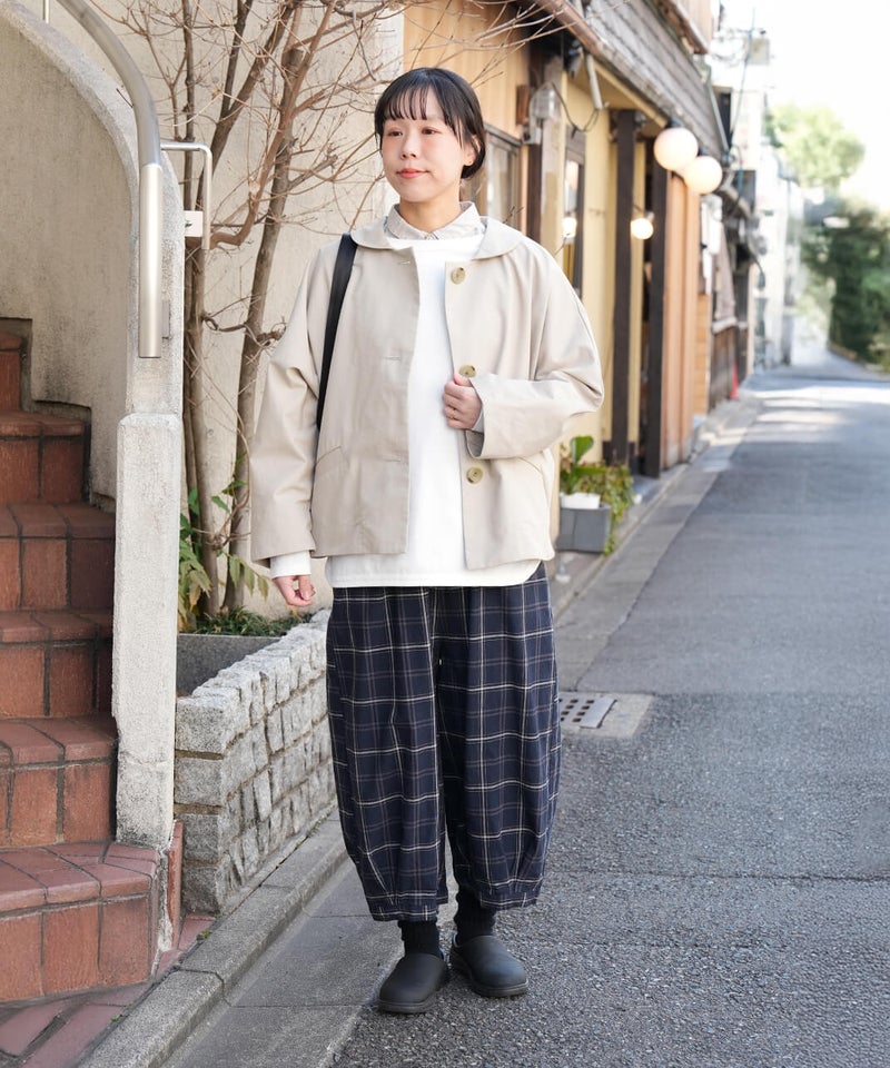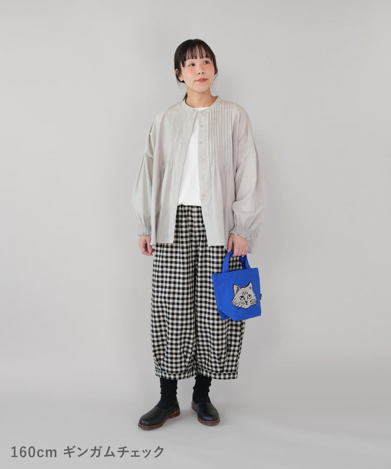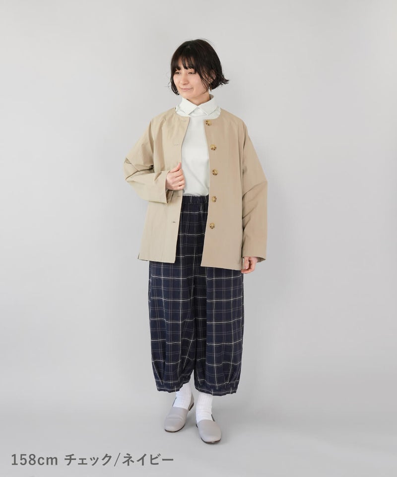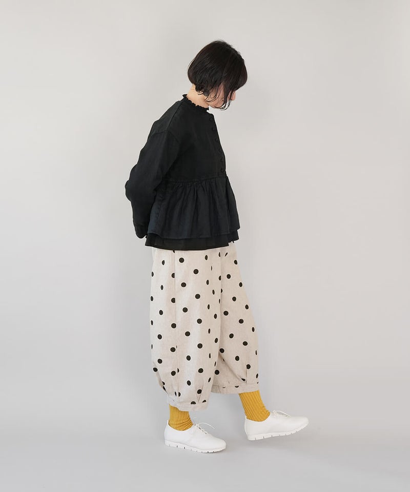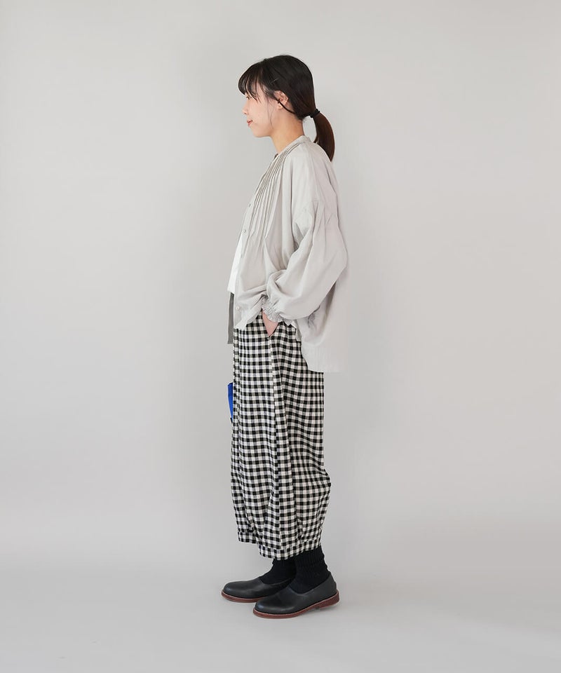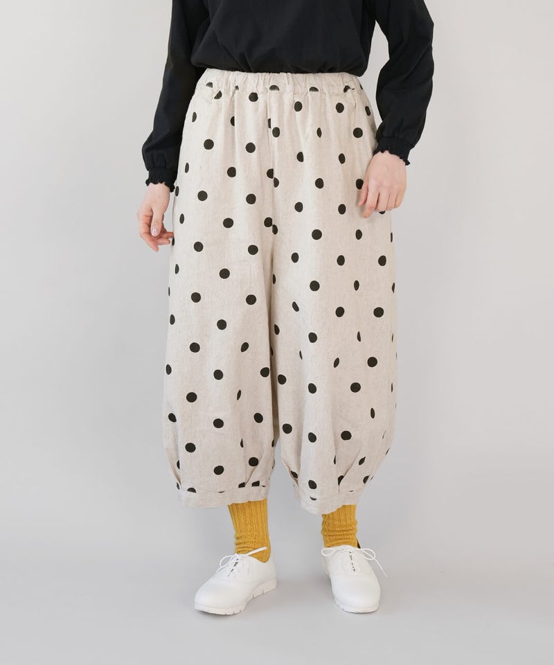 通気性のよいコットンリネンを使用したパンツです。裾のタックが自然な丸みを作るコクーンシルエット。足のラインを拾わず、ゆったりとした着心地です。ウエストはゴム仕様で内紐つきのためジャストサイズで着用可能です。柄もそれぞれ使いやすく、色違いで揃えるのもおすすめです。
