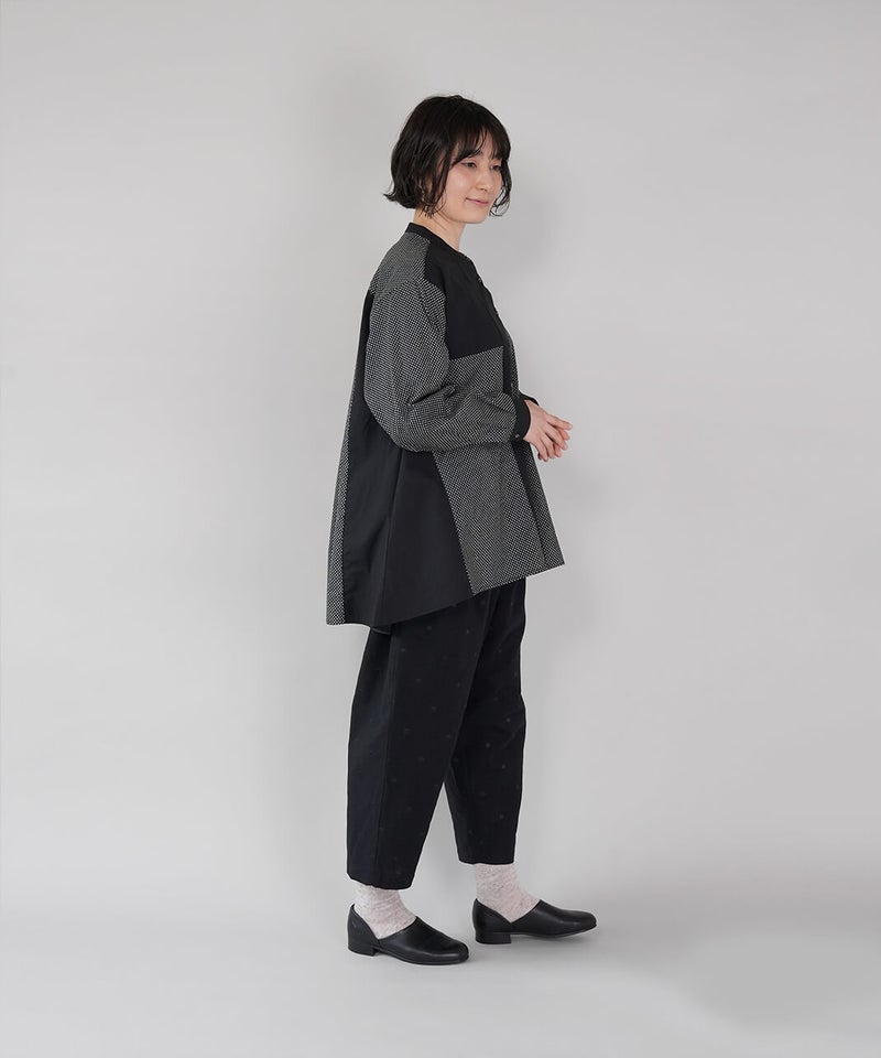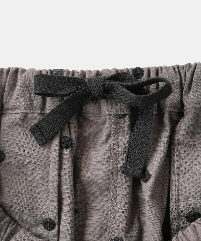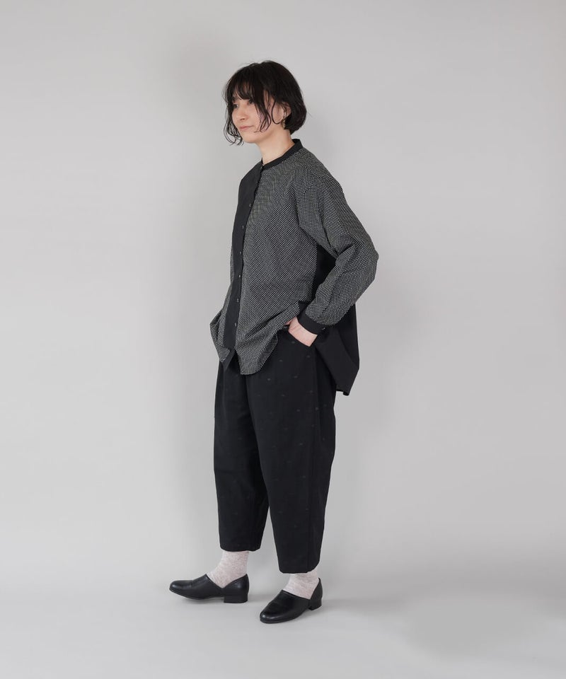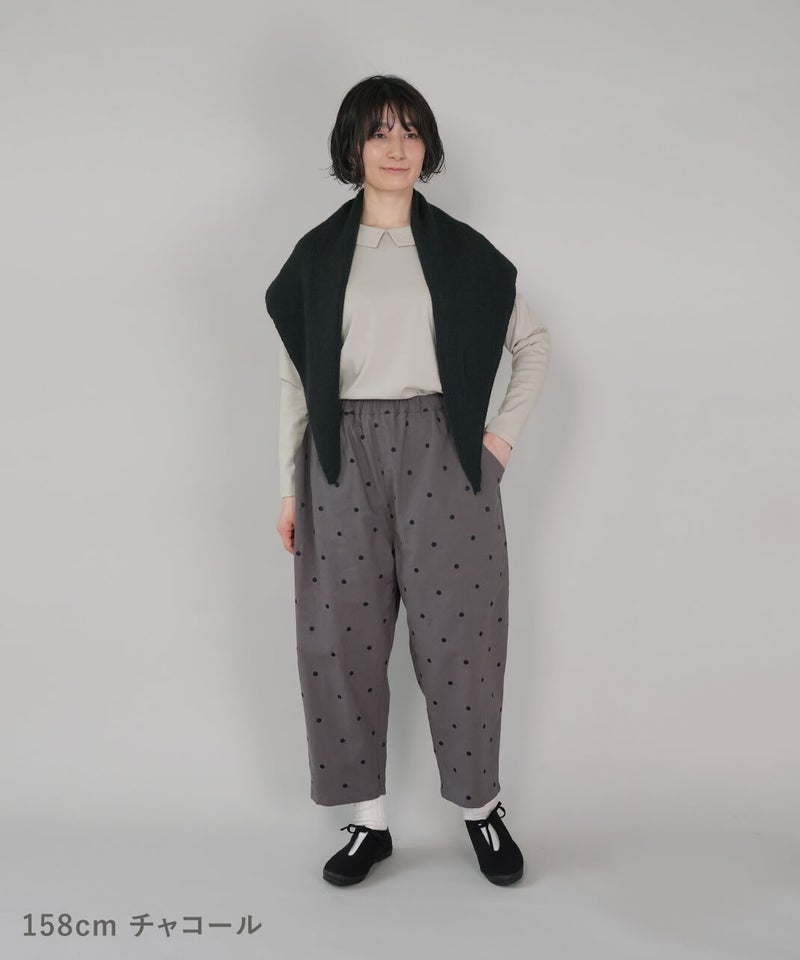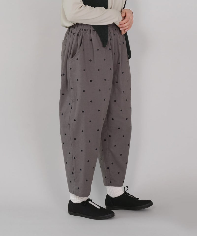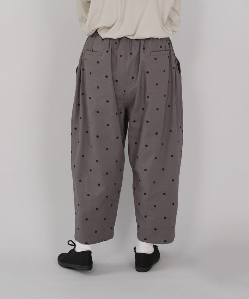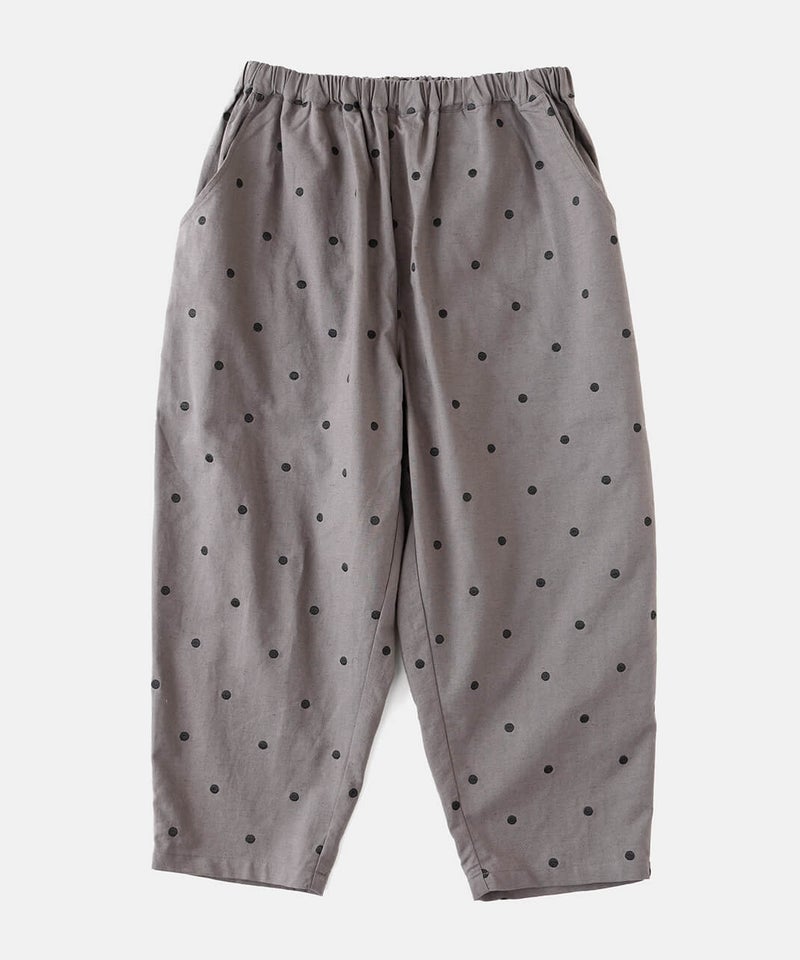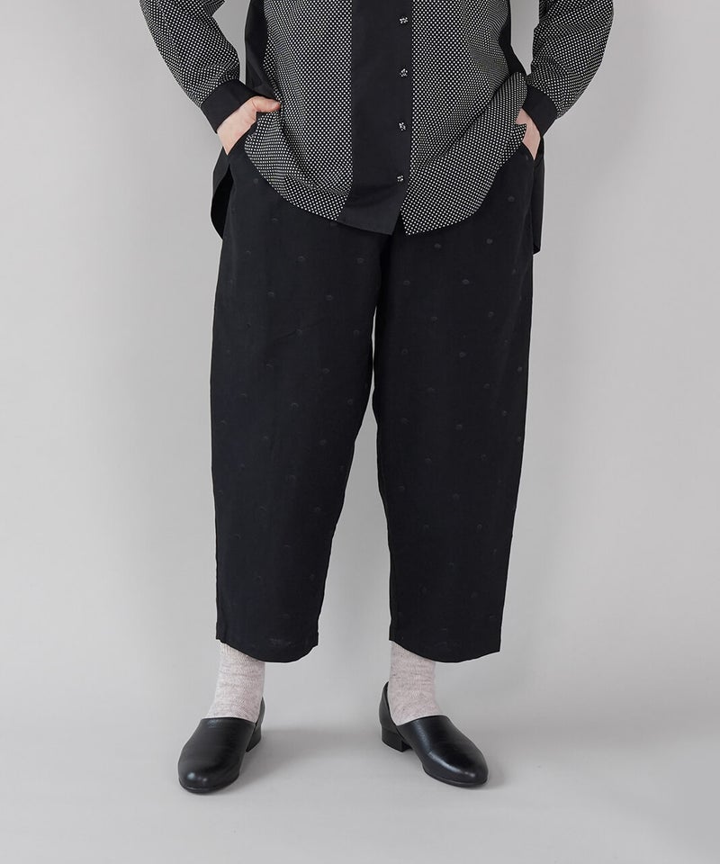 さらりとした清涼感のあるコットンリネン生地を使用したパンツです。ウエストがぐんと伸びる、ista-ire定番のデザインです。ストレスのない快適なはき心地です。太ももまわりにはほどよくゆとりを持たせ、裾にかけて緩やかに細くなるテーパードシルエット。すっきりとしたアンクル丈で、いろいろなトップスとバランスよく合わせられます。シックなドット柄は落ち着いた印象の中にさりげないアクセントを添えてくれる1着です。