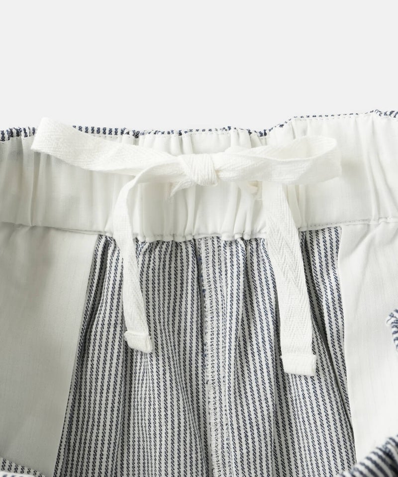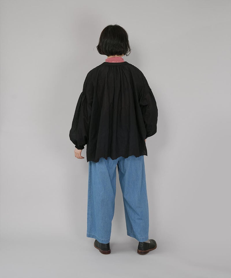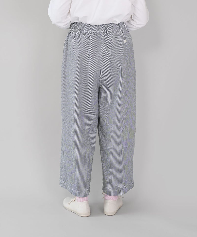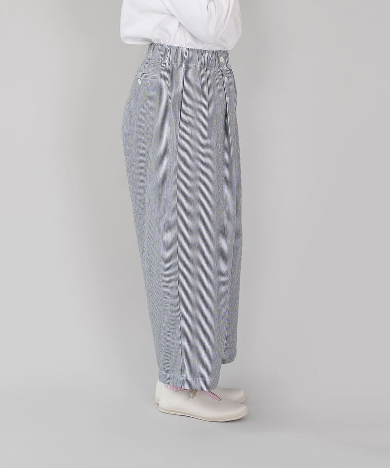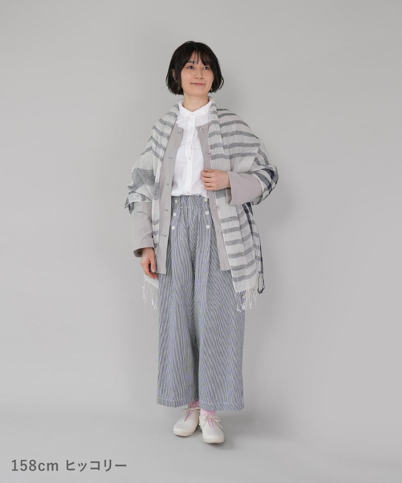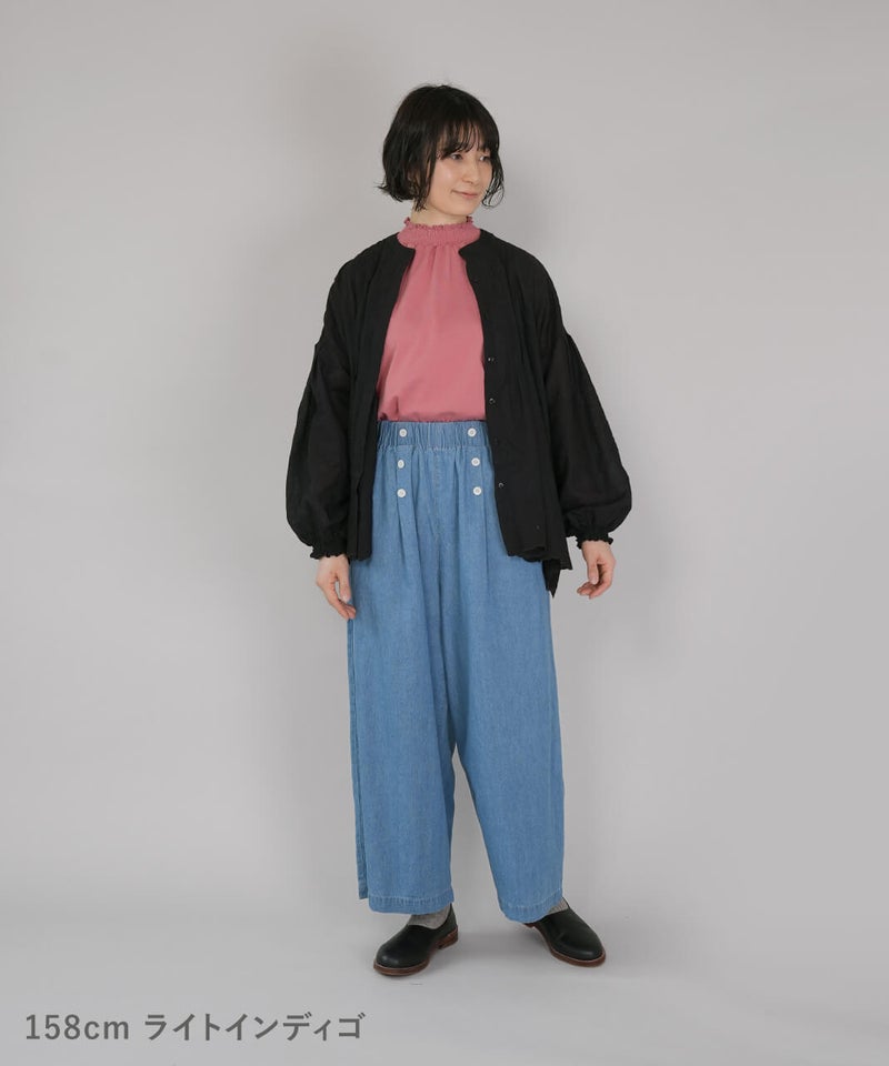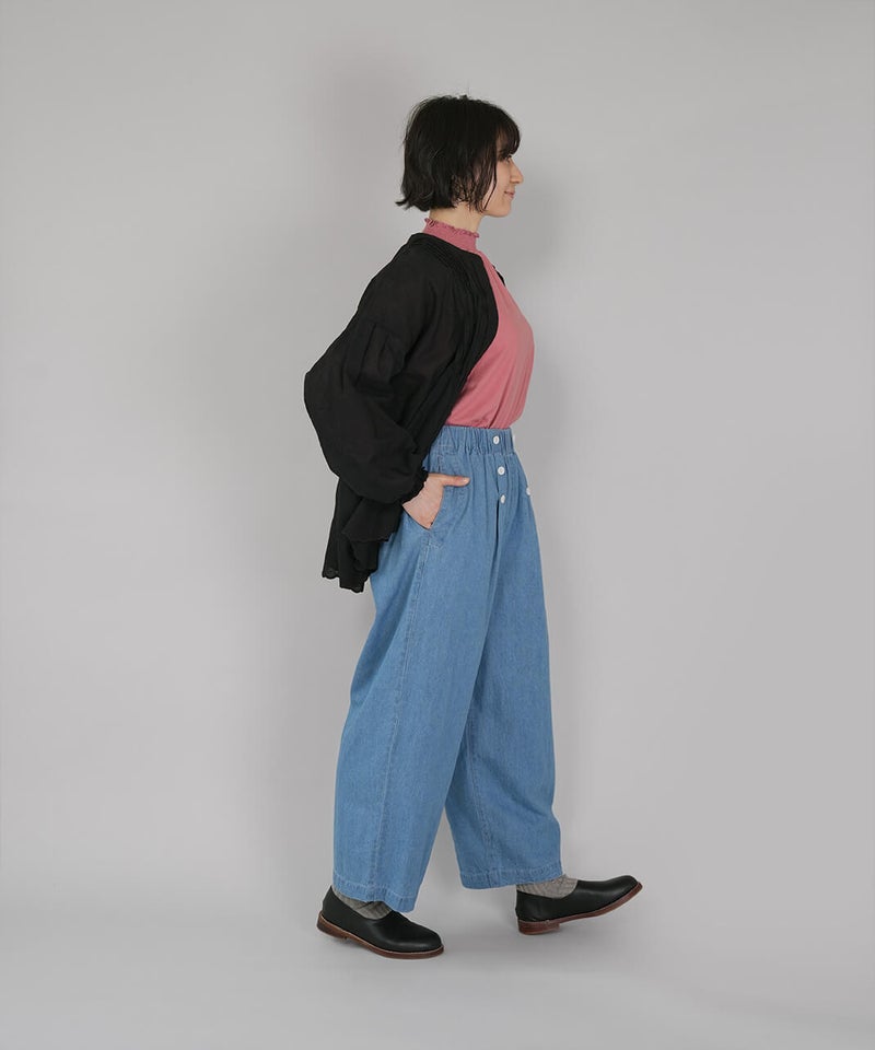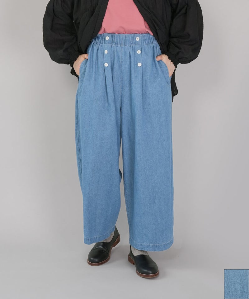吸水性と耐久性に優れたコットンリネンデニム素材を使用したパンツです。フロントのダブルボタンが印象的なセーラーパンツデザインが、装いのアクセントになる1着です。ウエストはゴム仕様に内紐付きで、リラックス感がありながらも安定したはき心地に仕上がっています。トップスをインして、ボタンディテールを活かしたスタイリングがおすすめです。※染料の特性上、色落ちや色移りが生じる場合がございます。お取り扱いにはご注意ください。※天然素材のため、生地表面にネップ(糸の節)が見られる場合がございます。織り傷ではございませんので、素材の風合いとしてお楽しみください。