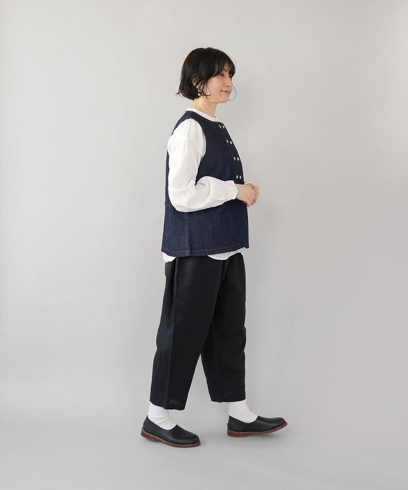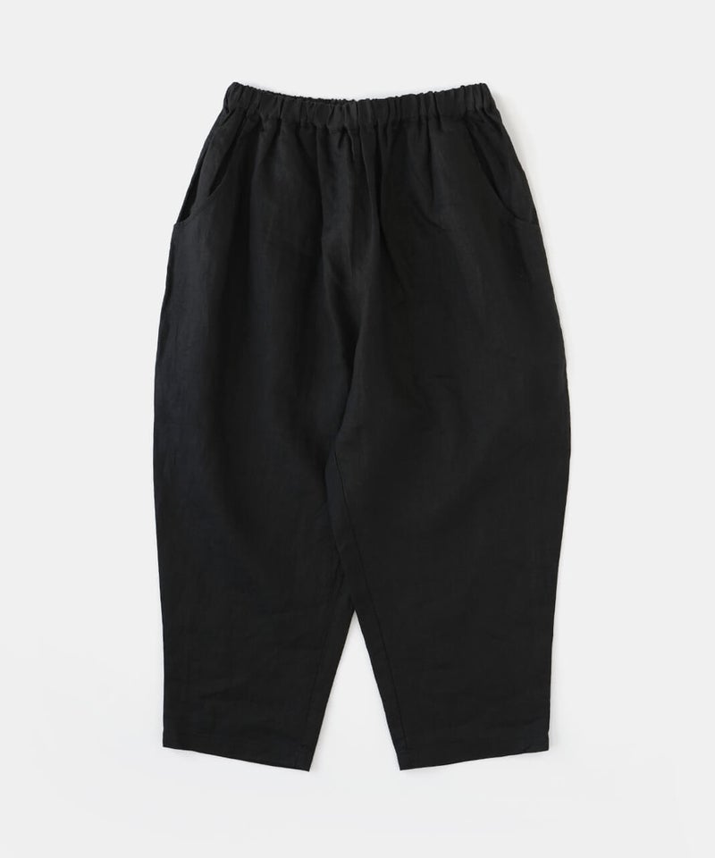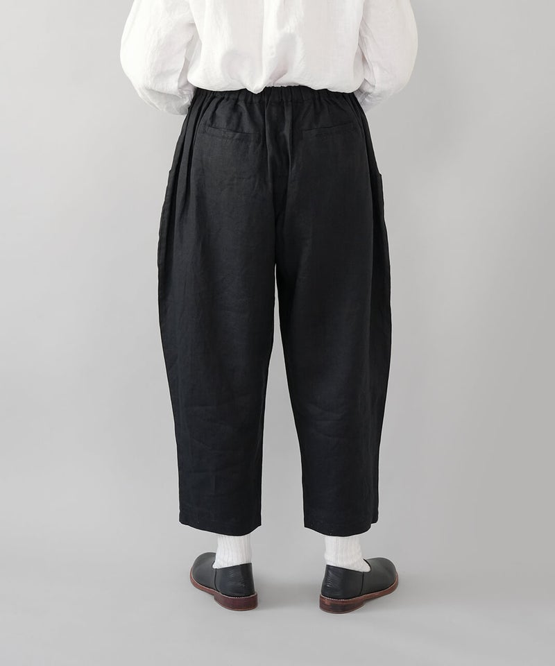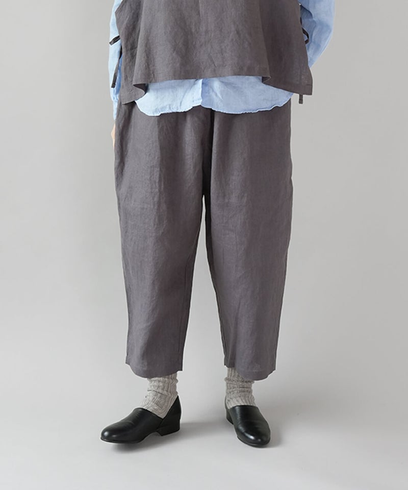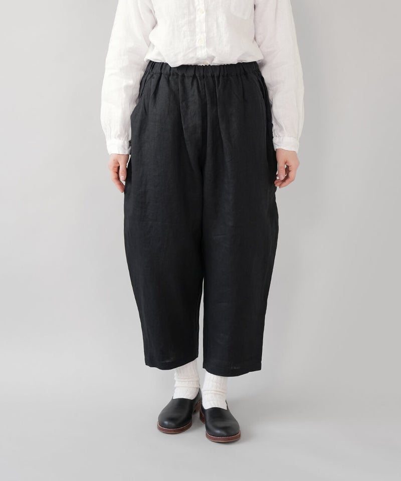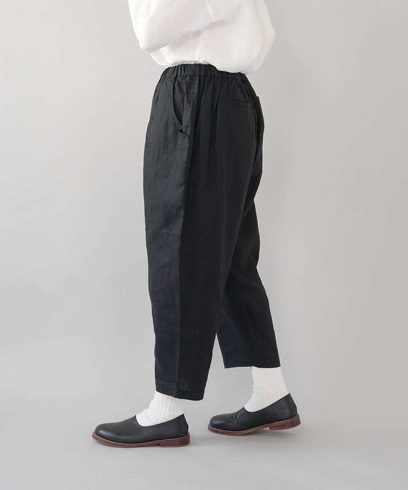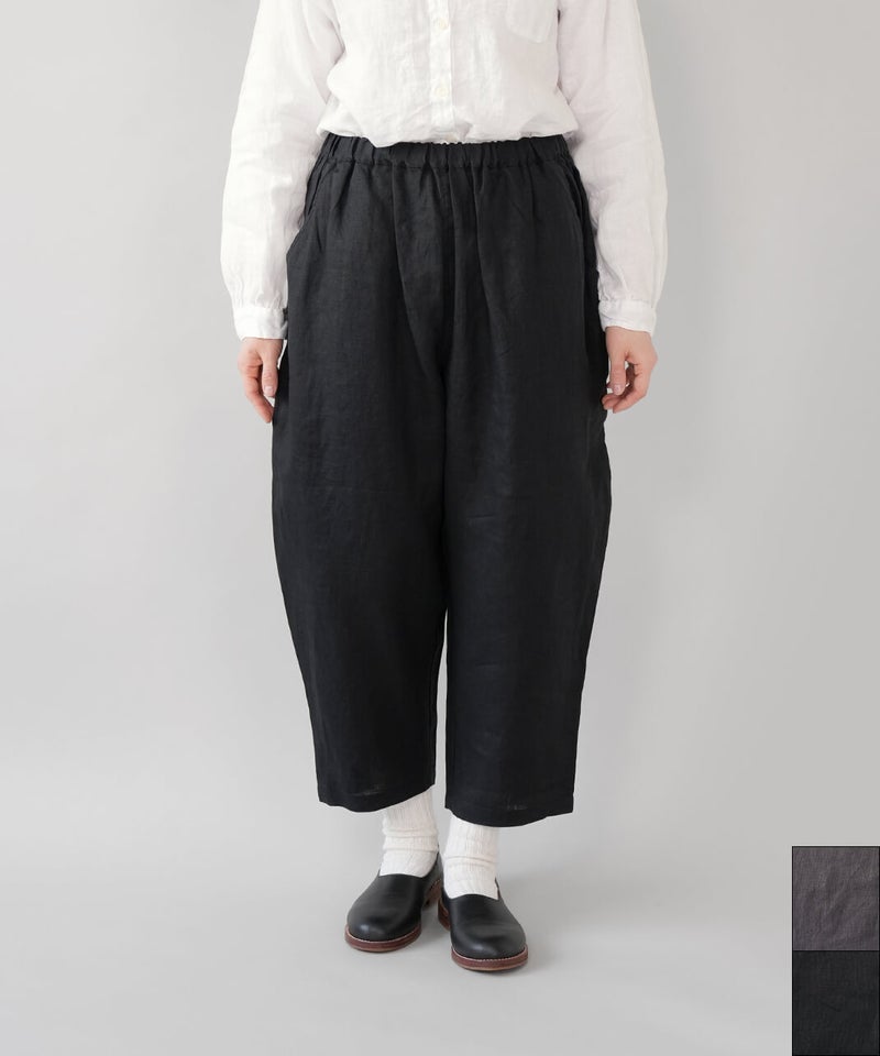 さらりとした清涼感のある、平織りリネン生地のパンツです。肌に触れるたびに心地よく、春から暑い夏にもおすすめの1着です。ista-ireの定番デザインで、1番のポイントはウエストが、ぐんと伸びるゴム仕様。締めつけ感が少なく、ストレスのない快適なはき心地です。太ももまわりにはほどよくゆとりがあり、裾に向かって緩やかに細くなるテーパードシルエット。すっきりとした印象で、動きやすさときれいなバランスを両立しています。軽やかなアンクル丈でブラウスやカットソーなど、いろいろなトップスとバランス良く合わせられます。