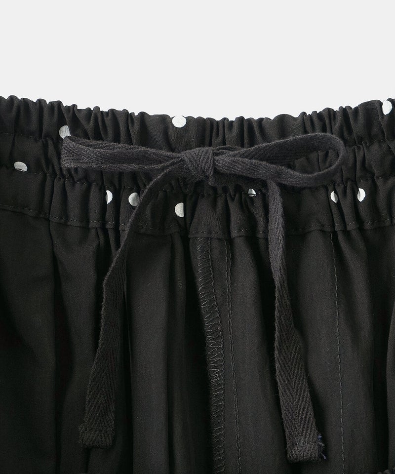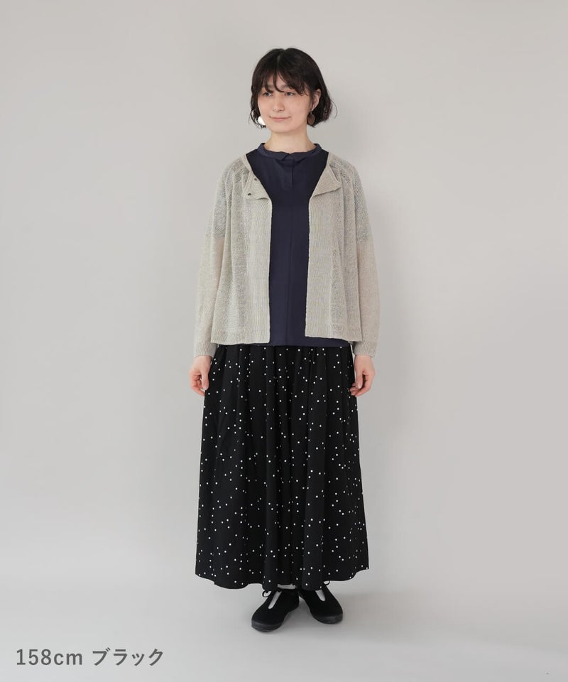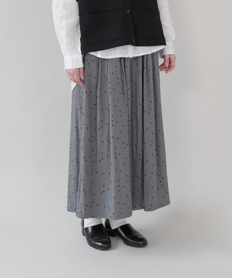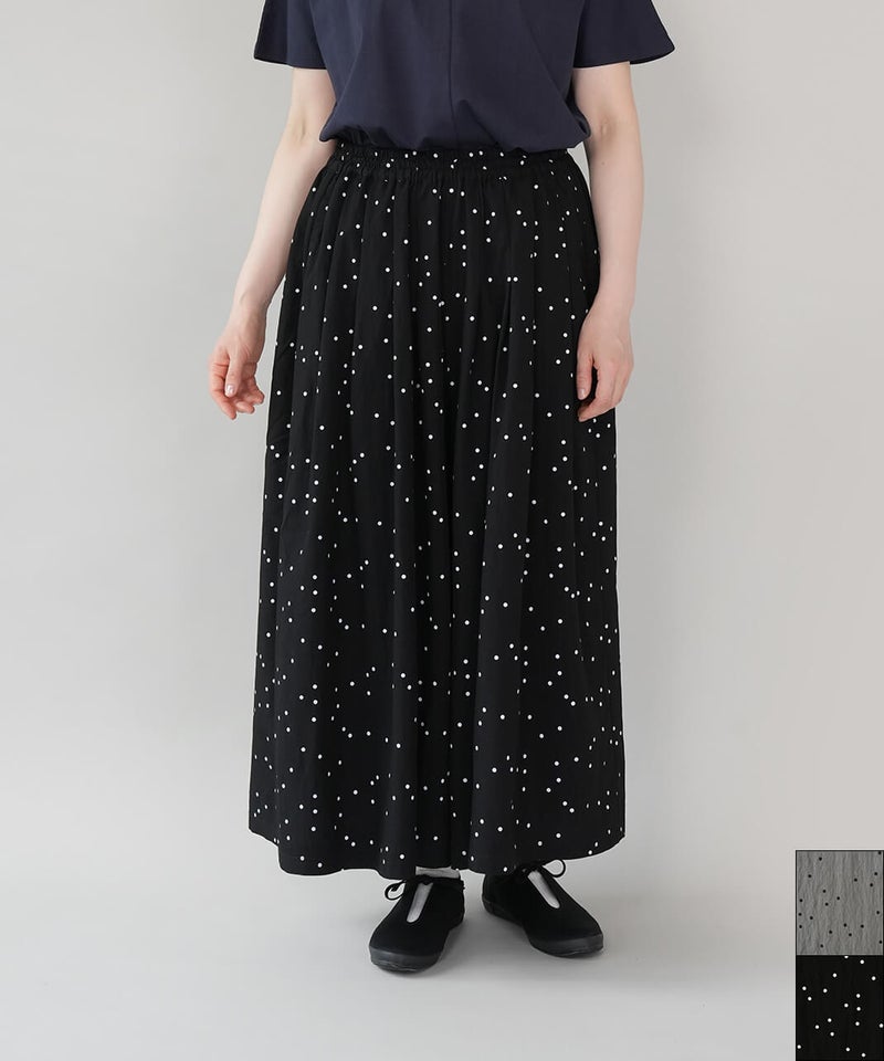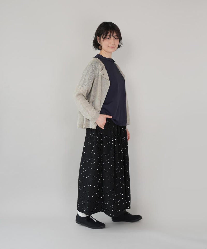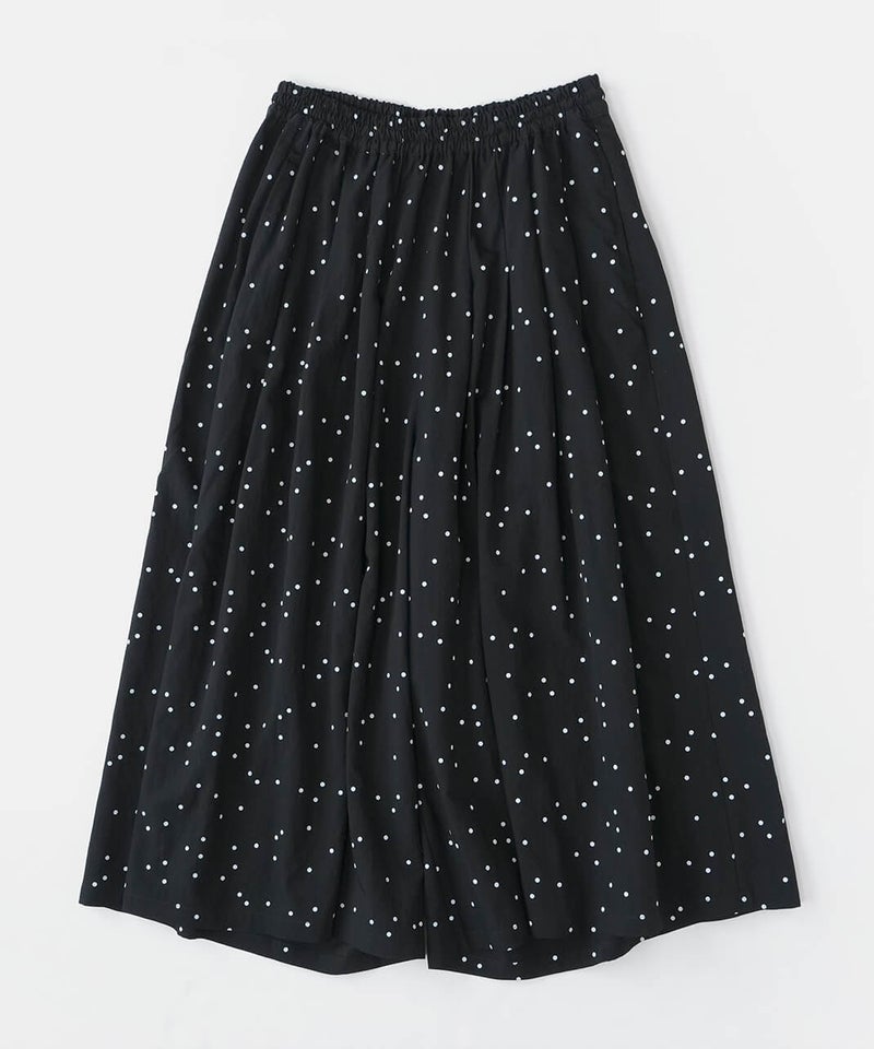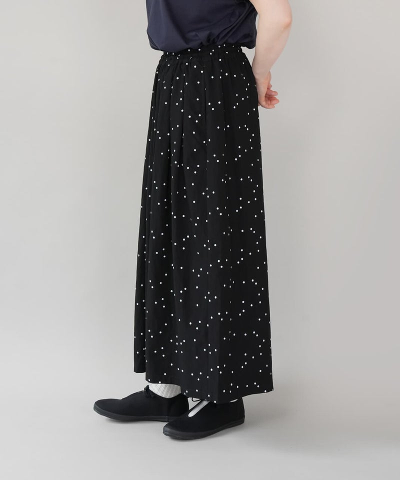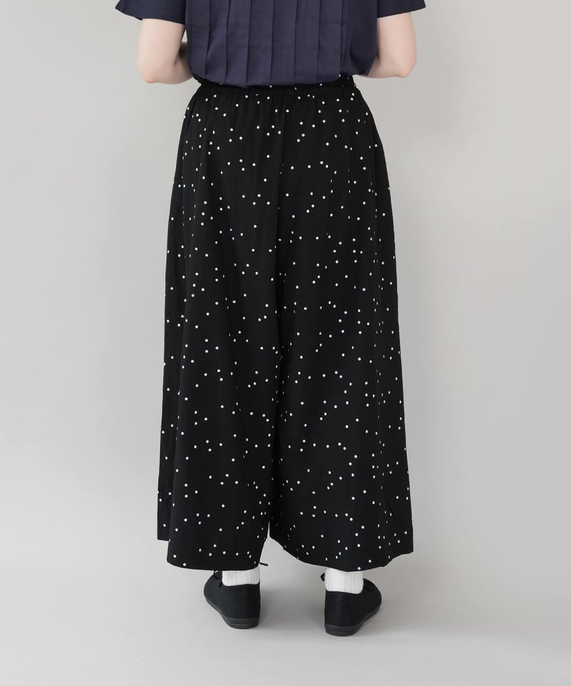 軽やかなポリエステルレーヨン生地で仕立てたキュロットパンツ。たっぷりな生地でスカートのようなシルエット。やわらかく入れたギャザーが、裾に向かってふんわりと広がり、動くたびに軽やかな表情を見せてくれます。さりげないピンドット柄は、コーディネートに自然と馴染みながら、ほどよいアクセントに。ブラウスやカットソーと合わせて、日々の装いに取り入れやすい一1着です。ウエストはゴム仕様に内紐付きで、心地よく着用できるのも嬉しいポイントです。