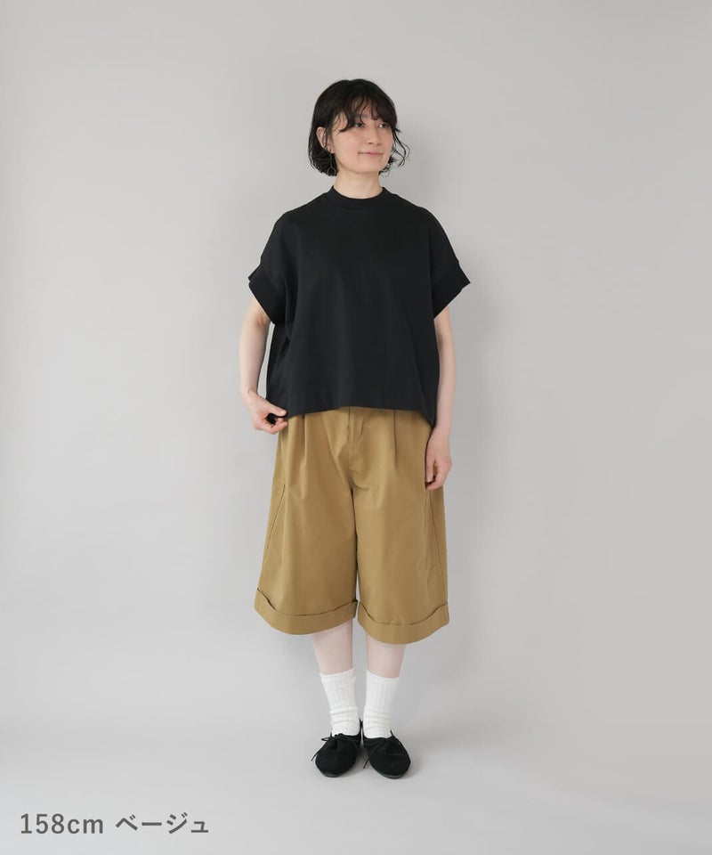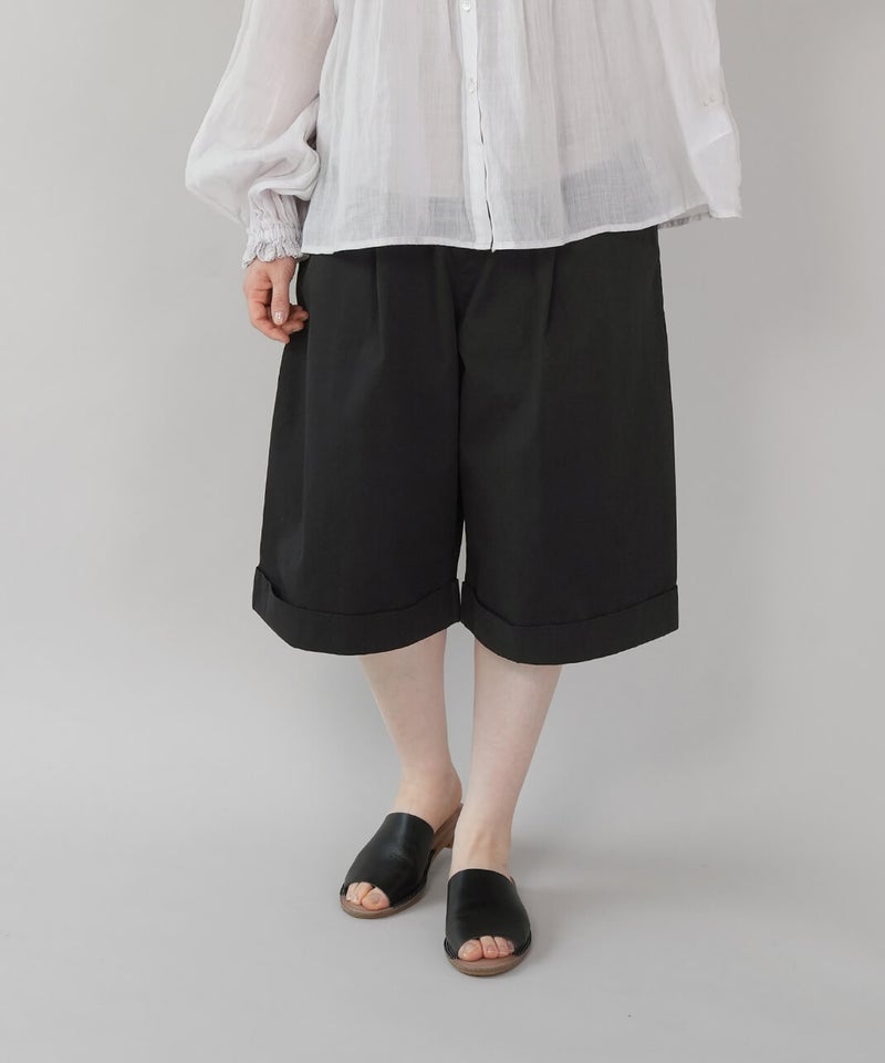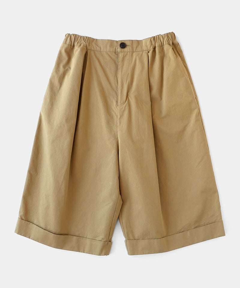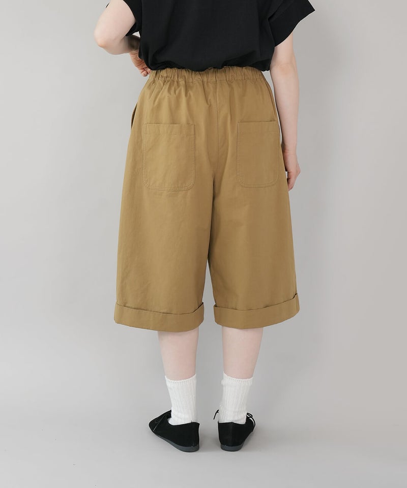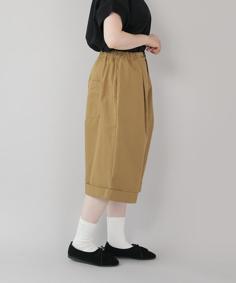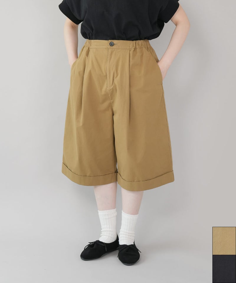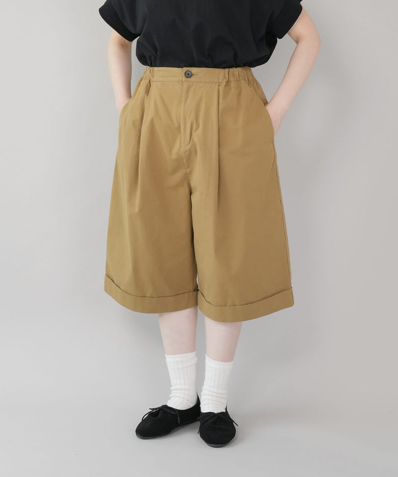 軽くて丈夫なコットンツイル素材を使用したショートパンツ。ちょっと長めの膝下丈と、ほどよくワイドなシルエットが、ラフさの中にも大人らしいカジュアルな雰囲気を演出します。ウエストはボタンとファスナー仕様で、きちんと感のある見た目に。後ろはゴム仕様で、快適な履き心地を実現しています。タックを施すことで、腰回りにゆとりを持たせたシルエットに仕上げています。