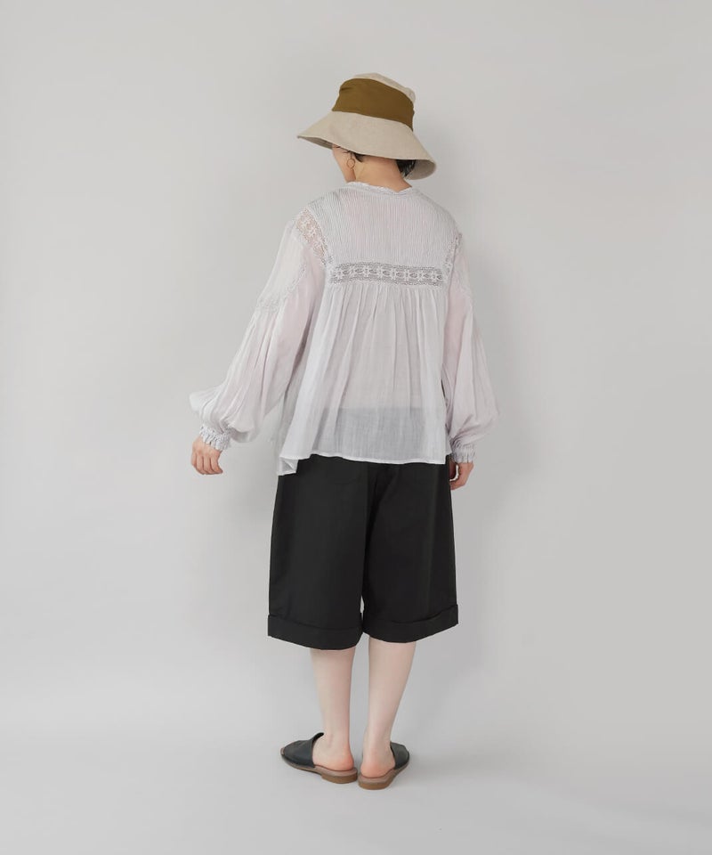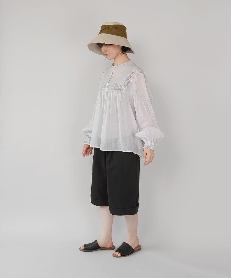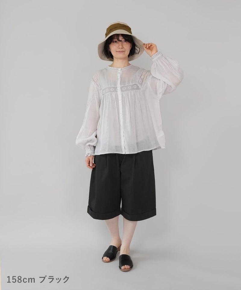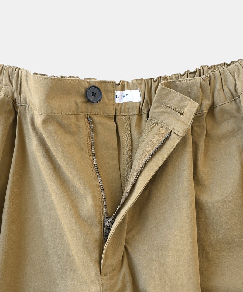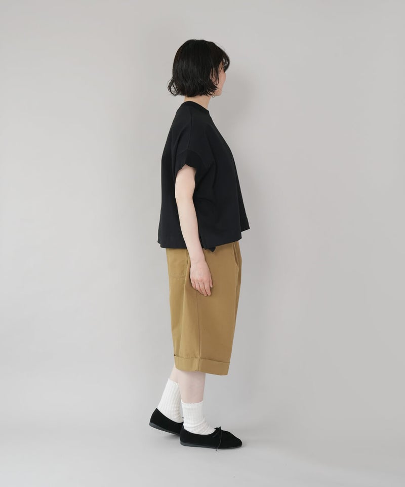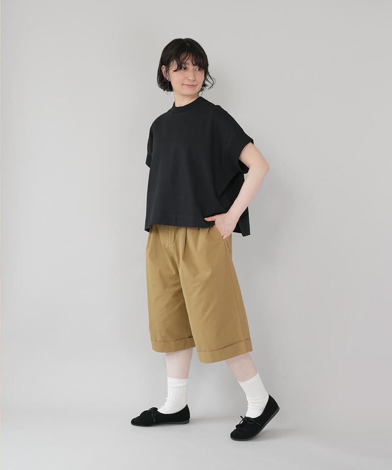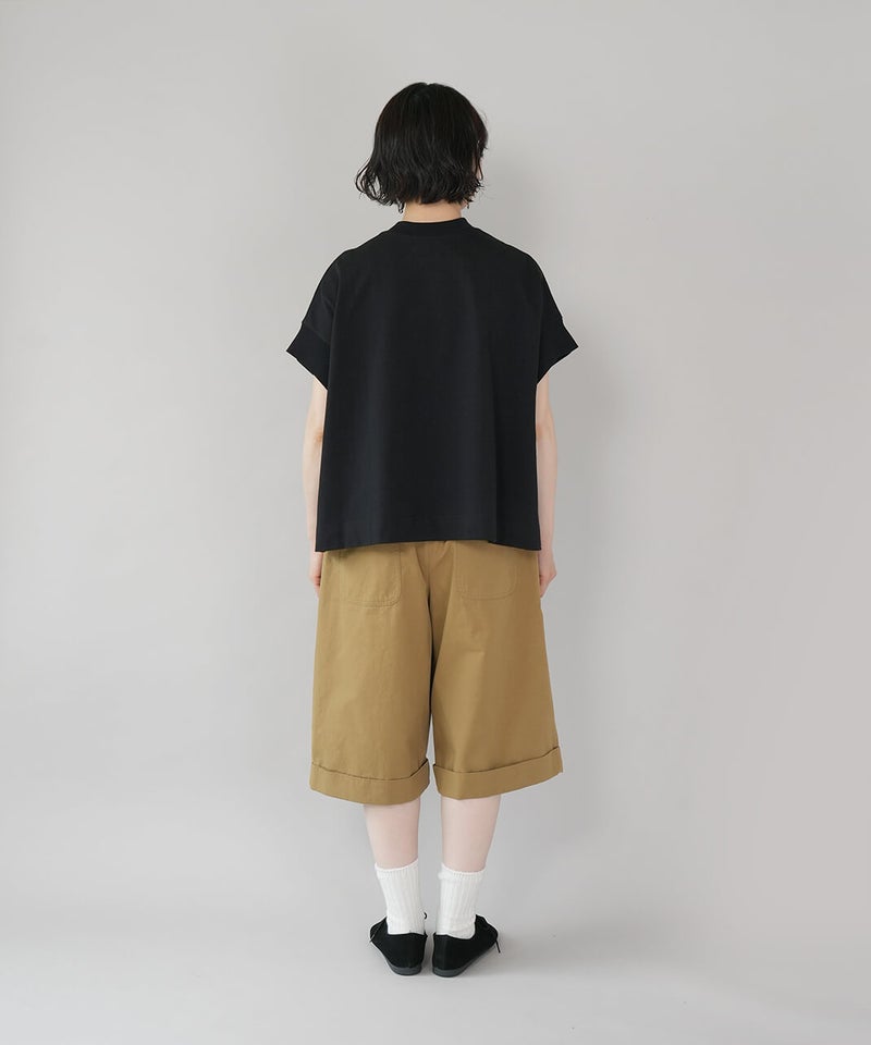 軽くて丈夫なコットンツイル素材を使用したショートパンツ。ちょっと長めの膝下丈と、ほどよくワイドなシルエットが、ラフさの中にも大人らしいカジュアルな雰囲気を演出します。ウエストはボタンとファスナー仕様で、きちんと感のある見た目に。後ろはゴム仕様で、快適な履き心地を実現しています。タックを施すことで、腰回りにゆとりを持たせたシルエットに仕上げています。
