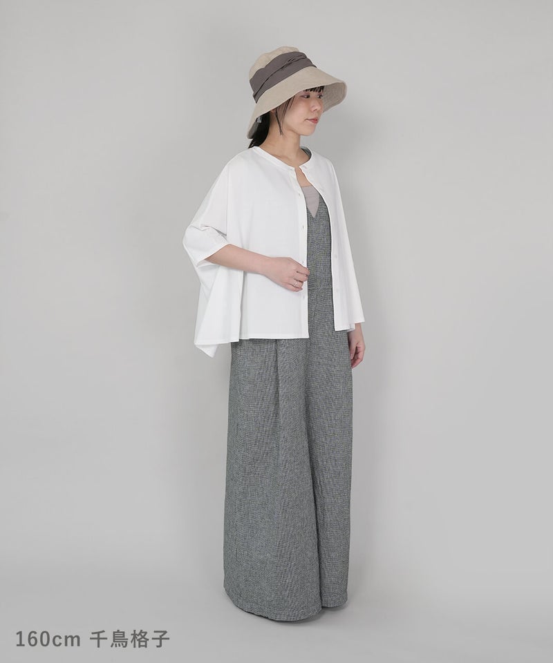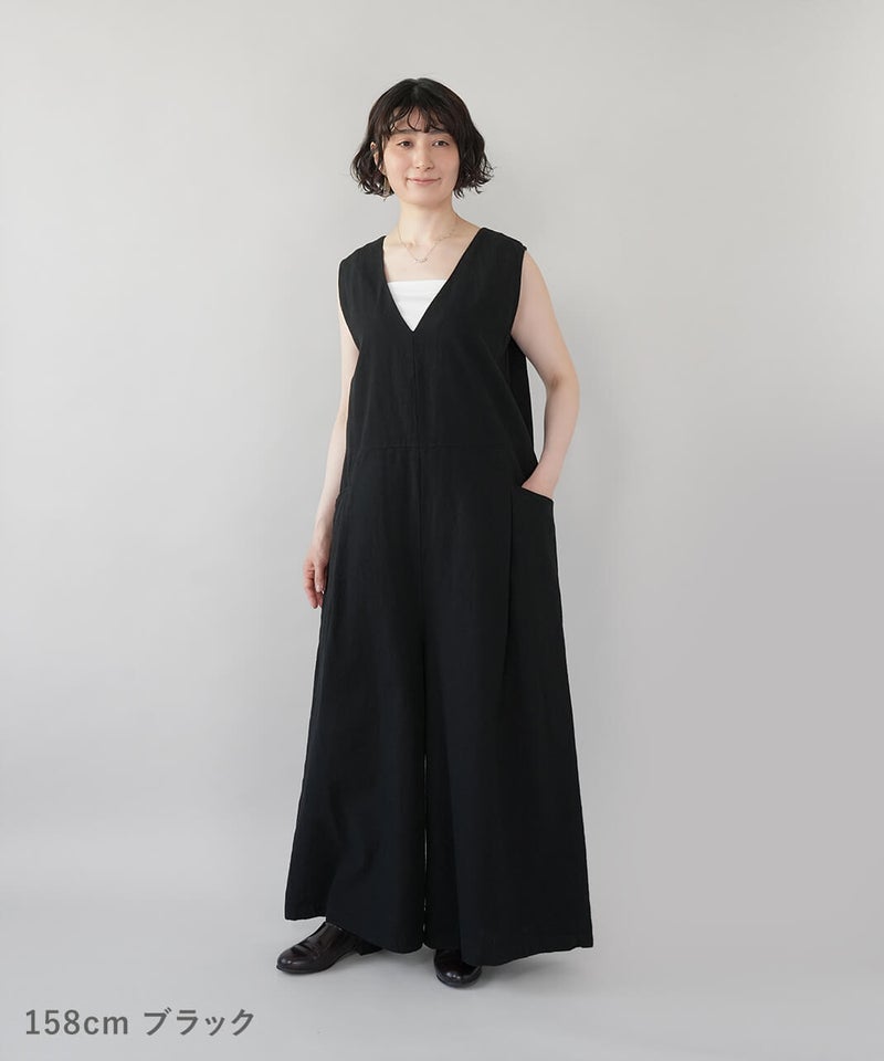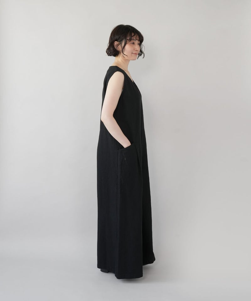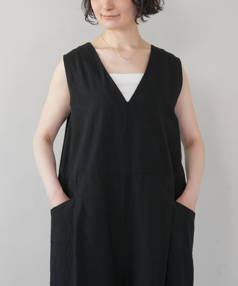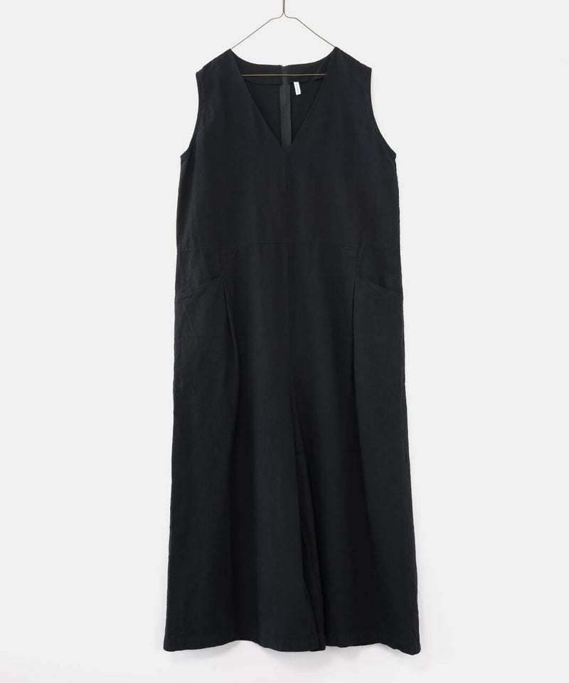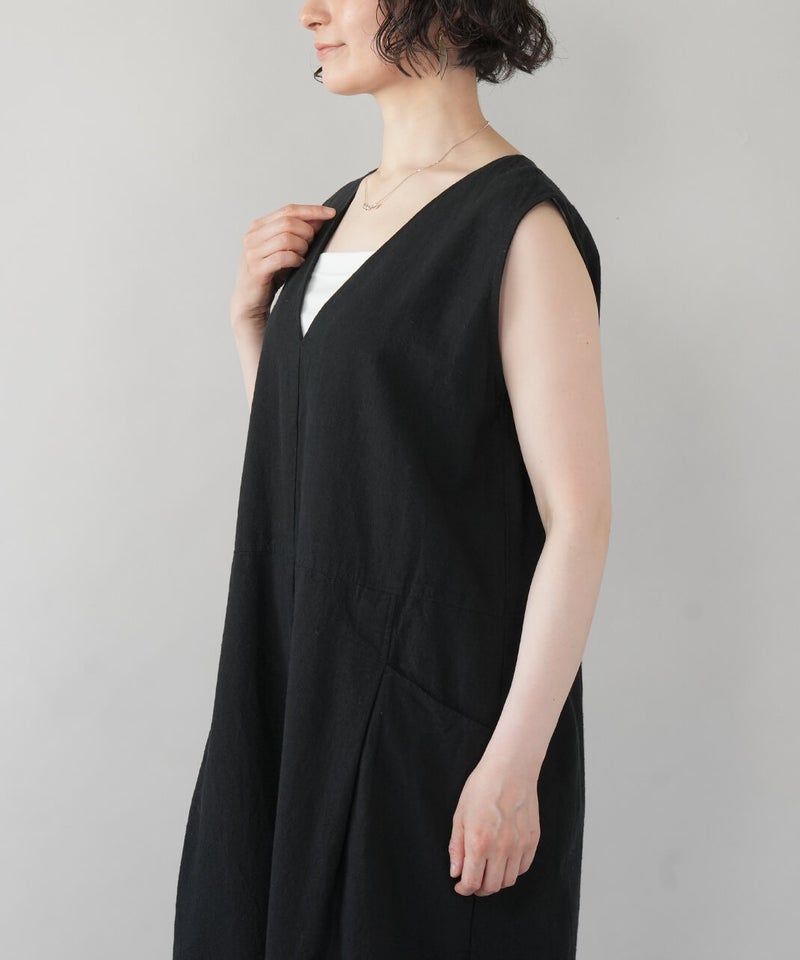 落ち感のある柔らかな風合いのコットンリネンを使用したサロペットです。すっきりとしたVネックにバスト下から緩やかに広がるフレアシルエットが大人のリラックス感を演出してくれます。バックファスナーの長めの持ち手もこだわりのポイント。インナーのアレンジとカーディガンやブラウスなど羽織りと合わせることもでき、季節問わず着用できます。
