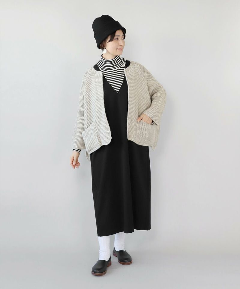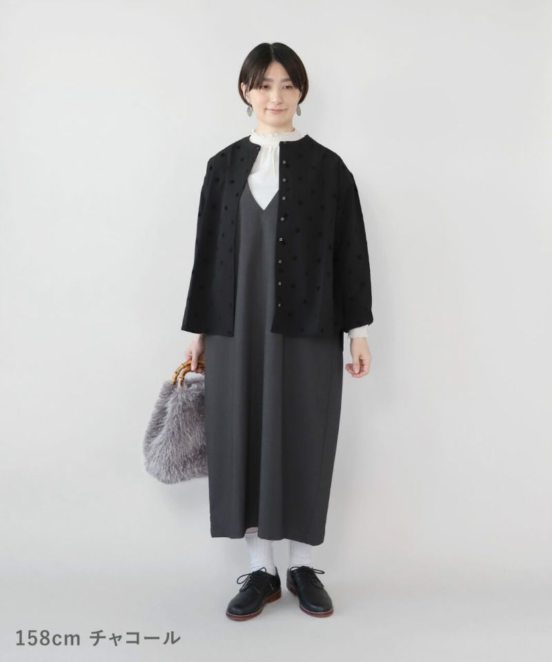 ポリエステルレーヨンを使用した上質なVネックワンピースです。すっきりとした深めのVネックと、アームホールが広めな作りのためインナーを選ばず、着回しの幅が広がる1着です。少しストレッチがきいているため着心地が良いのもポイント。選ぶインナーによってキレイ見えするため、オンオフ兼用での着用が可能です。