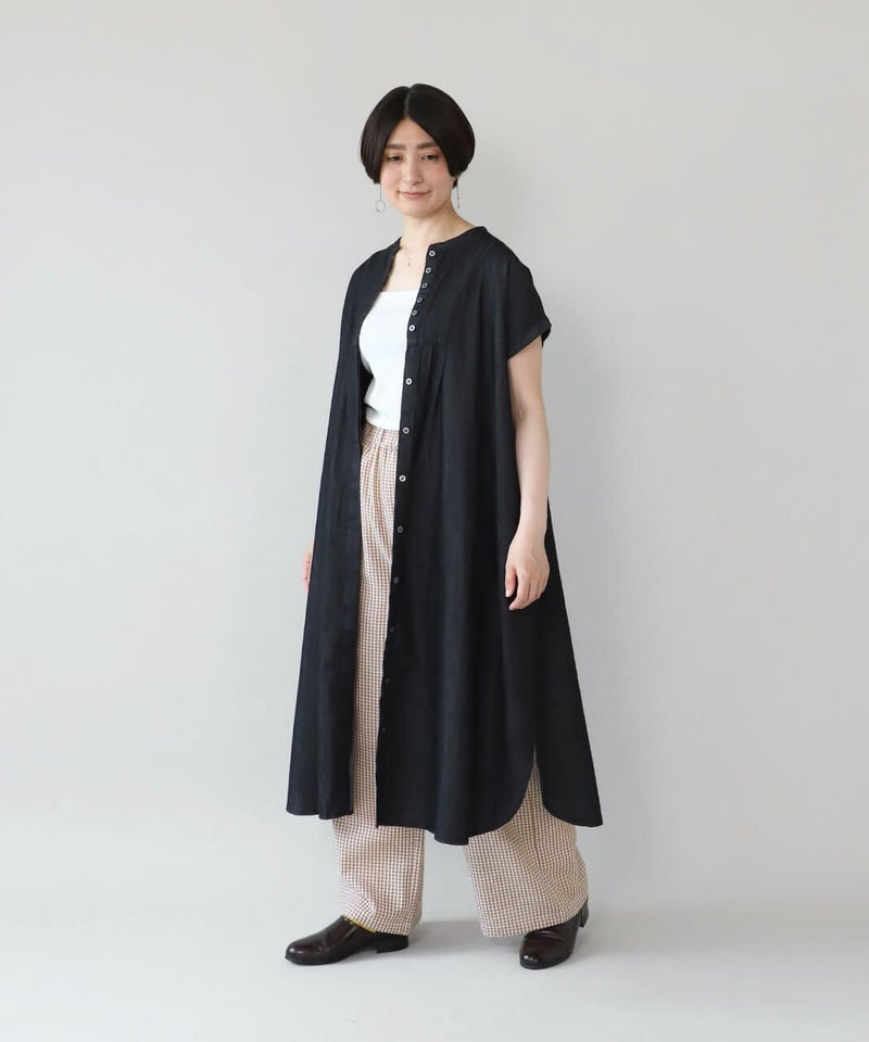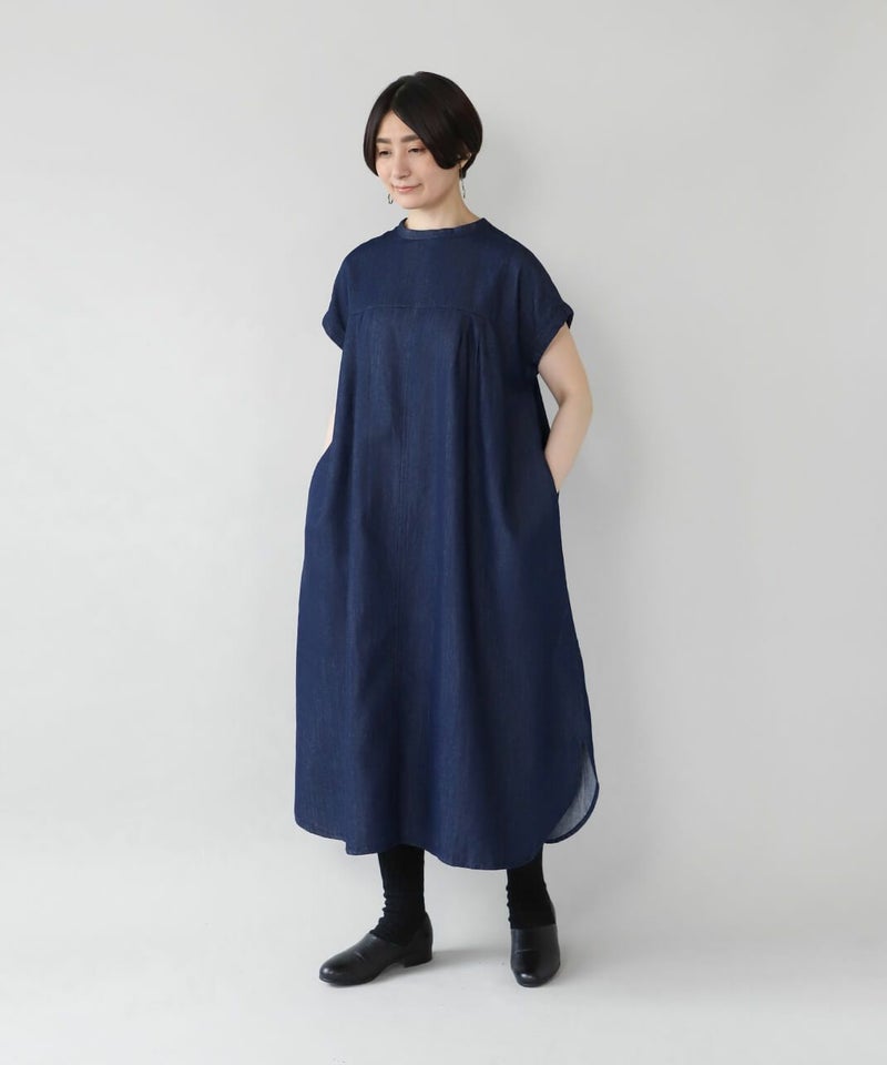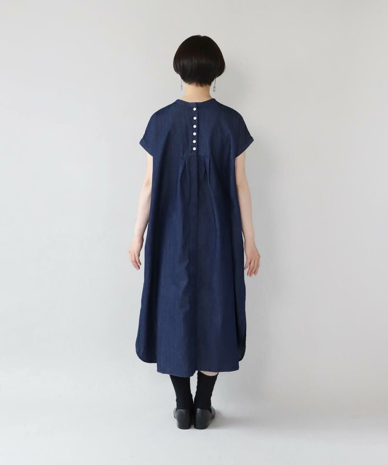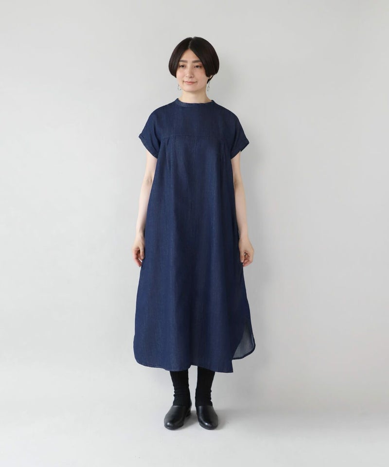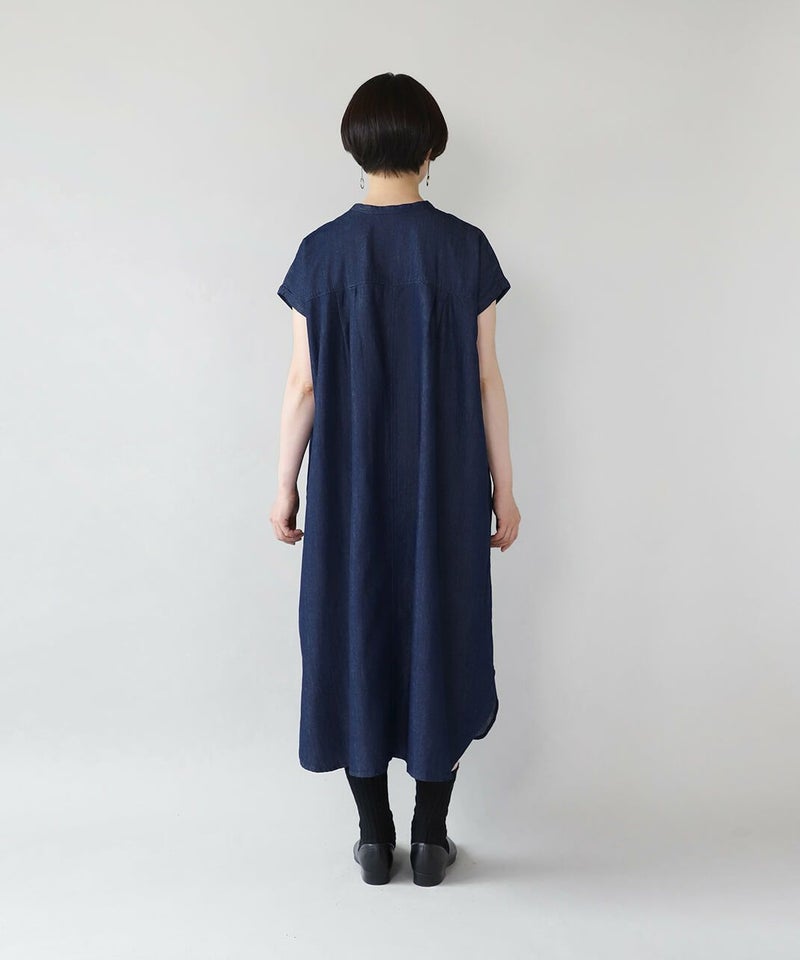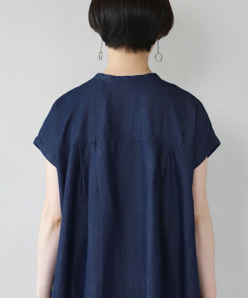 軽やかでさらりとしたコットンテンセルデニム生地を使用した2WAY切替えワンピースです。 首元はコンパクトなスタンドカラーですっきりと、肩がほんのり落ちるフレンチスリーブデザイン。前後にタックが入り、裾に向かってふんわり広がるきれいなシルエットです。身幅はゆとりがあり、リラックスして着用できます。さらに前後着用可能な2WAY仕様なため、雰囲気の違う着こなし。 さらに前後着用可能な2WAY仕様。1枚でさらっと涼しくワンピースとしてはもちろん、ボタンを開けて羽織りとしても着回せるおすすめの1着です。