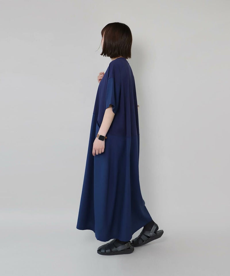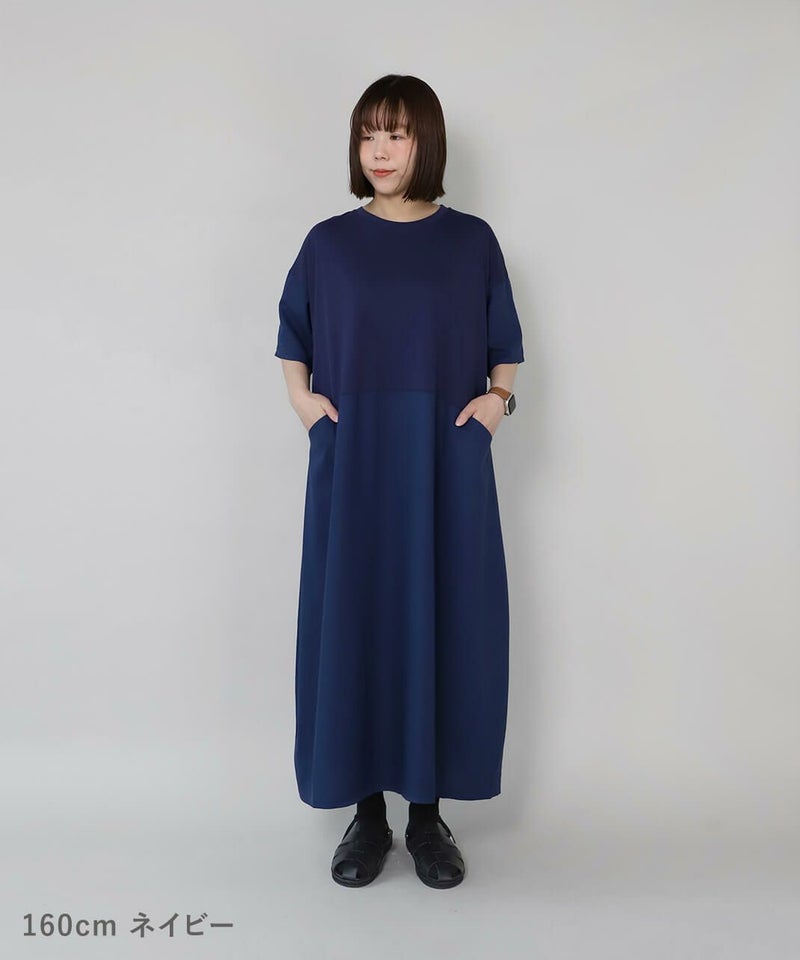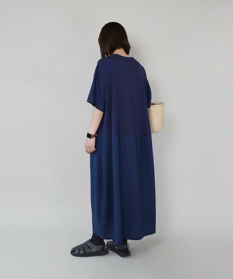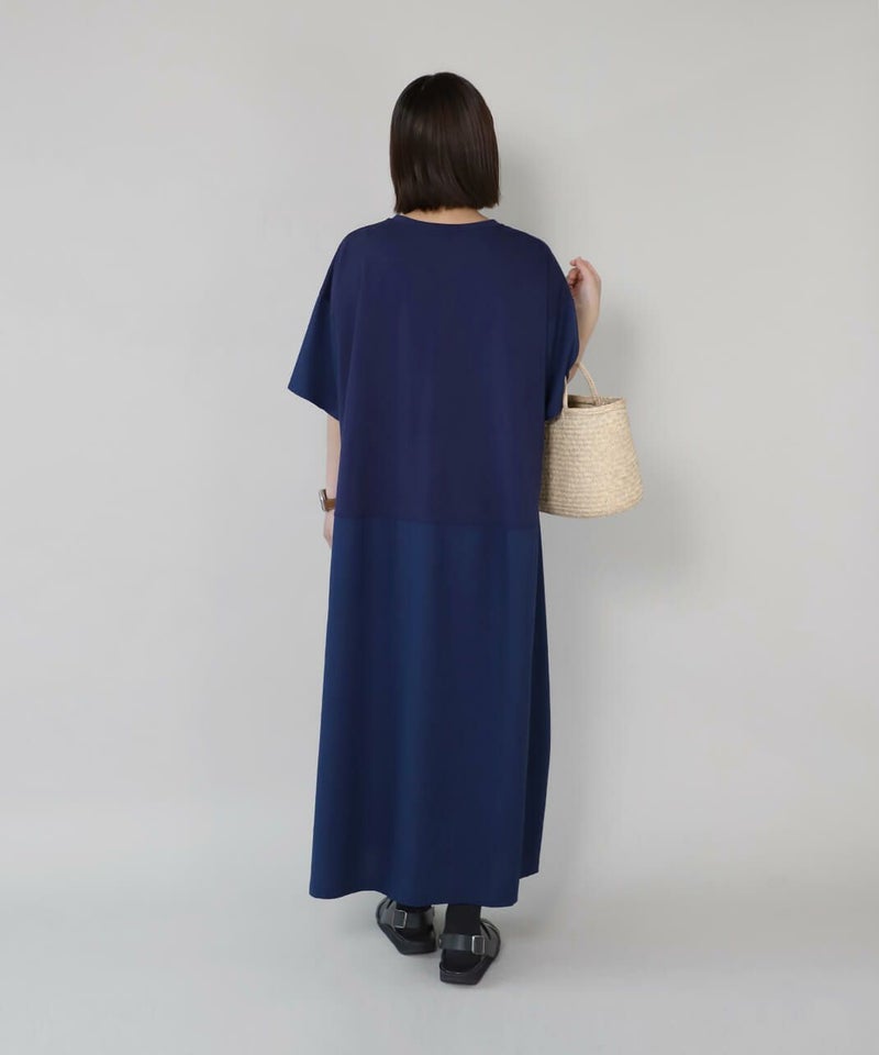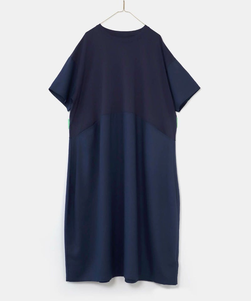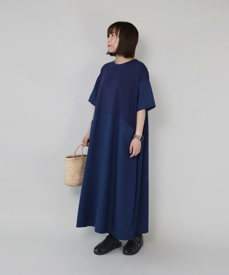 コットン素材と落ち感のあるレーヨンヘンプの切替えのワンピースです。 少し広めの首元にワイドな身頃でゆったりとした着心地。落ち着いた配色のラウンド切替えがアクセントになっています。さっとらくちんに着られてきちんと見えるのが嬉しいポイントです。