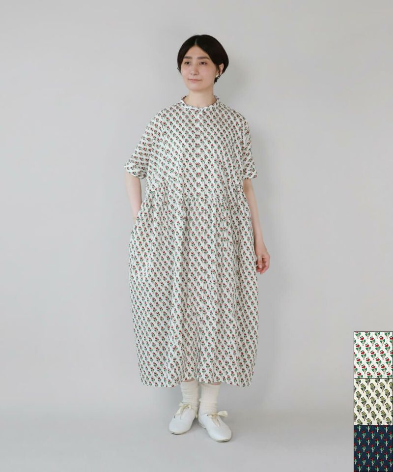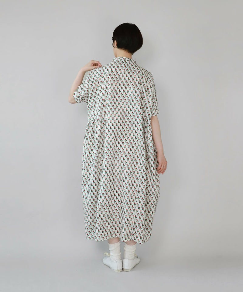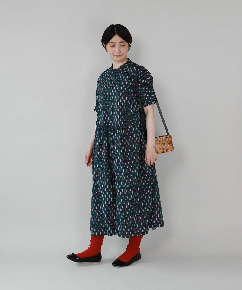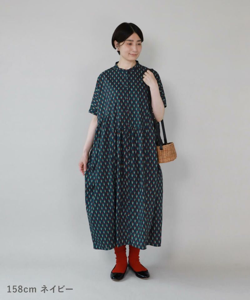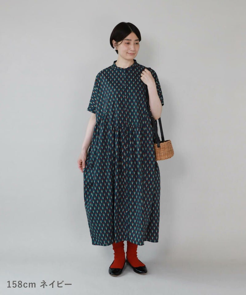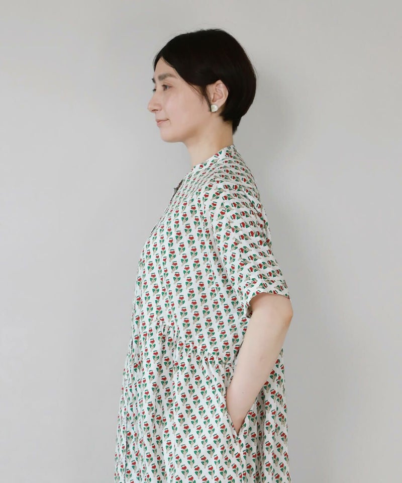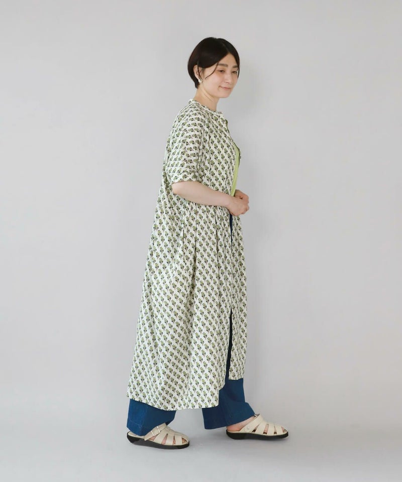 ほどよいハリのあるコットン素材を使用したワンピースです。 シンプルなスタンドカラーですっきりと、フロントと脇にギャザーの切替えが入ったふんわりシルエット。ドルマンスリーブがさらにゆったりとした着心地に。目を惹くボタニカル柄はコーディネートの主役になります。ワンピースとしてはもちろん、羽織りとしての着用もおすすめです。