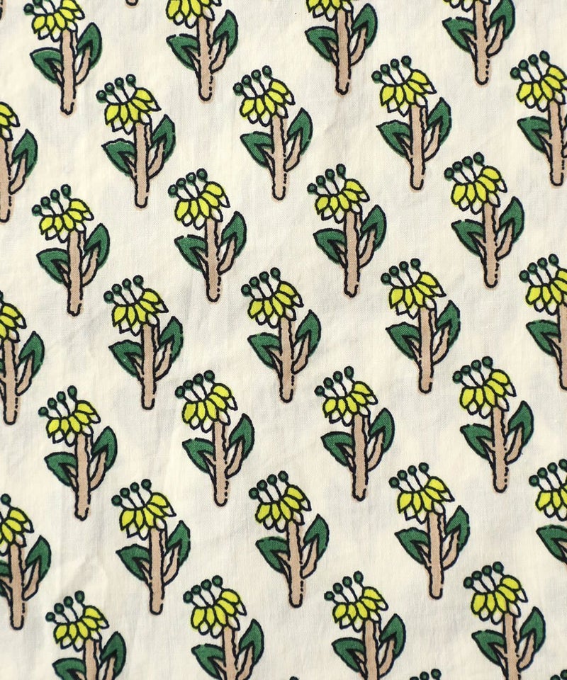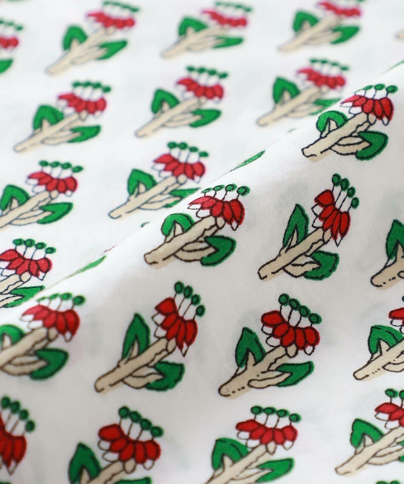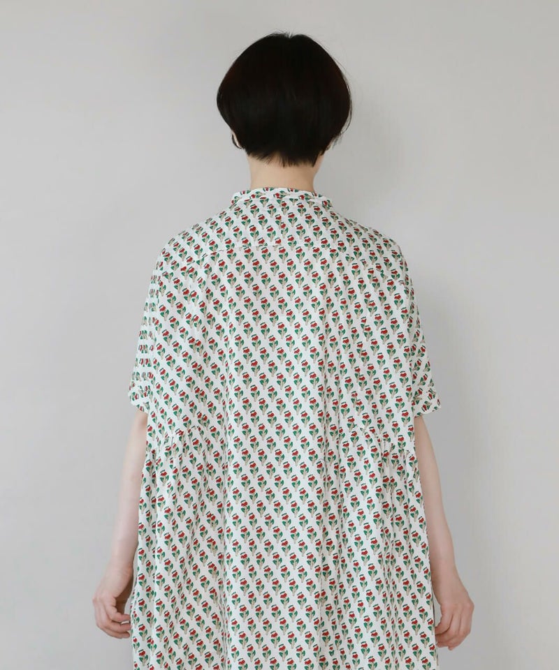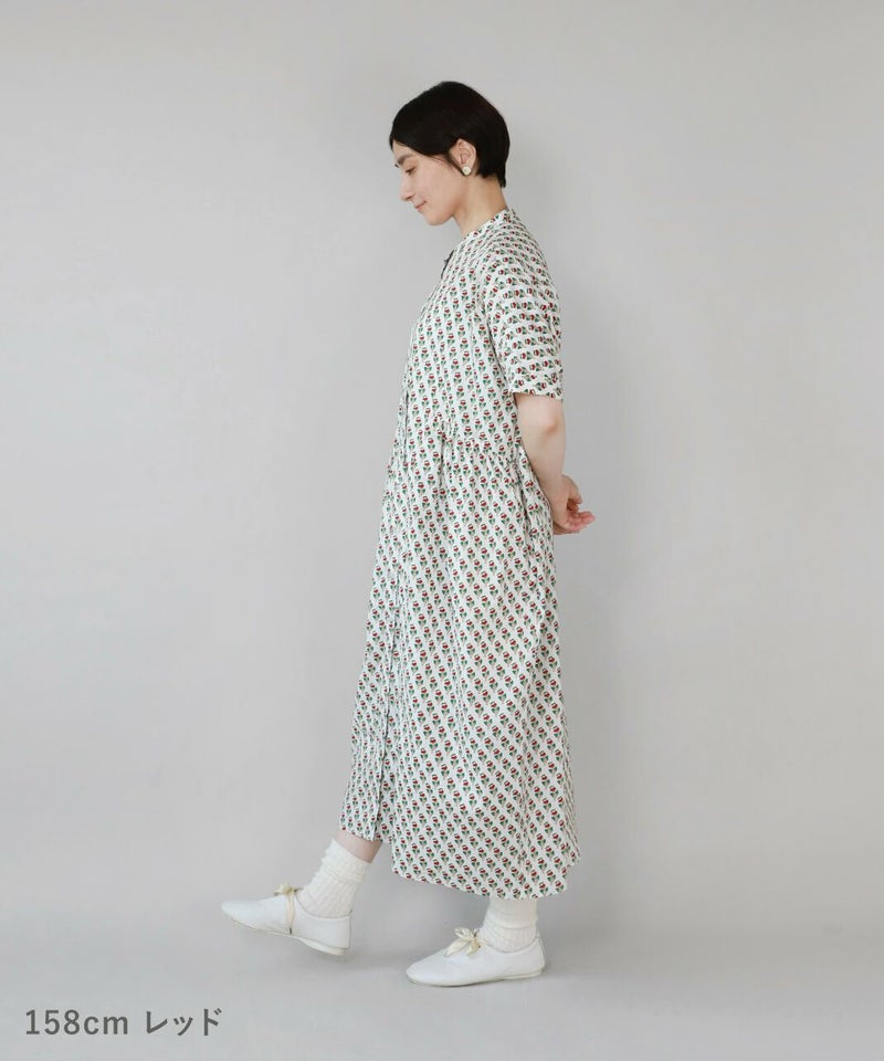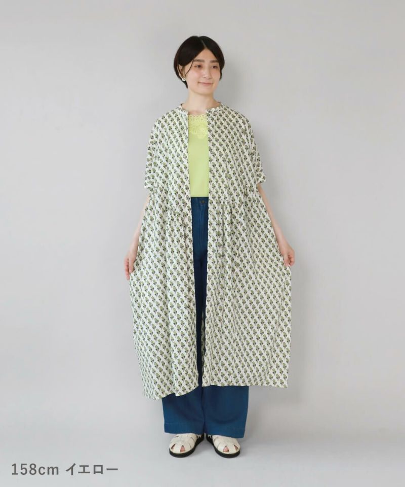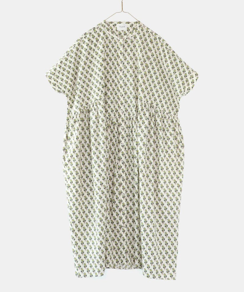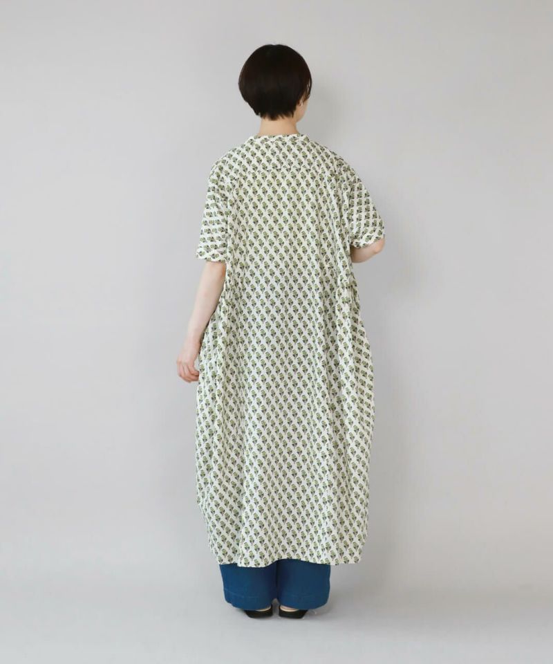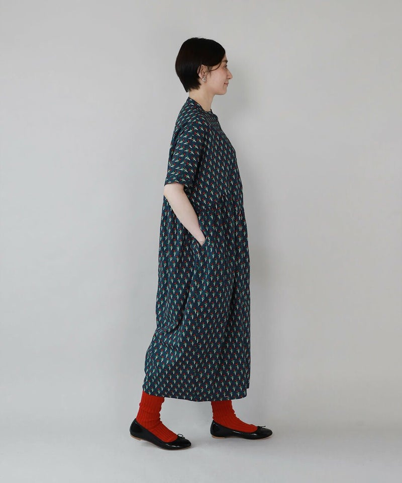 ほどよいハリのあるコットン素材を使用したワンピースです。 シンプルなスタンドカラーですっきりと、フロントと脇にギャザーの切替えが入ったふんわりシルエット。ドルマンスリーブがさらにゆったりとした着心地に。目を惹くボタニカル柄はコーディネートの主役になります。ワンピースとしてはもちろん、羽織りとしての着用もおすすめです。