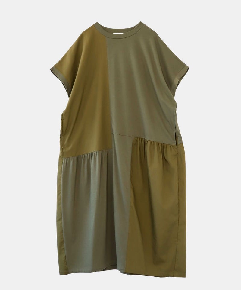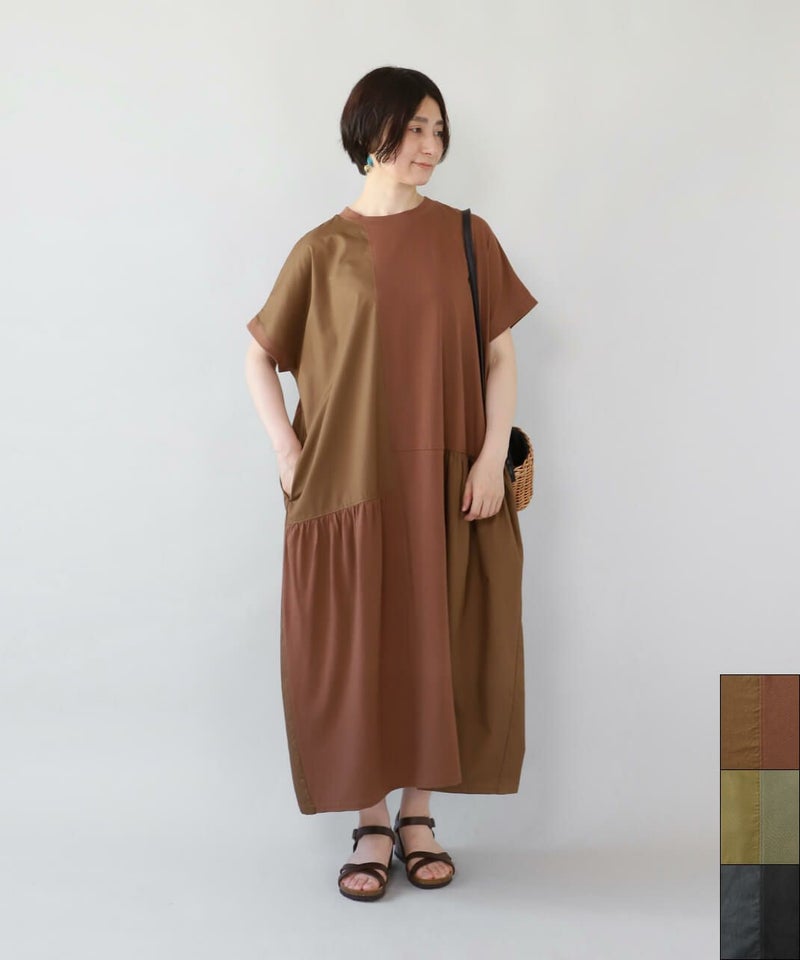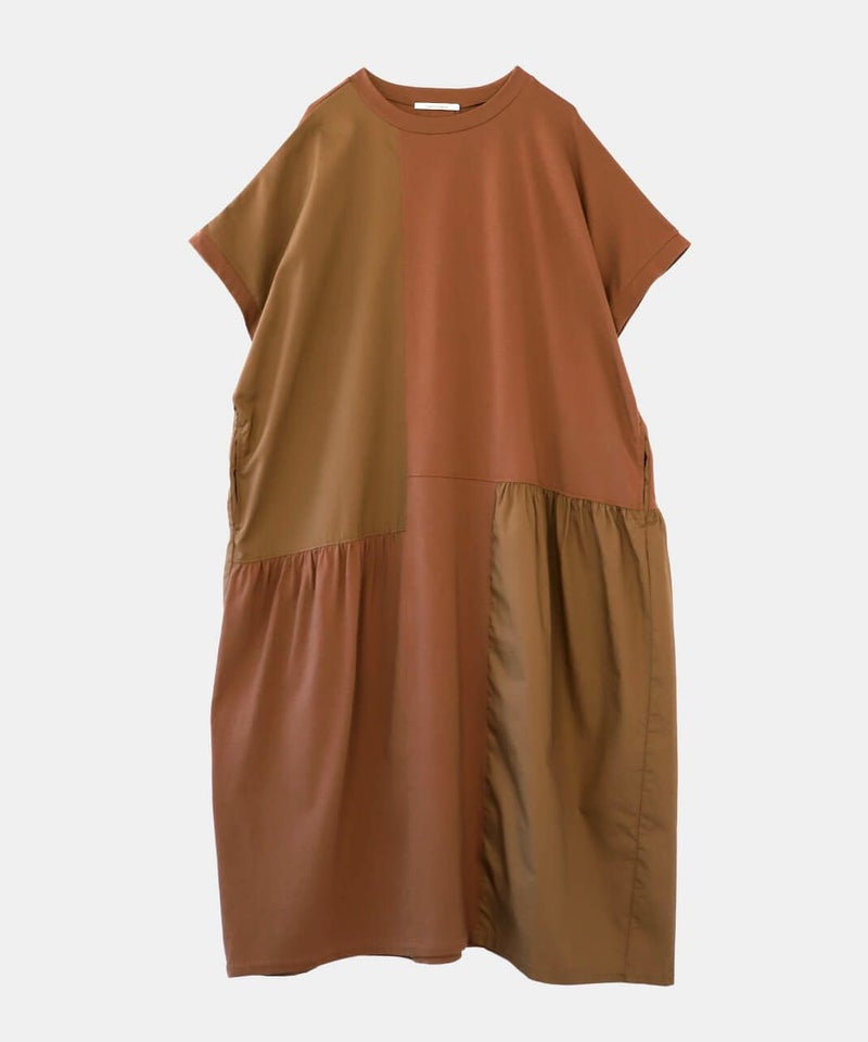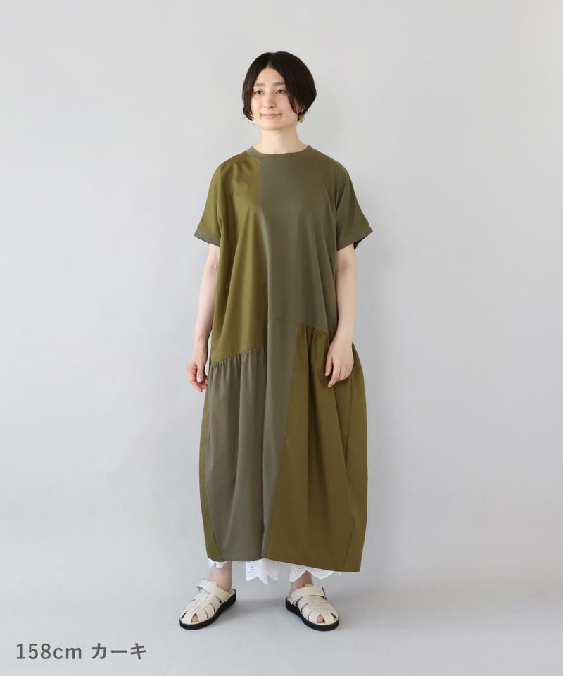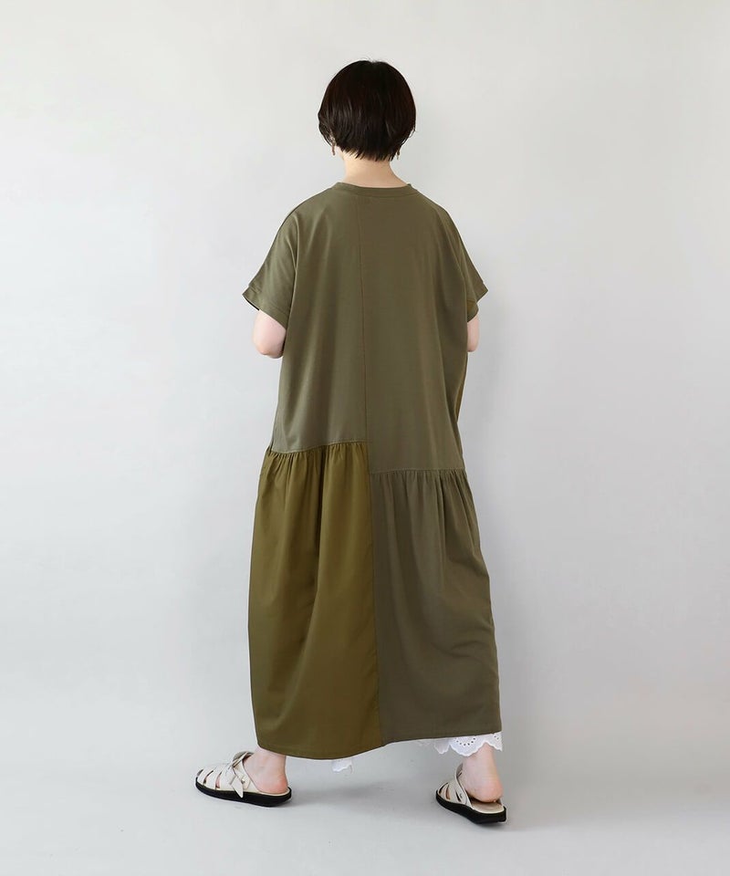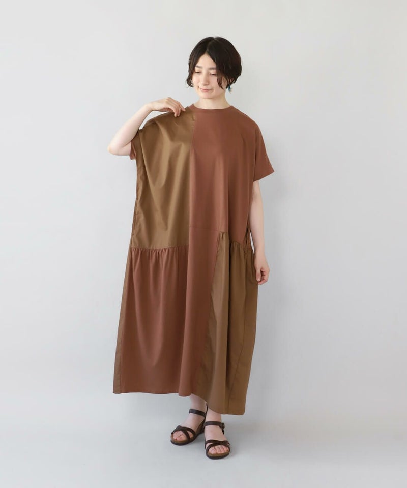 肌触りが良く柔らかな質感のソフト天竺とハリのあるブロード生地をパッチワークで切替えを入れたワンピースです。 シンプルなクルーネックにゆったりとした身頃とドロップショルダーでリラックスした着心地。 2種類の生地をランダムに切替え、所々ギャザーを施しました。大胆なパッチワークデザインが目を惹き、ナチュラルで可愛らしい雰囲気を演出してくれます。肌に張り付きにくく、さらりと涼しく着用出来ます。