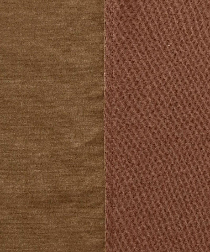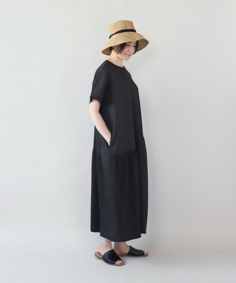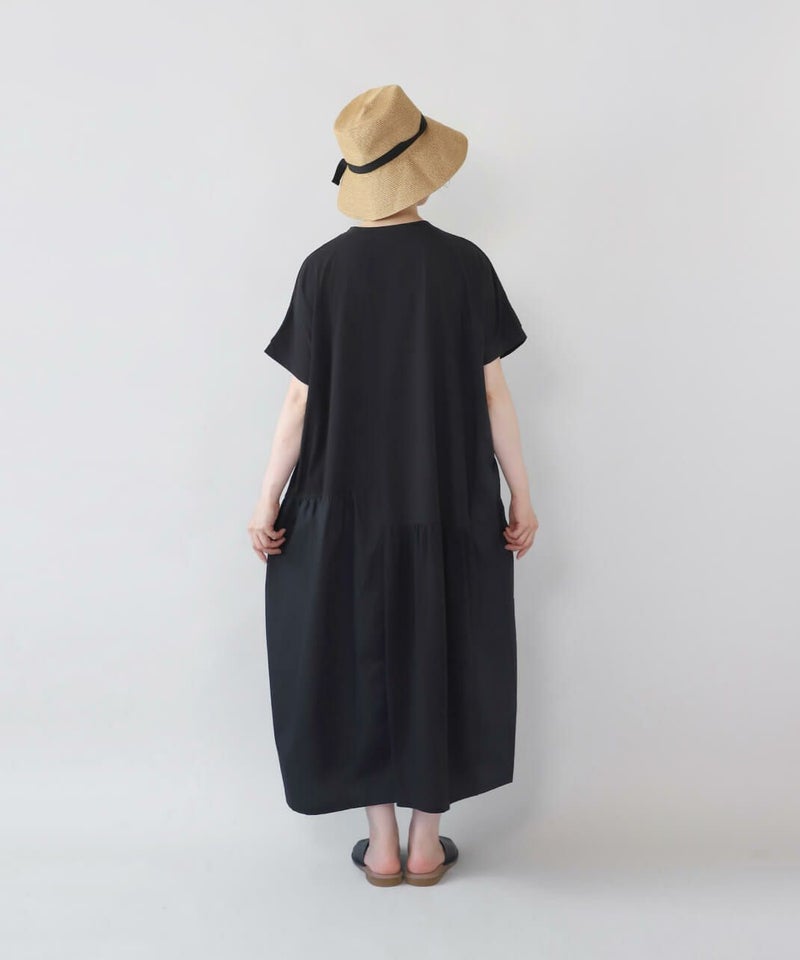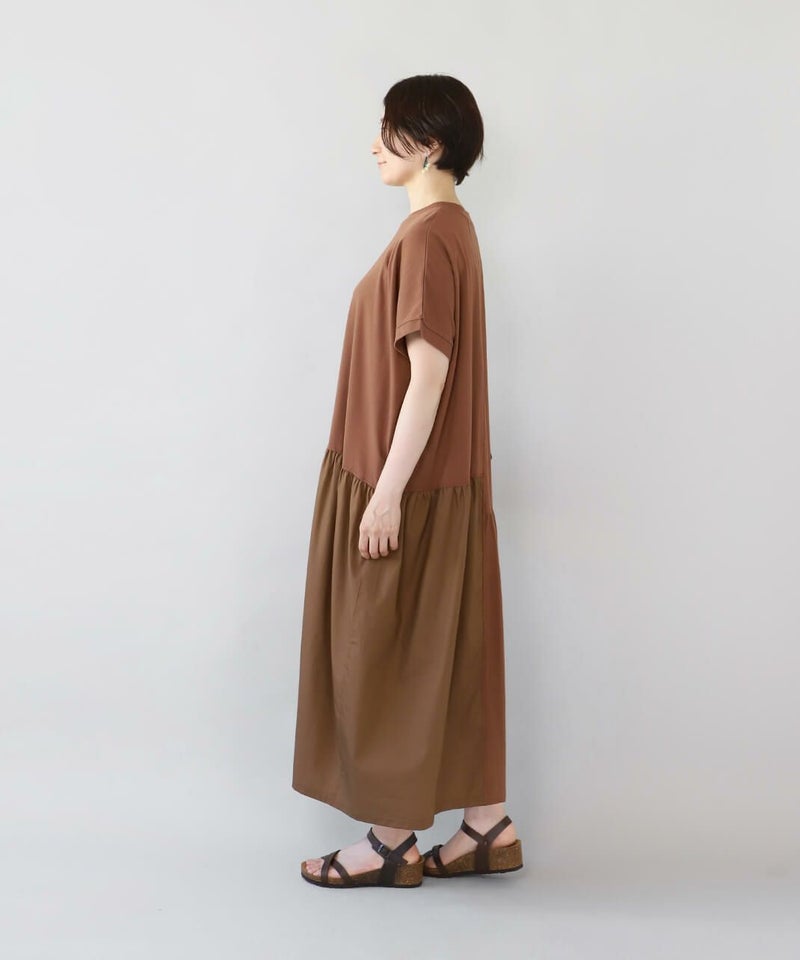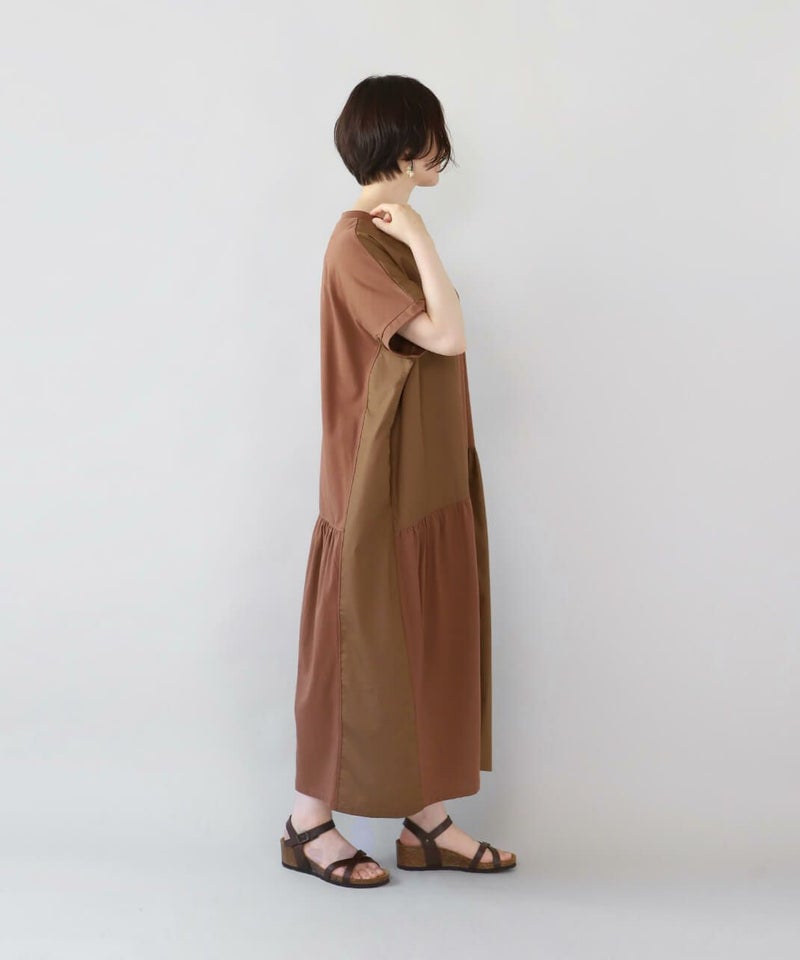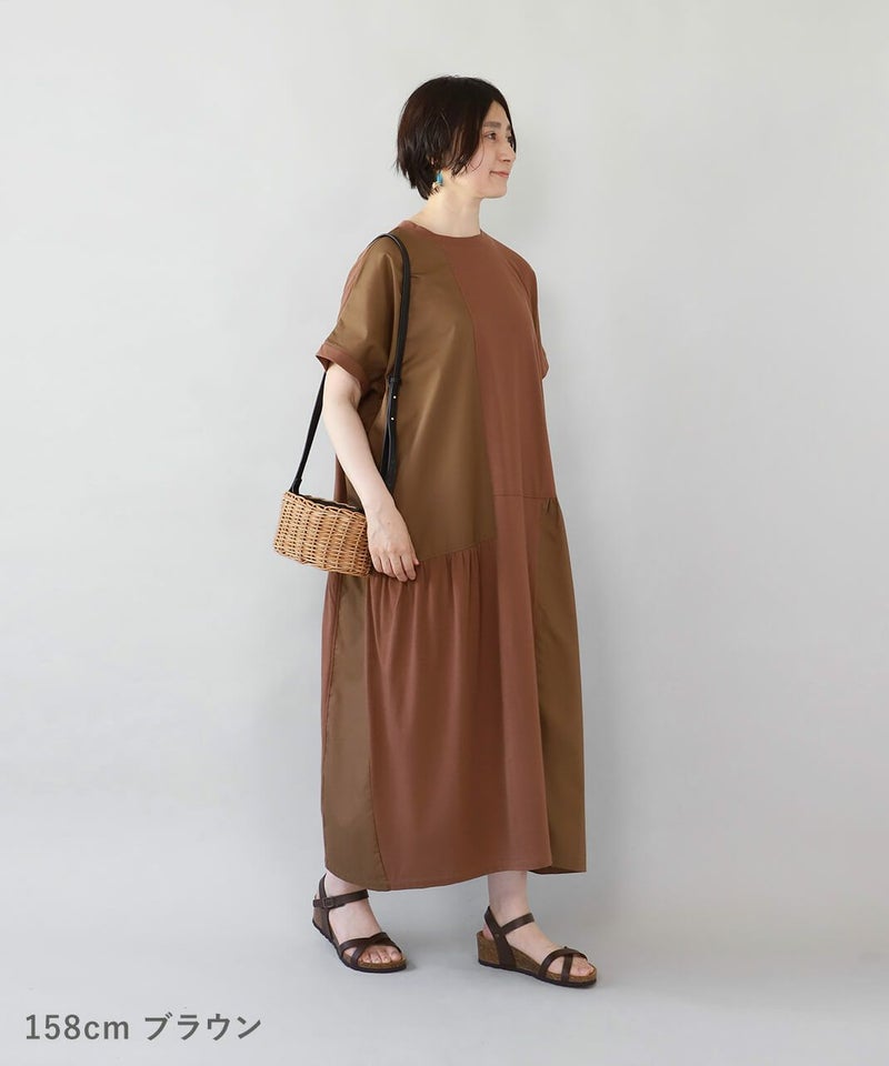 肌触りが良く柔らかな質感のソフト天竺とハリのあるブロード生地をパッチワークで切替えを入れたワンピースです。 シンプルなクルーネックにゆったりとした身頃とドロップショルダーでリラックスした着心地。 2種類の生地をランダムに切替え、所々ギャザーを施しました。大胆なパッチワークデザインが目を惹き、ナチュラルで可愛らしい雰囲気を演出してくれます。肌に張り付きにくく、さらりと涼しく着用出来ます。