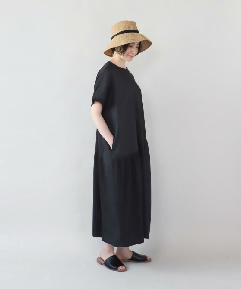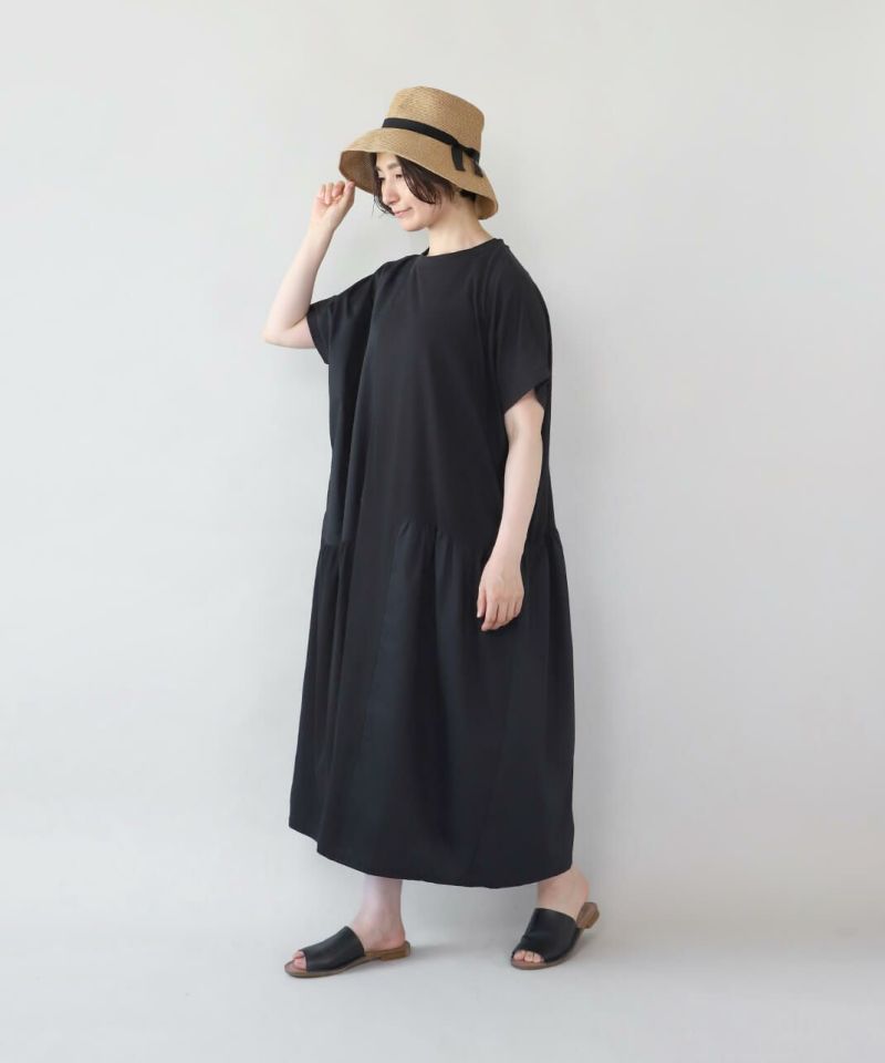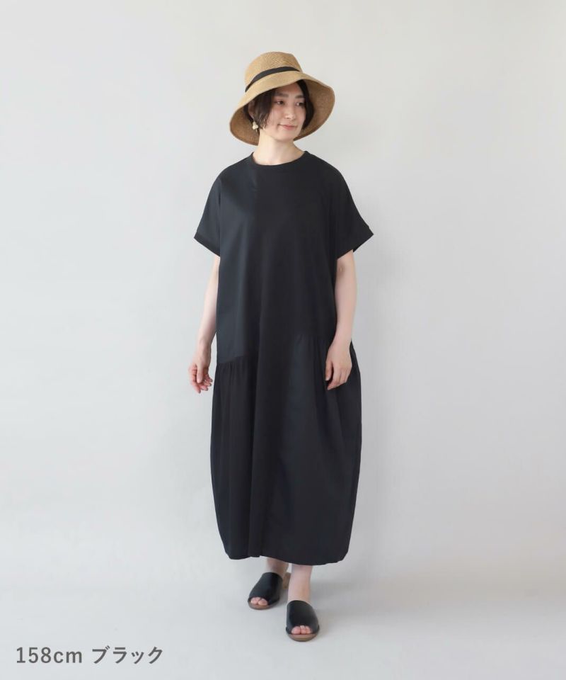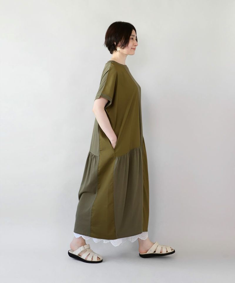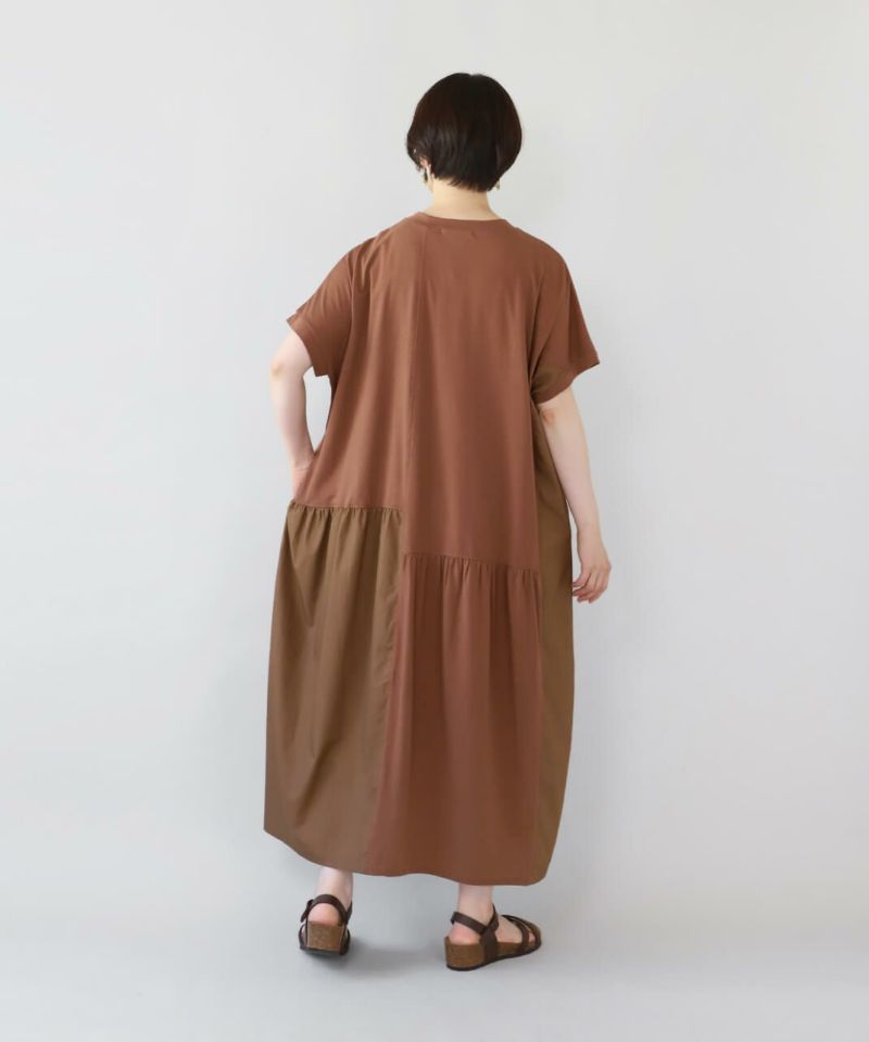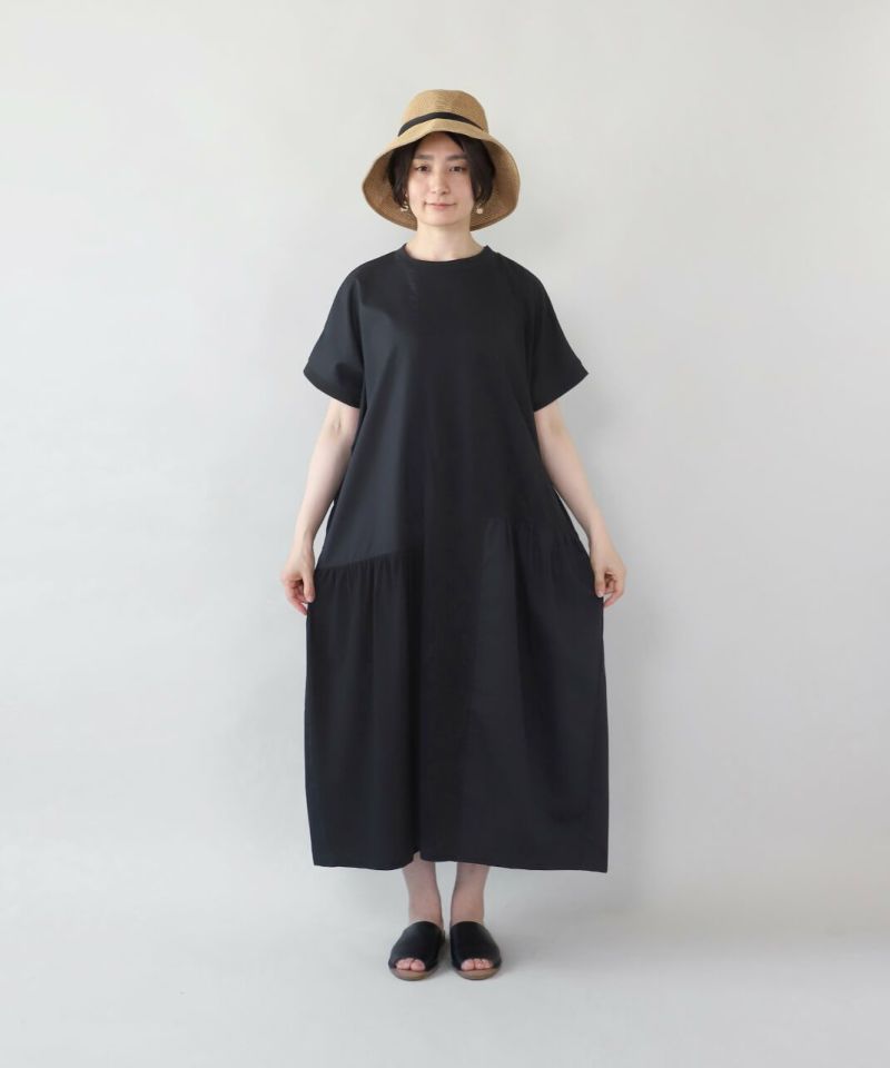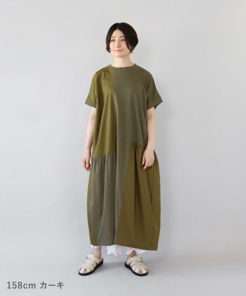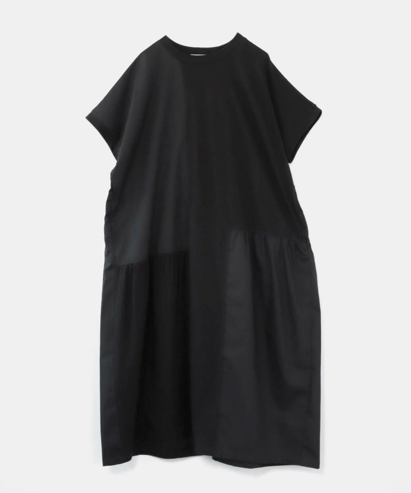 肌触りが良く柔らかな質感のソフト天竺とハリのあるブロード生地をパッチワークで切替えを入れたワンピースです。