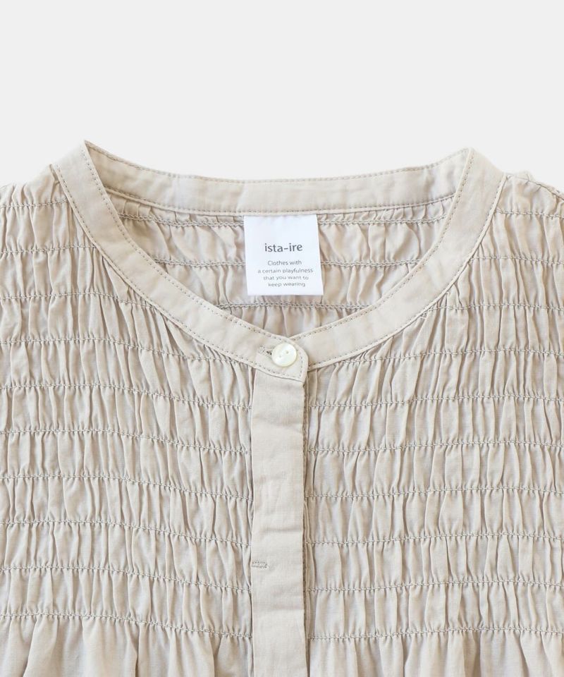 肩から胸元にかけて施されたシャーリングの細かなギャザーが目を惹きます。