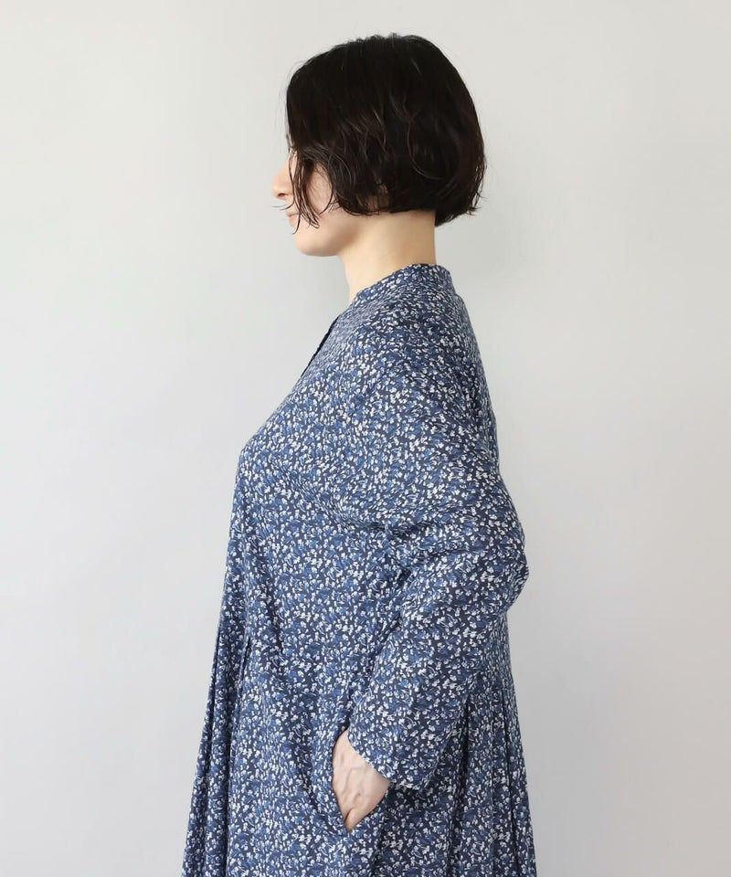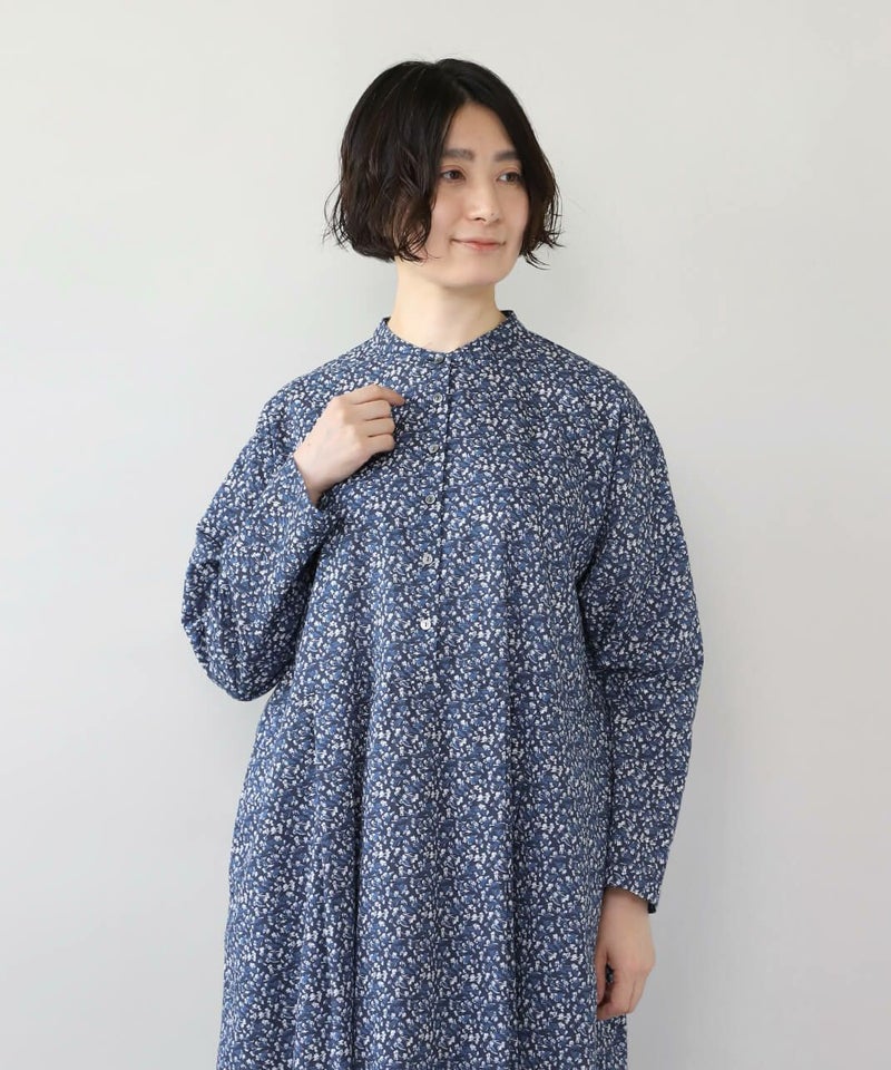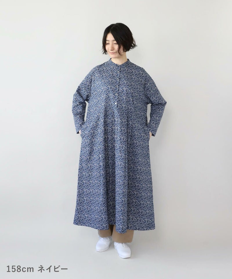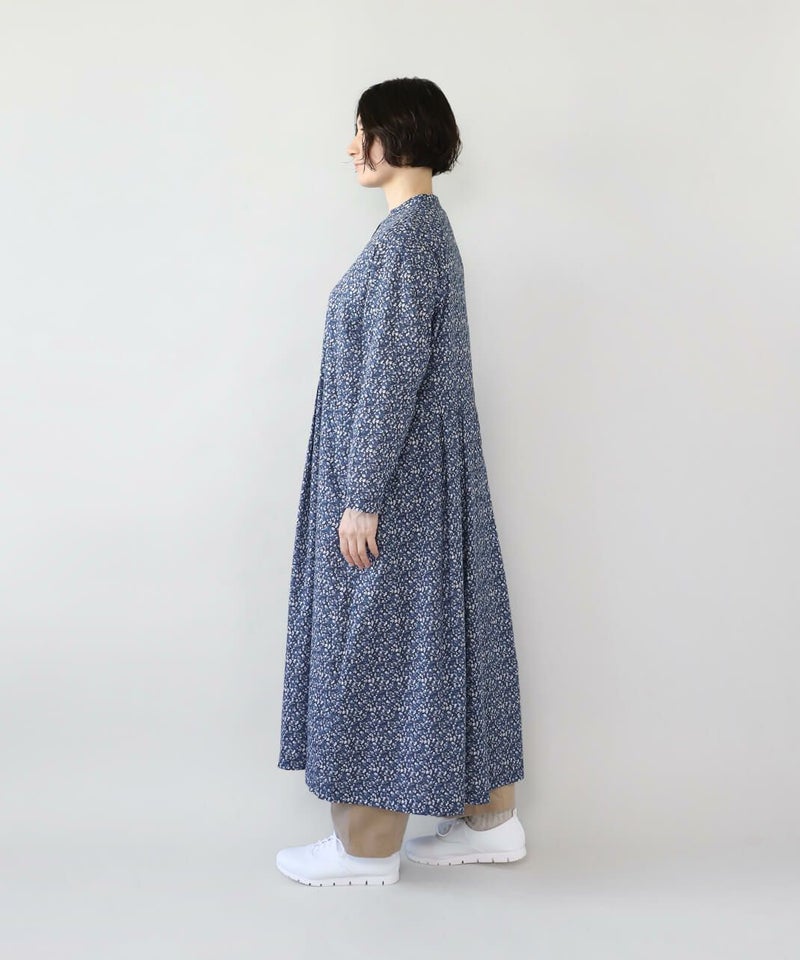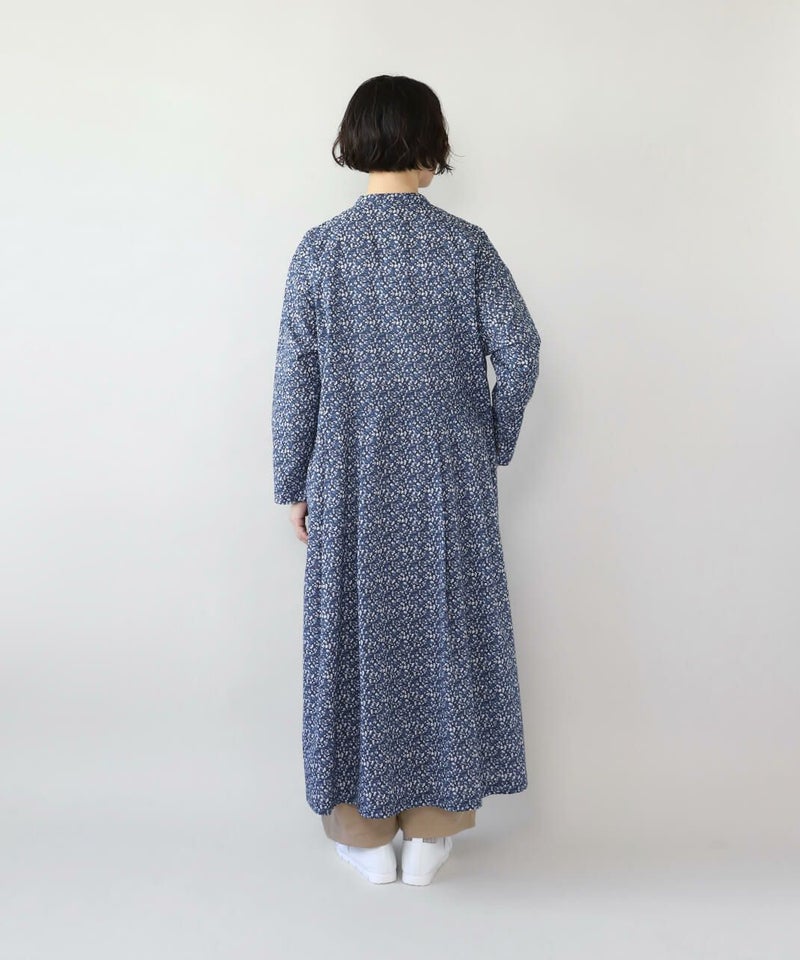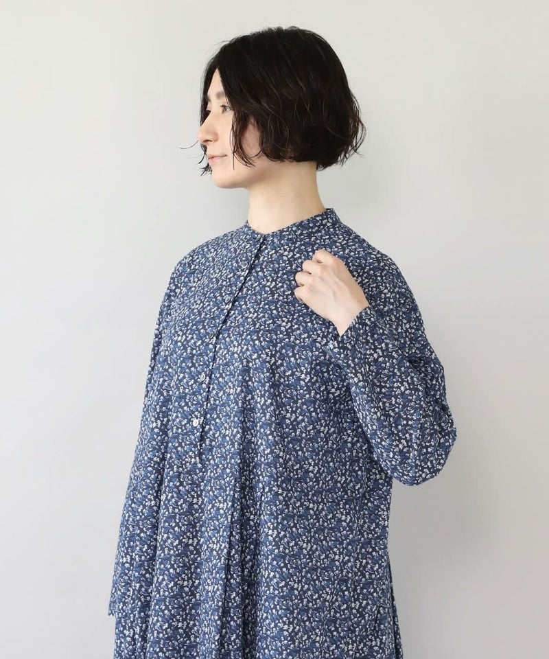 さらりとした薄手のコットンローン生地を使用した花柄のワンピースです。 シンプルなスタンドネックにウエストのタック切替えがやわらかくな曲線を描くシルエット。細やかなフラワープリントが上品でフェミニンな印象を演出してくれます。ウエストまでのフロントボタンはアクセントになります。袖口はスリットが入っているので、重ね着にもかさばらず着用できます。