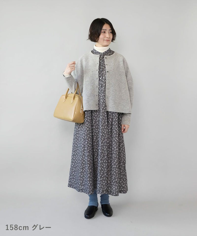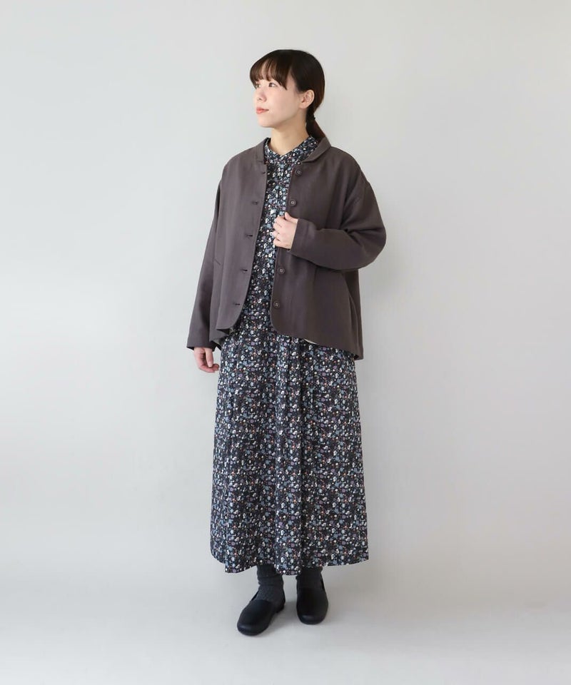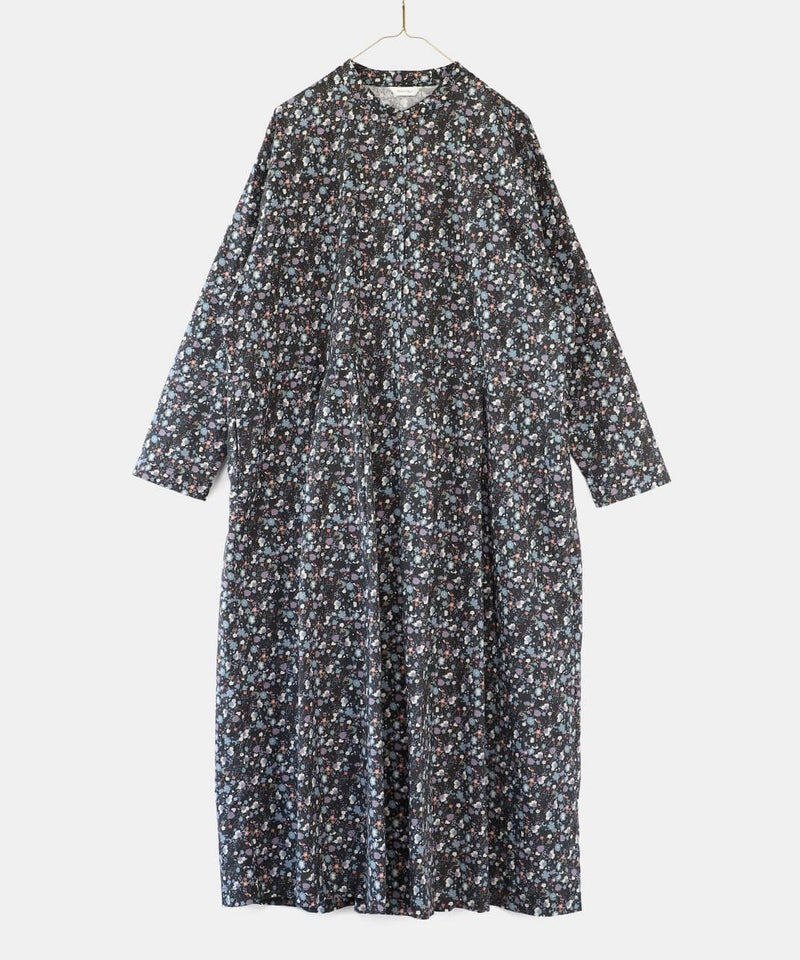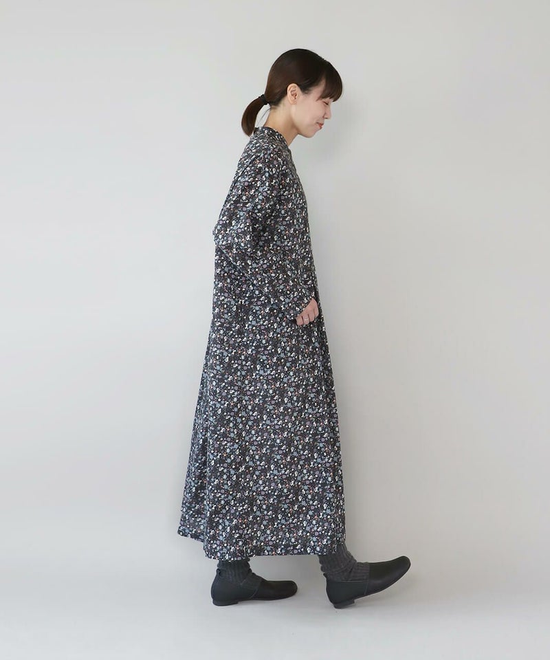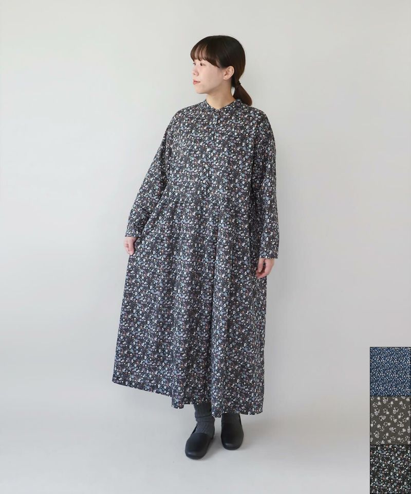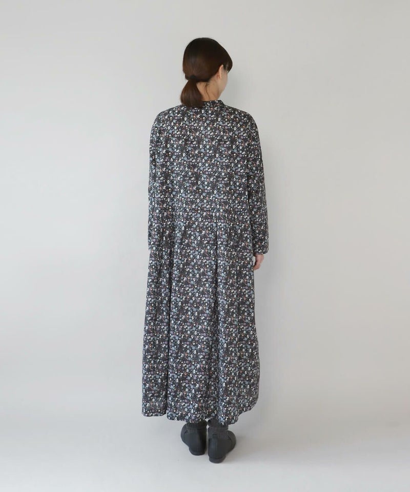さらりとした薄手のコットンローン生地を使用した花柄のワンピースです。 シンプルなスタンドネックにウエストのタック切替えがやわらかくな曲線を描くシルエット。細やかなフラワープリントが上品でフェミニンな印象を演出してくれます。ウエストまでのフロントボタンはアクセントになります。袖口はスリットが入っているので、重ね着にもかさばらず着用できます。