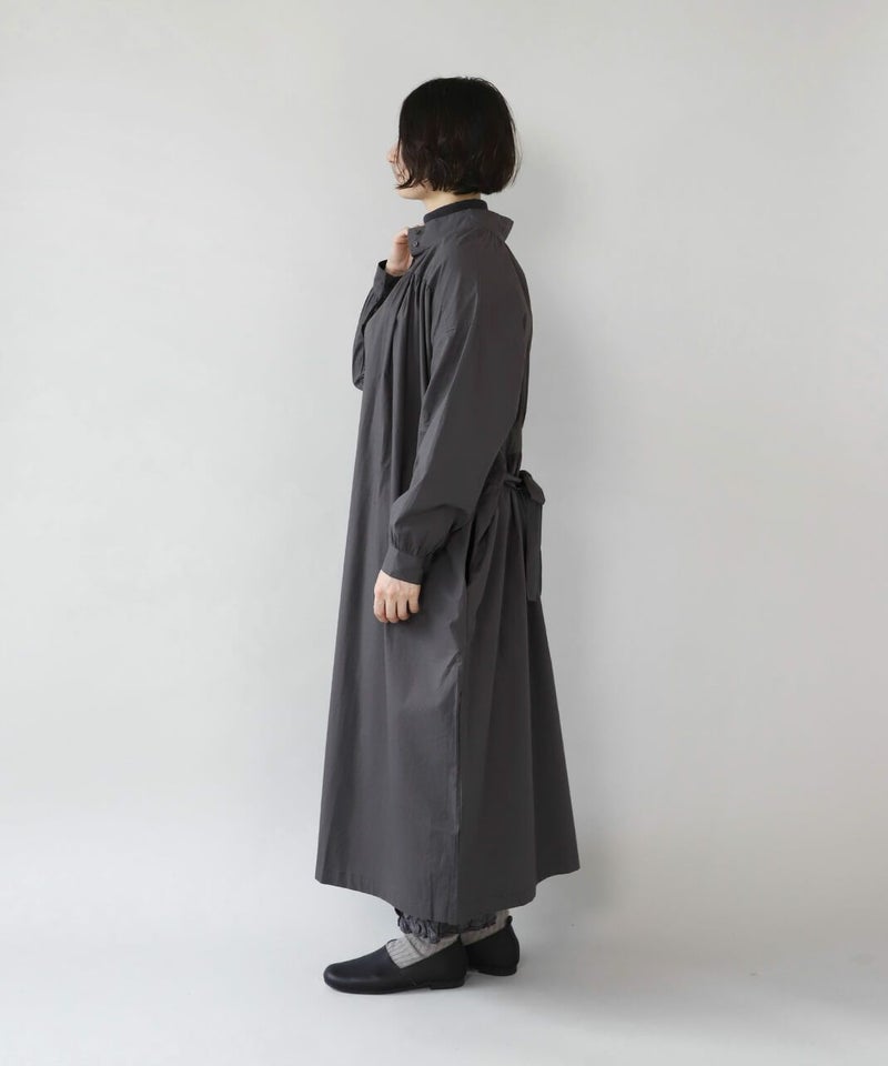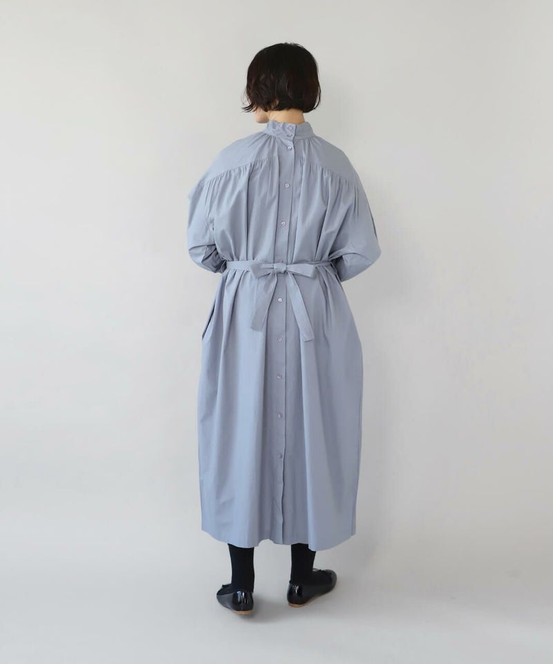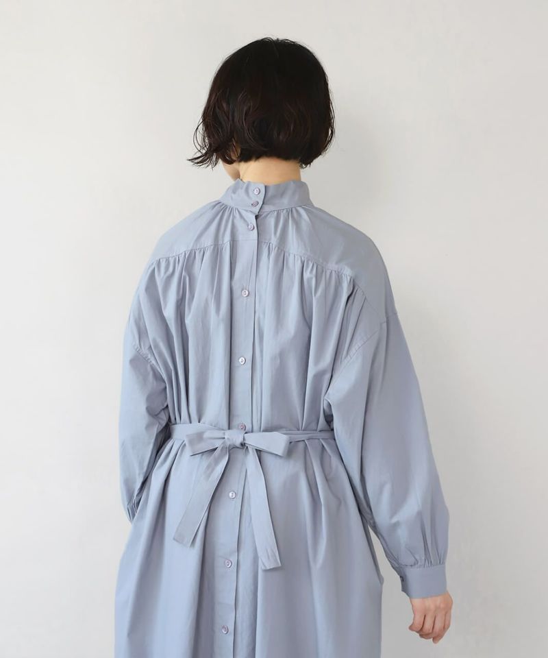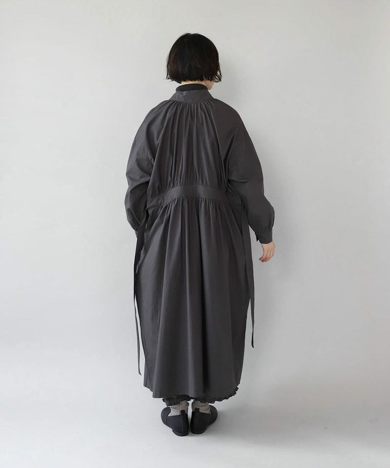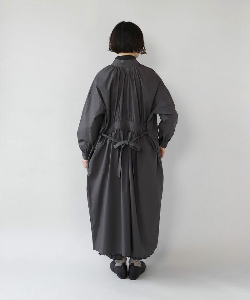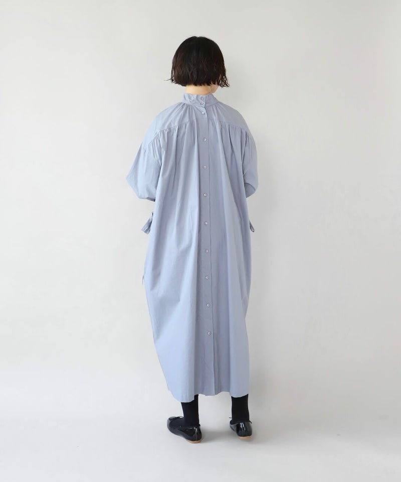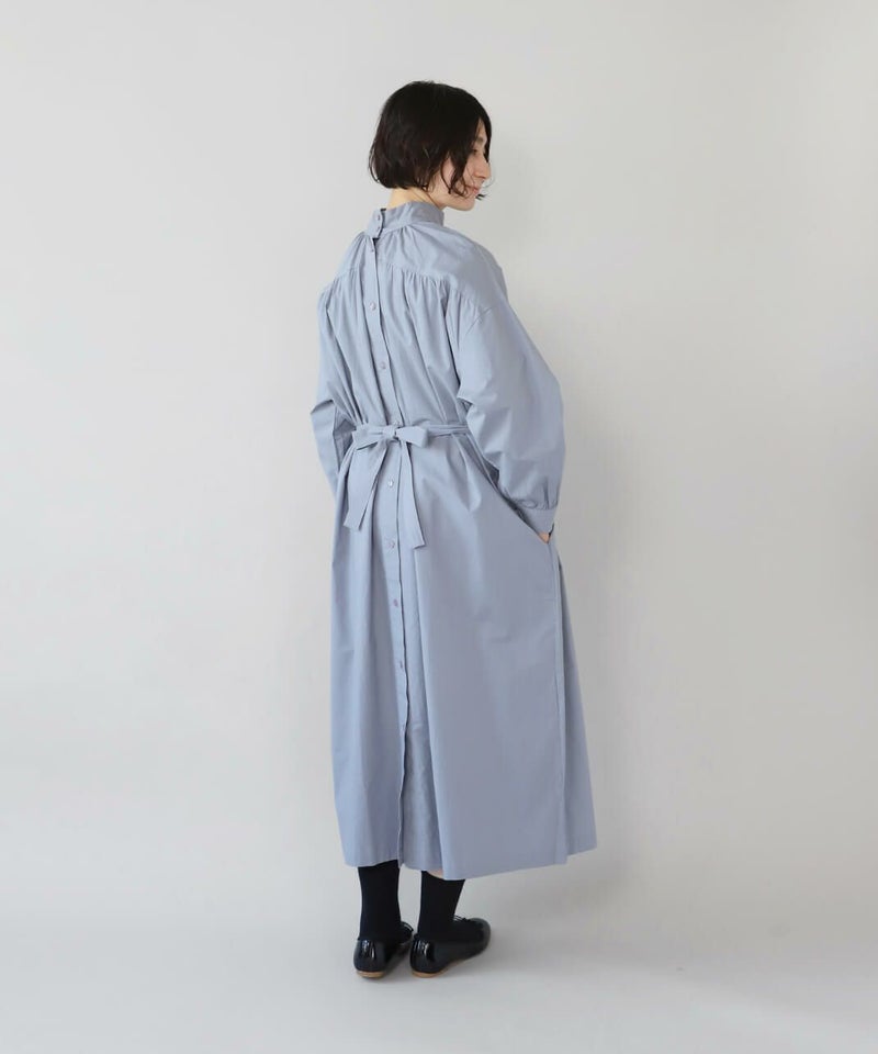 コットンポプリン素材を使用した2WAYハイネックワンピース。 ミリタリーのサージカルガウンから着想を得たデザインで、ボタンを前後に着用可能な2WAY仕様です。 前後の印象に加えてリボンがあるので、数パターンのシルエットの変化を楽しめます。 ベストやニット、カーディガンとも合わせやすく、羽織りにもおすすめです。