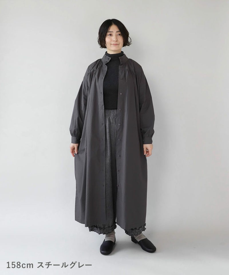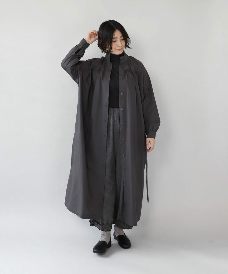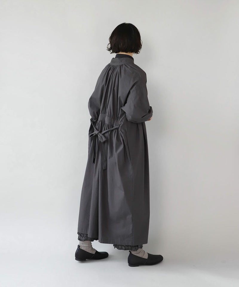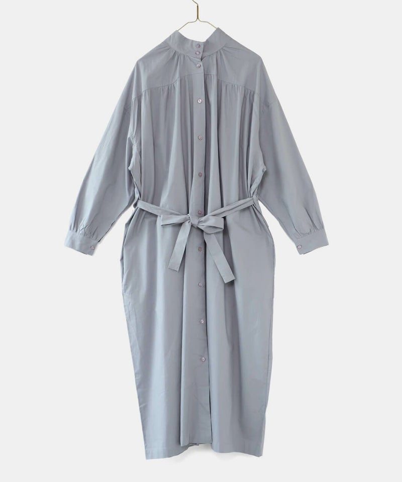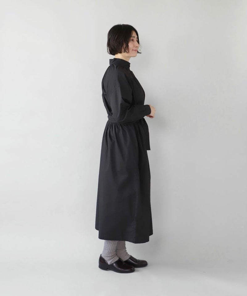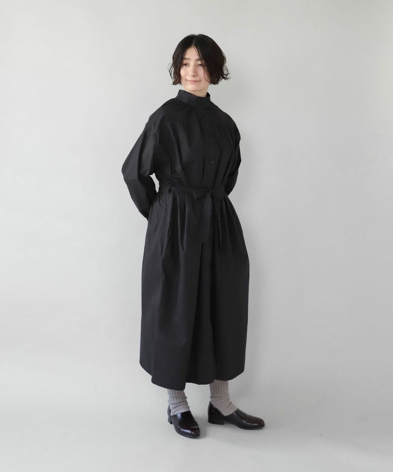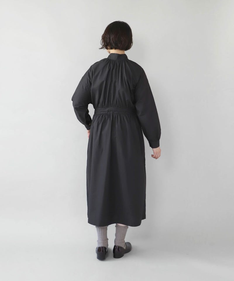 コットンポプリン素材を使用した2WAYハイネックワンピース。 ミリタリーのサージカルガウンから着想を得たデザインで、ボタンを前後に着用可能な2WAY仕様です。 前後の印象に加えてリボンがあるので、数パターンのシルエットの変化を楽しめます。 ベストやニット、カーディガンとも合わせやすく、羽織りにもおすすめです。