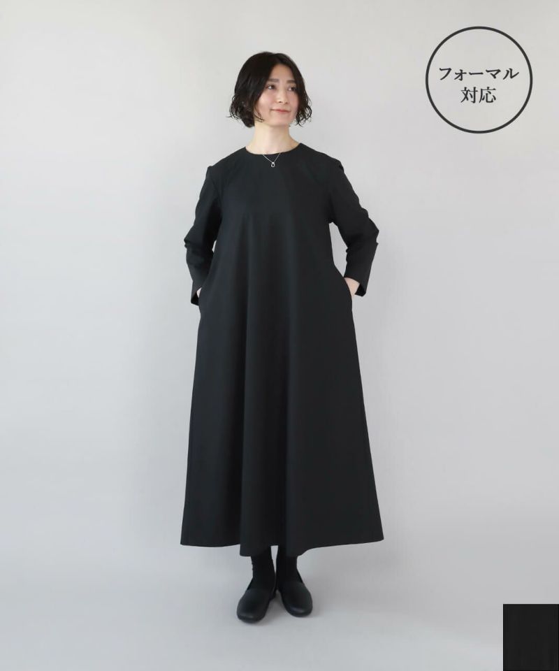 しなやかな肌触りと光沢感のあるポリエステルとレーヨンをミックスした素材を使用したワンピースです。前はシンプルなクルーネックに綺麗なフレアシルエット、後ろは大きめなプリーツが際立つフォーマルな1着です。腰付近まで下りる後ろのファスナーが便利で脱着が簡単。脇のスラッシュポケットは実用性も兼ね備えています。ジャケットを合わせて着用するのもおすすめです。